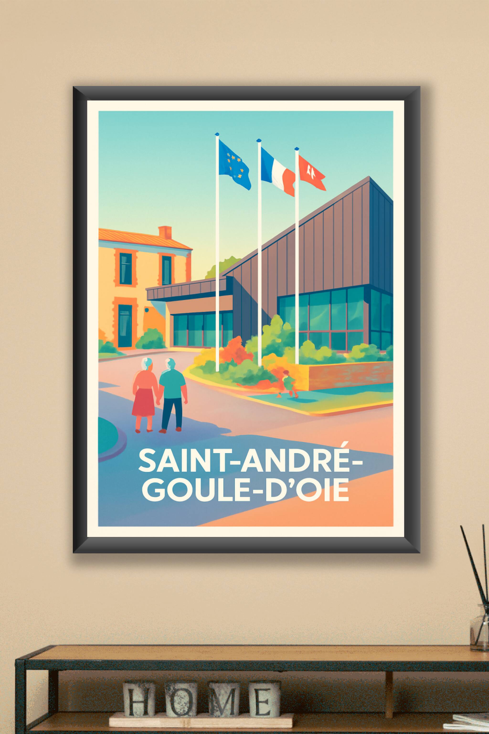 Découvrez cette affiche illustrée qui capture l'ambiance calme et contemporaine de Saint-André-Goule-d'Oie, mêlant architecture moderne et douceur de vivre. Ce poster met en avant un lieu symbolique de la commune, avec des détails subtils comme les drapeaux flottant au vent et la présence harmonieuse des habitants.Ce tirage "Fine Art" bénéficie d'une impression sur papier 305g coton, garantissant une qualité d'image exceptionnelle et un rendu des couleurs éclatant. Disponible du format A1 au format A4, avec ou sans cadre, cette affiche est idéale pour apporter une touche d'élégance et d'authenticité à votre décoration intérieure. Profitez d'un produit 100% fabriqué en France, parfait pour offrir ou embellir votre espace.