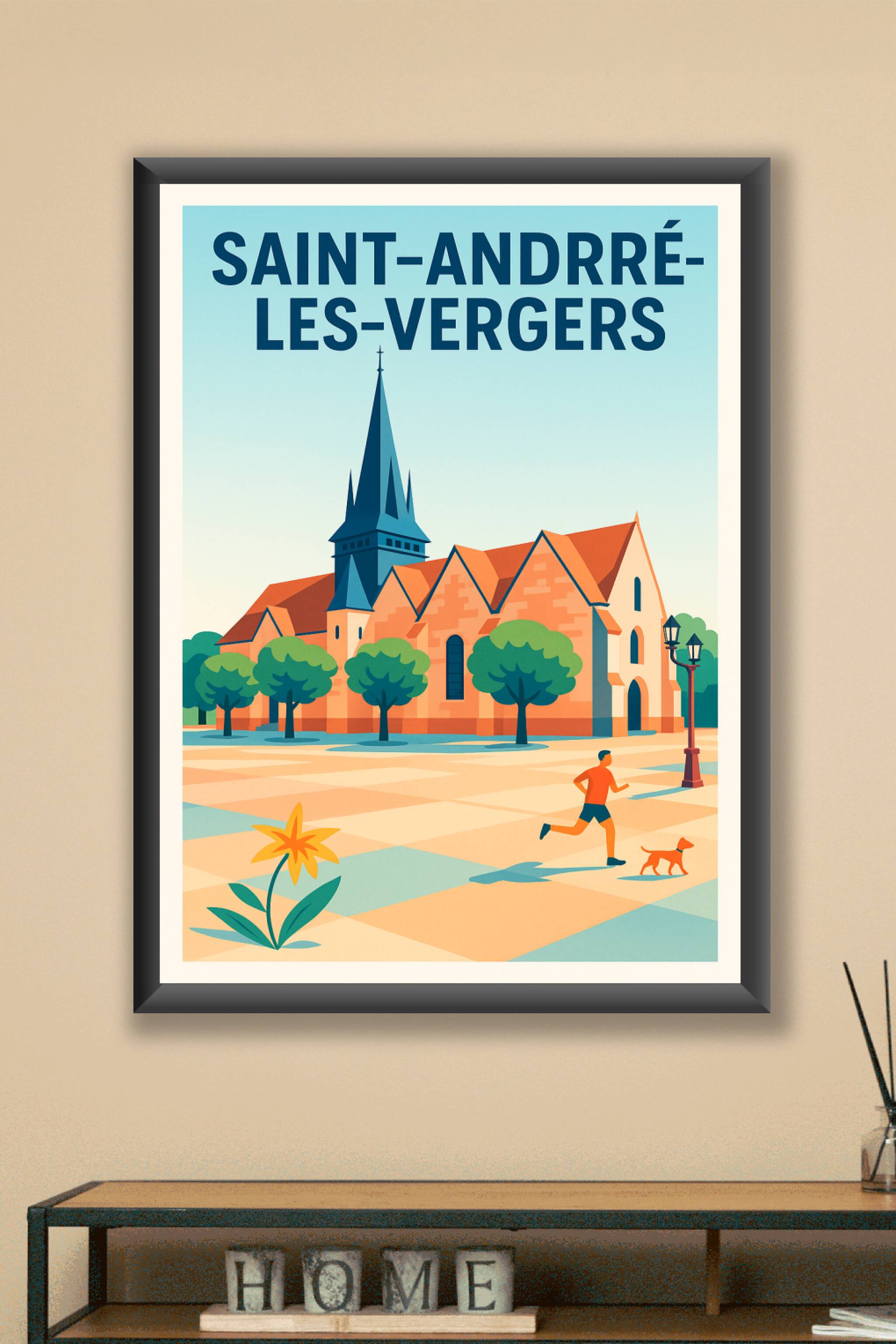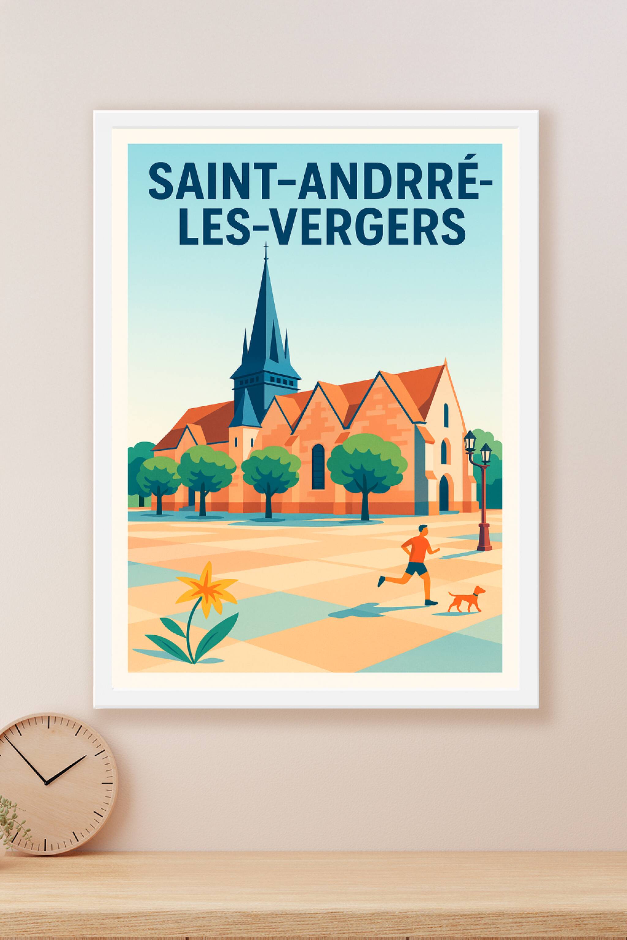 Découvrez l'élégance intemporelle de Saint-André-les-Vergers avec cette affiche illustrée mettant en scène un lieu emblématique baigné d'une douce ...