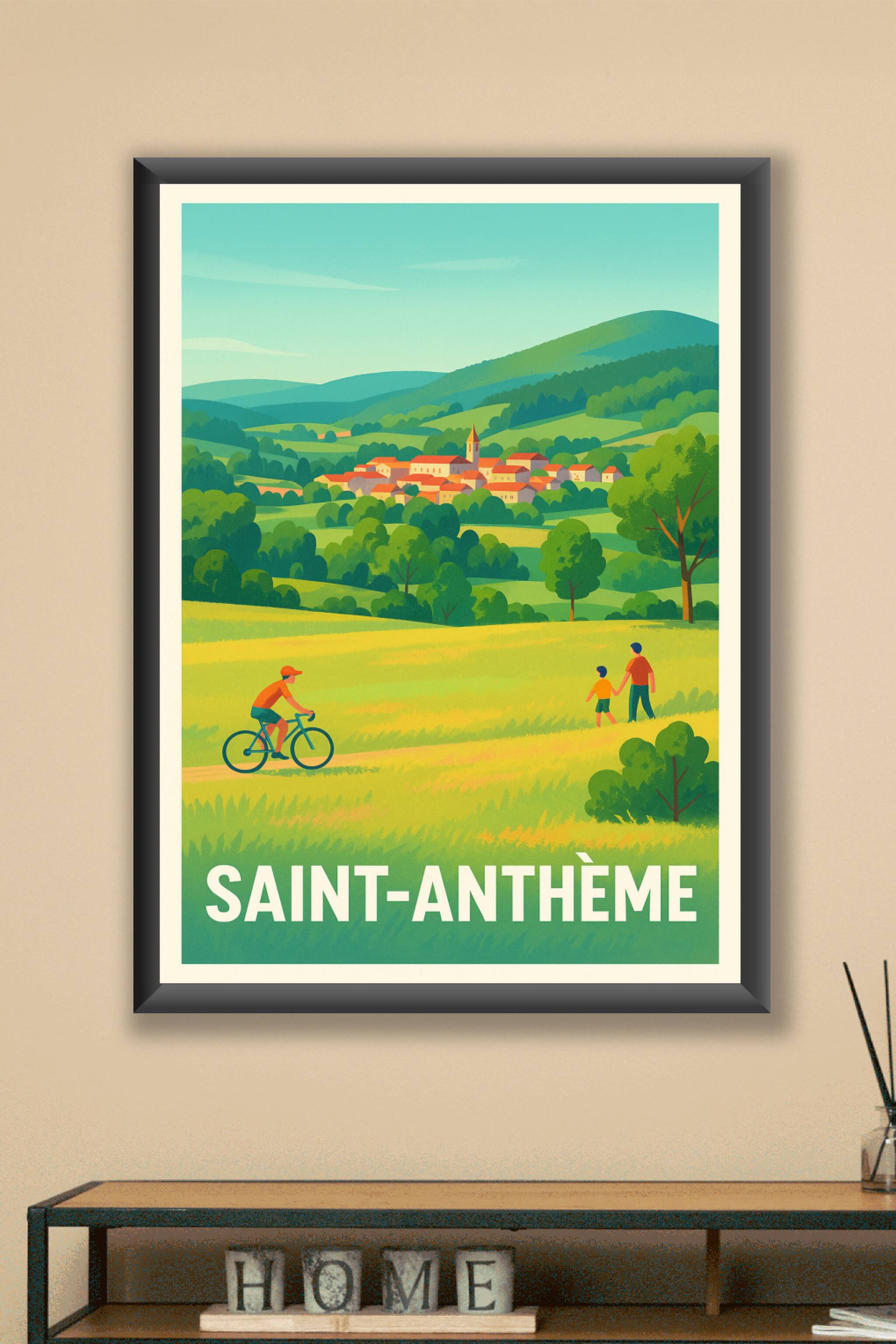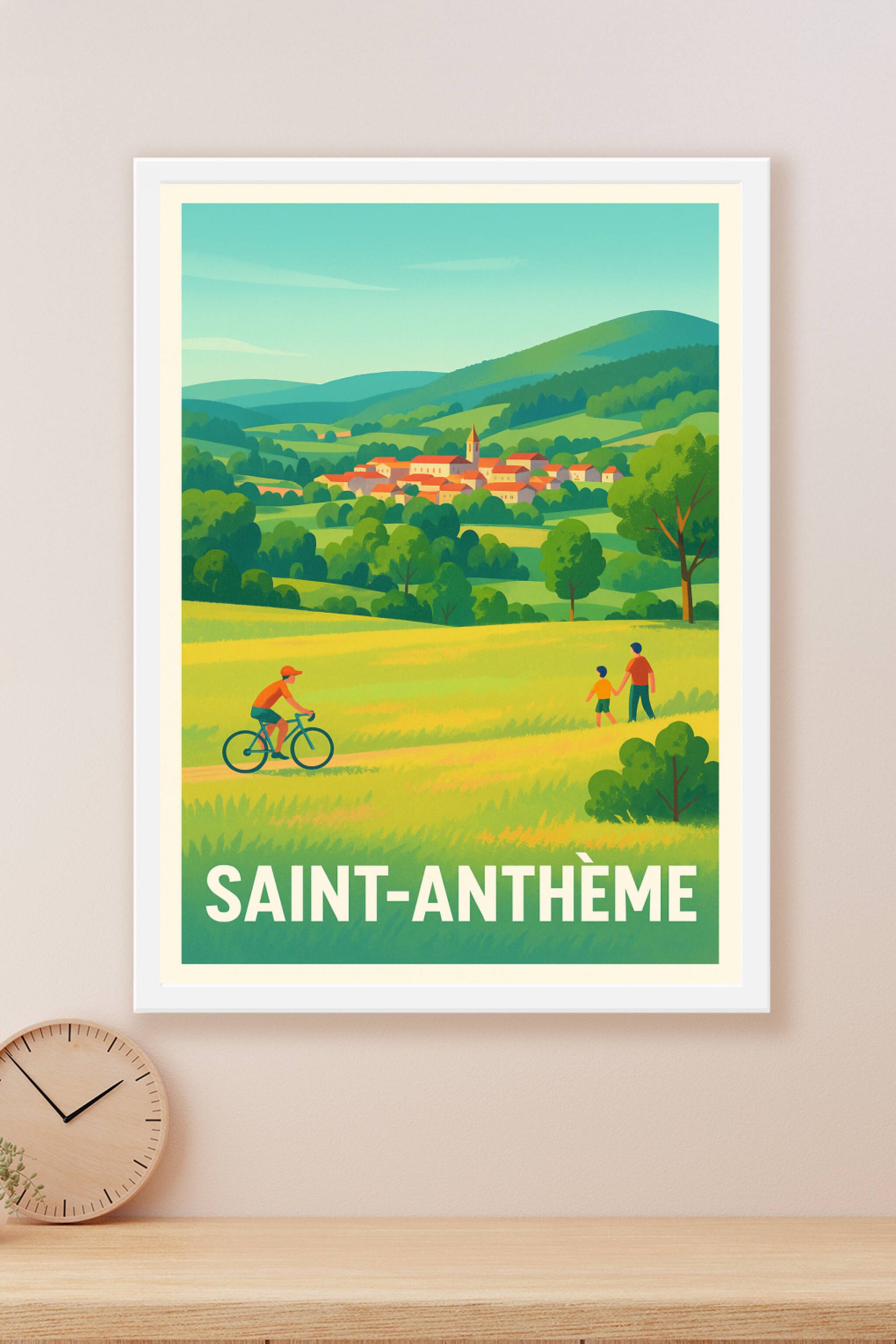 Découvrez la douceur de vivre à Saint-Anthème avec cette affiche illustrée aux couleurs chaudes et apaisantes. On y admire un village pittoresque niché au cœur de collines verdoyantes, baigné de lumière estivale, où cyclistes et promeneurs savourent la nature paisible. Cette affiche de qualité premium est imprimée en tirage "Fine Art" sur papier 305g coton pour une finesse et une longévité exceptionnelles. Disponible en formats A1 à A4, avec ou sans cadre, ce poster apportera une touche de sérénité champêtre et une ambiance chaleureuse à votre décoration intérieure. Profitez d'une impression française soignée pour offrir ou décorer avec élégance.