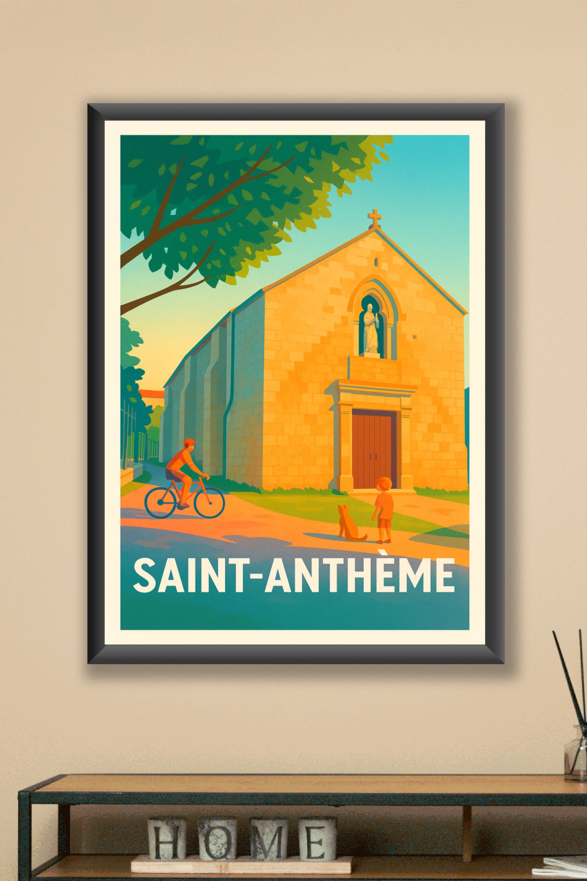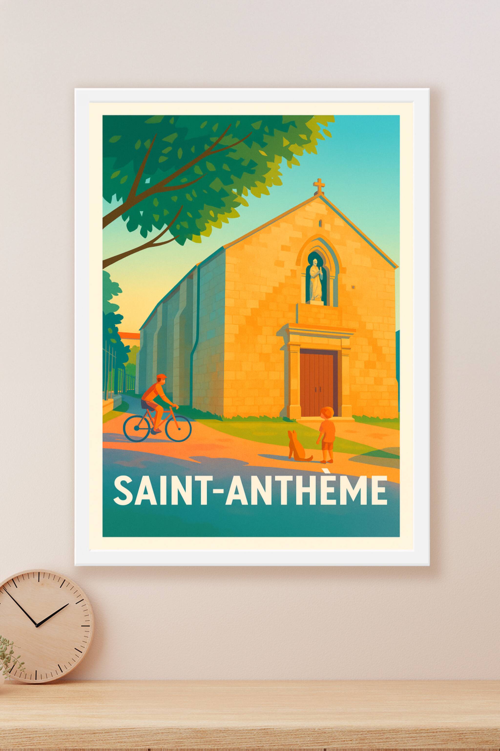 Découvrez l'atmosphère paisible et chaleureuse de Saint-Antheme avec cette affiche illustrée mettant en avant un édifice historique baignés par la ...