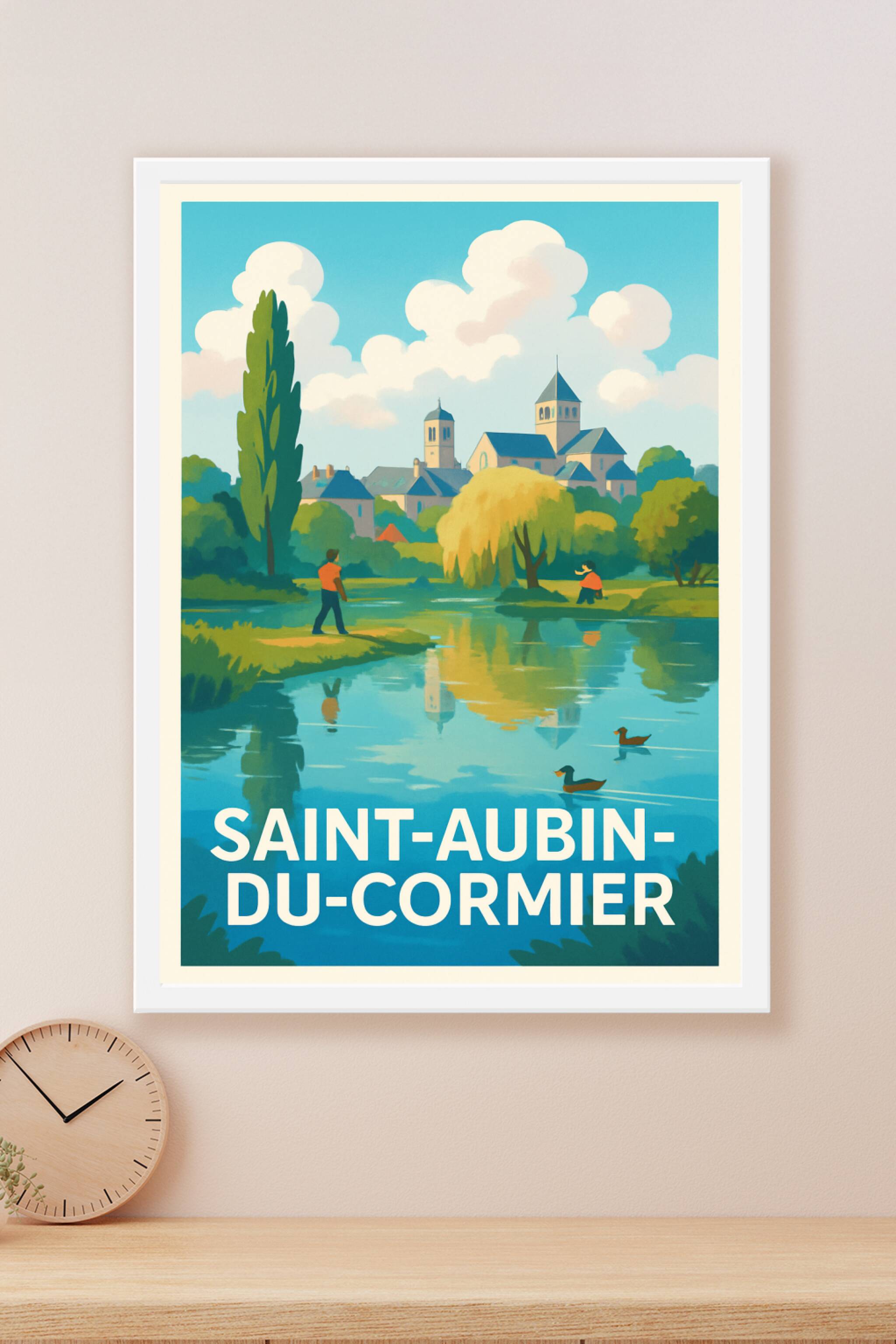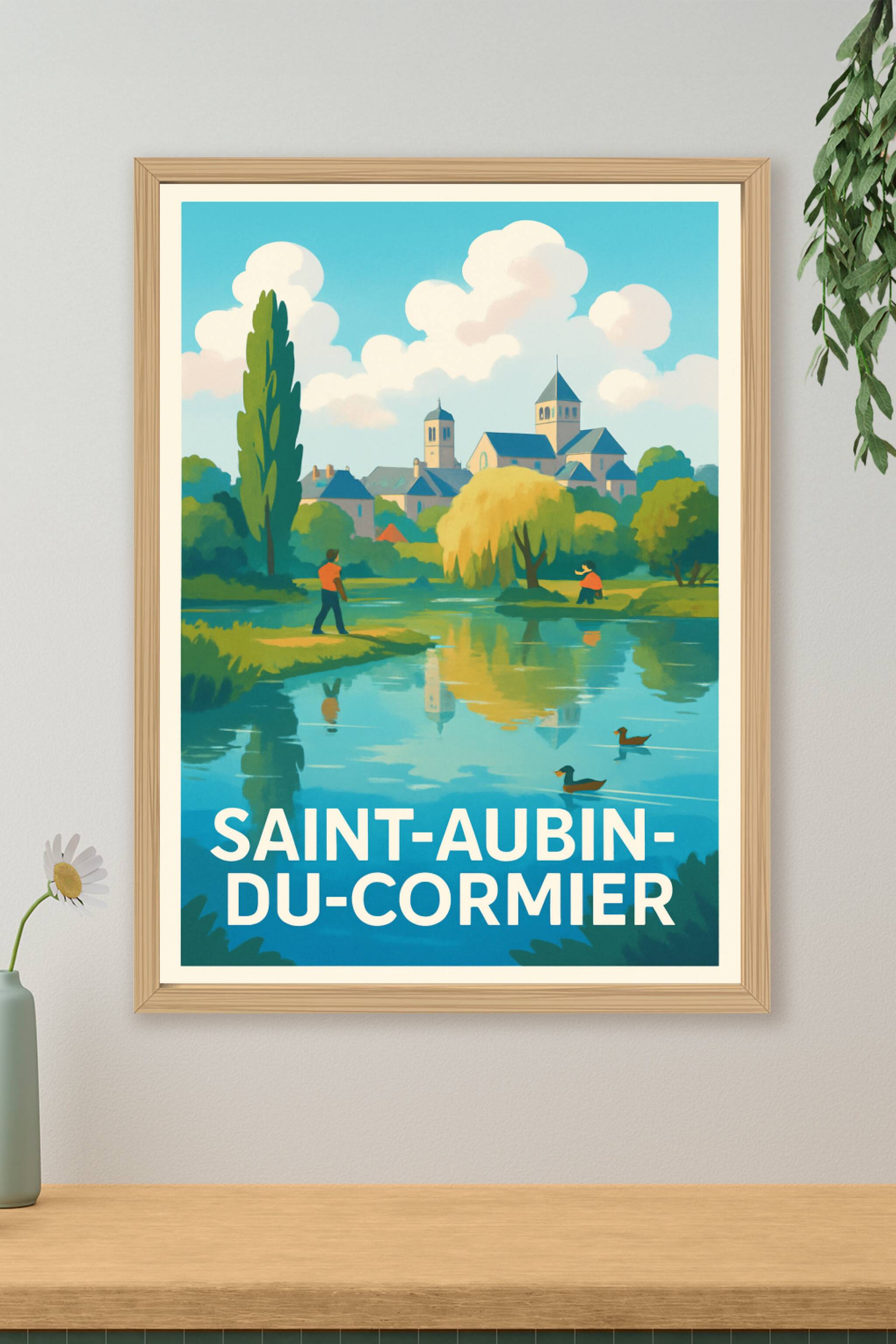 Découvrez la douceur de vivre à Saint-Aubin-du-Cormier avec ce poster illustré aux couleurs apaisantes et à l'ambiance bucolique. Ce paysage, où la nature rencontre l'architecture historique, se reflète magnifiquement dans l'eau calme avec des personnages profitant d'un moment de détente.Cette affiche de qualité premium est imprimée en tirage "Fine Art" sur un papier 305g coton offrant une tenue et une profondeur des couleurs remarquables. Disponible en formats A1 à A4, avec ou sans cadre, ce poster saura embellir votre intérieur ou devenir un cadeau unique pour les amateurs de belles illustrations et de la région.Vivez la qualité d'une impression 100% réalisée en France et apportez une touche lumineuse et relaxante à votre décoration murale.