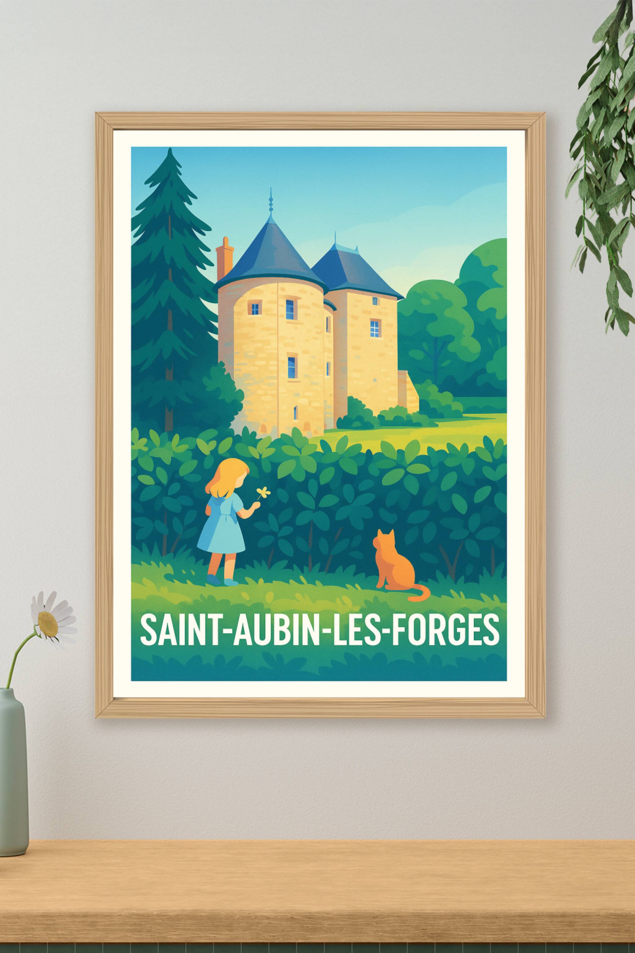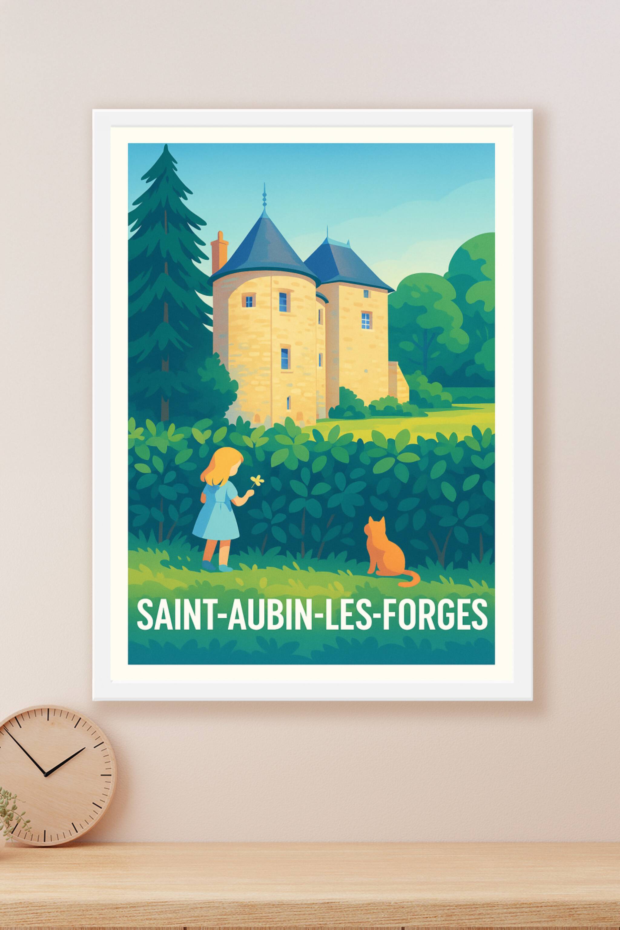 Découvrez l'élégance paisible de Saint-Aubin-les-Forges avec cette affiche illustrée représentant un château emblématique baigné de lumière douce, ...