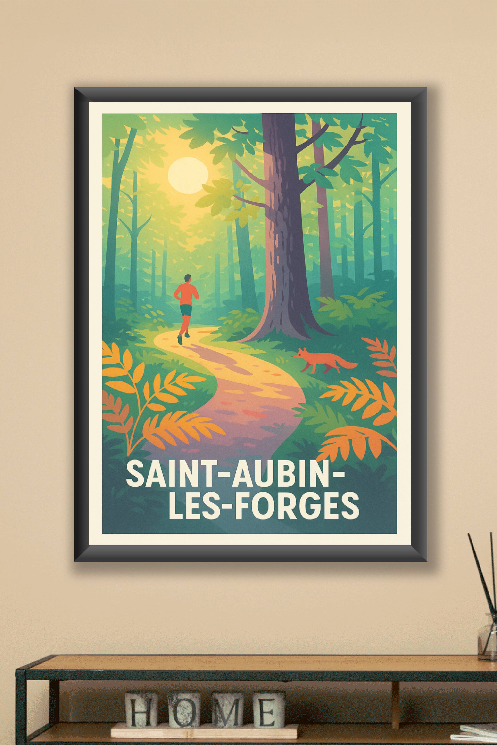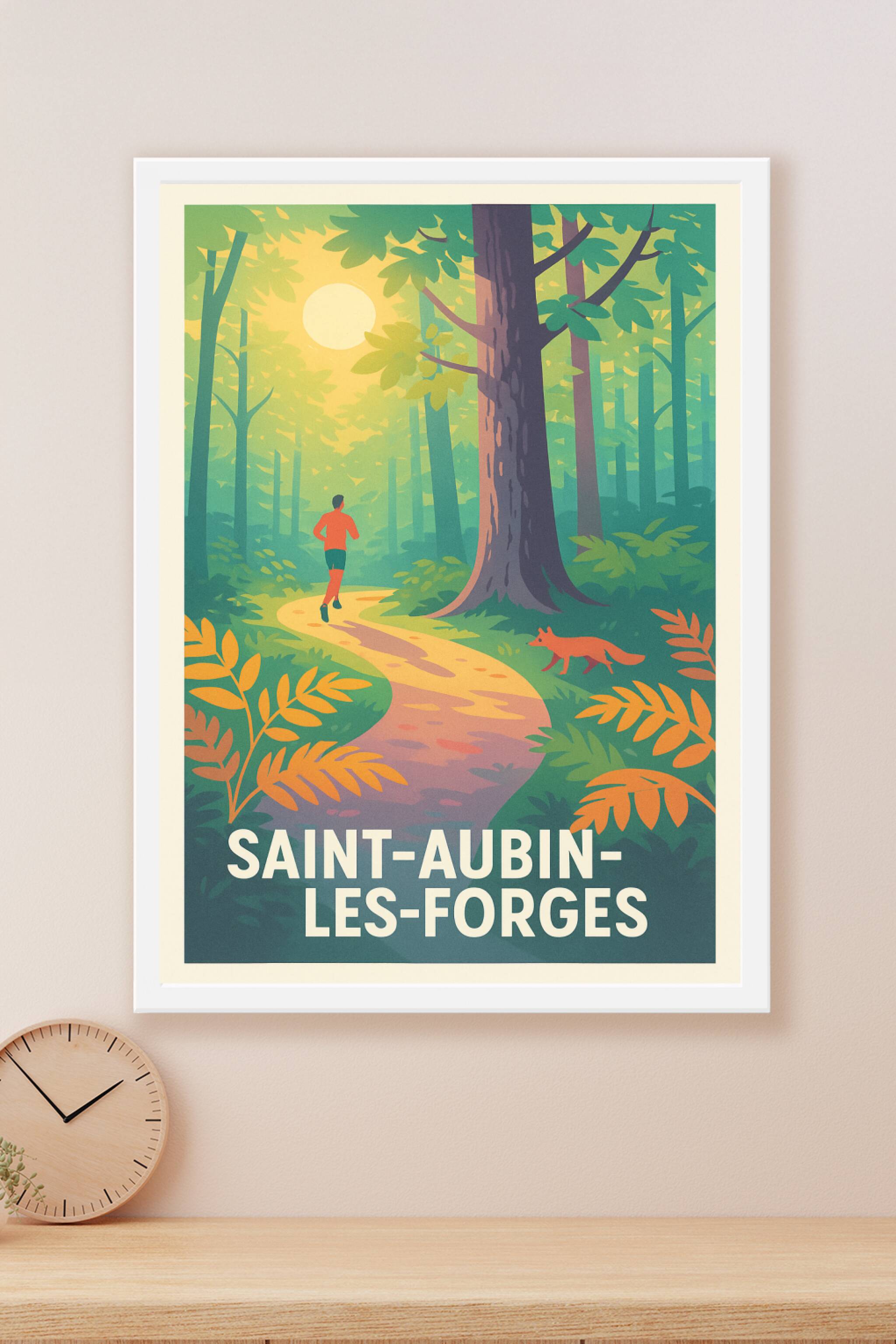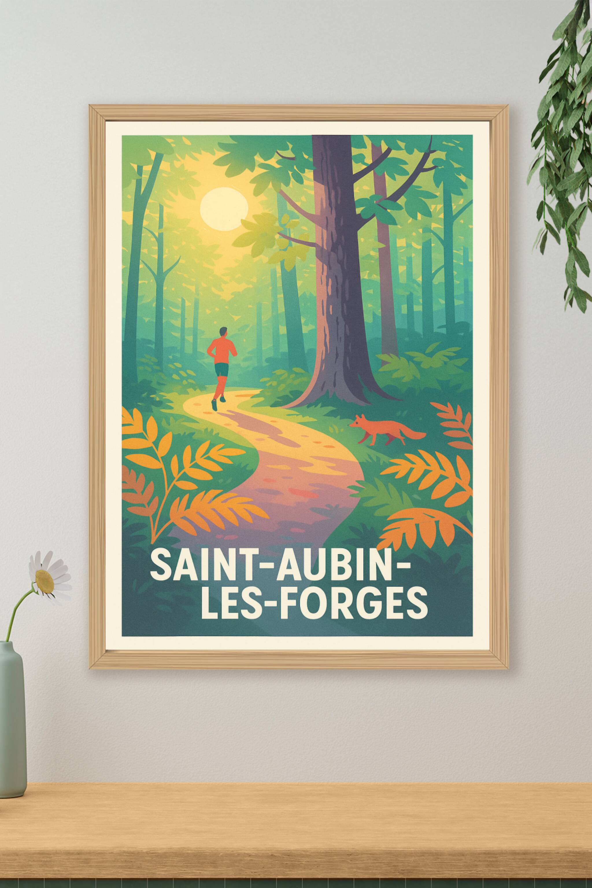 Découvrez la sérénité et la fraîcheur de la forêt de Saint-Aubin-les-Forges avec cette affiche au style rétro et aux couleurs apaisantes. Ce poster...
