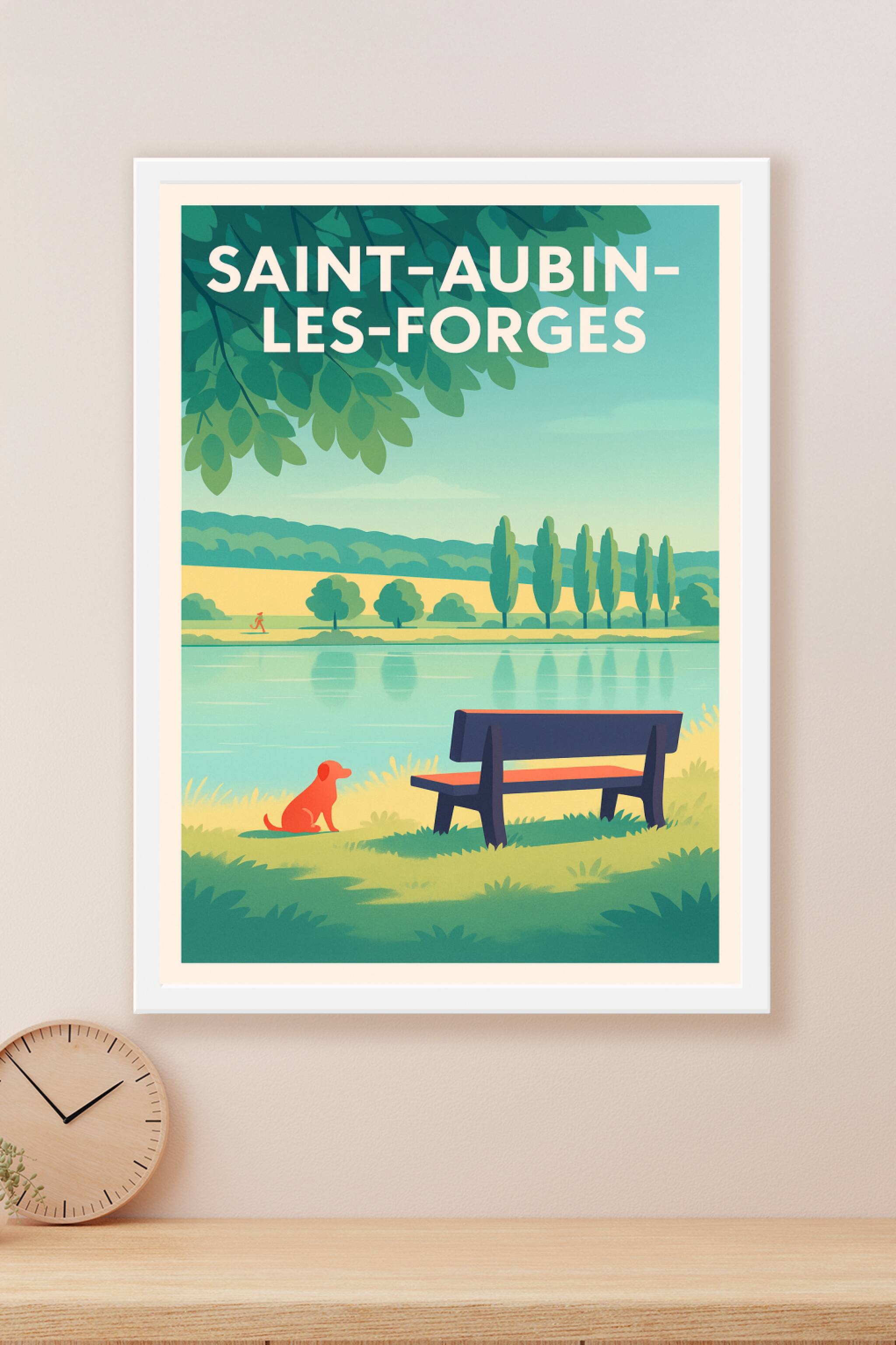 Découvrez la douceur de vivre de Saint-Aubin-Les-Forges avec cette affiche inspirante illustrant un paysage paisible au bord de l'eau. Un banc et u...
