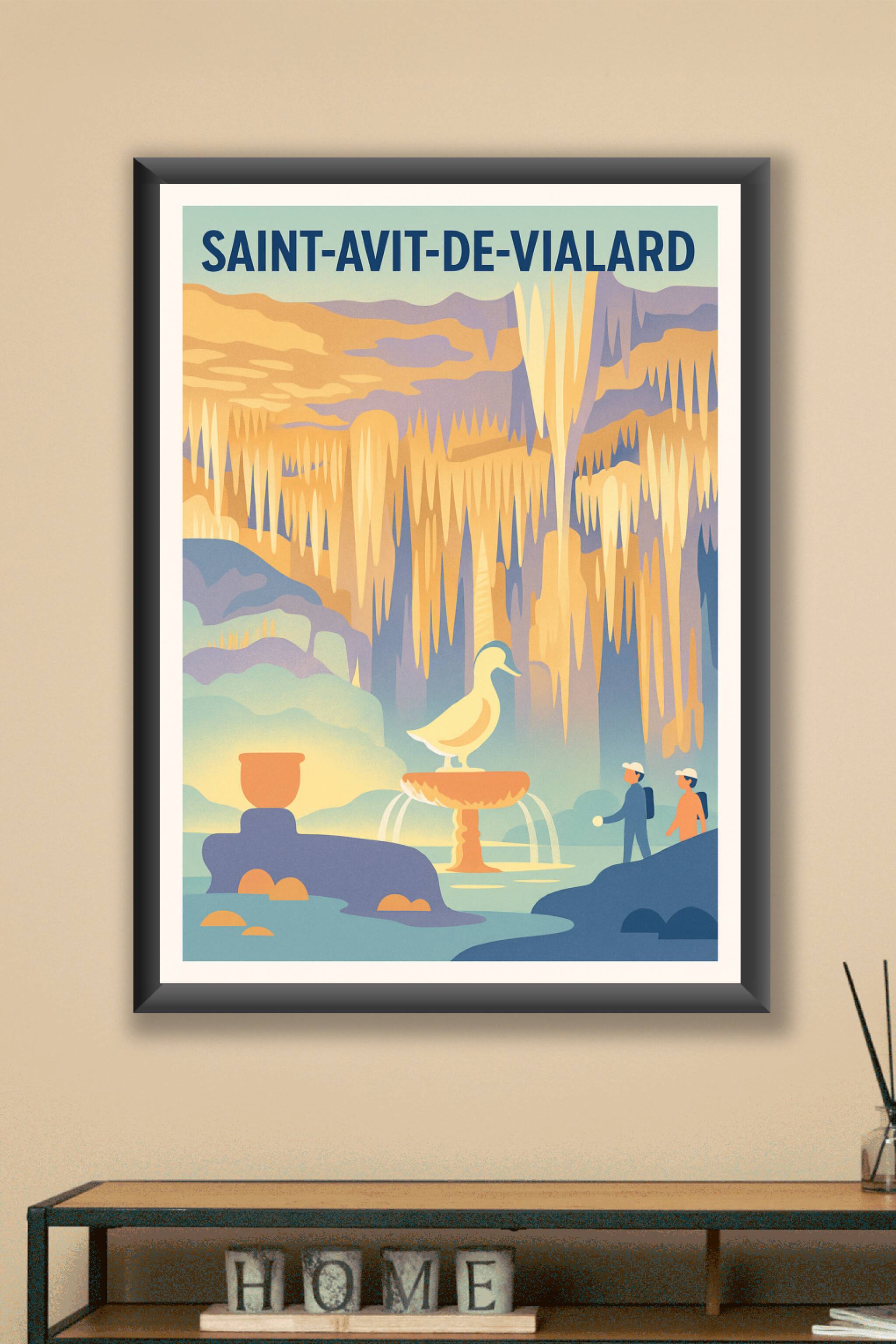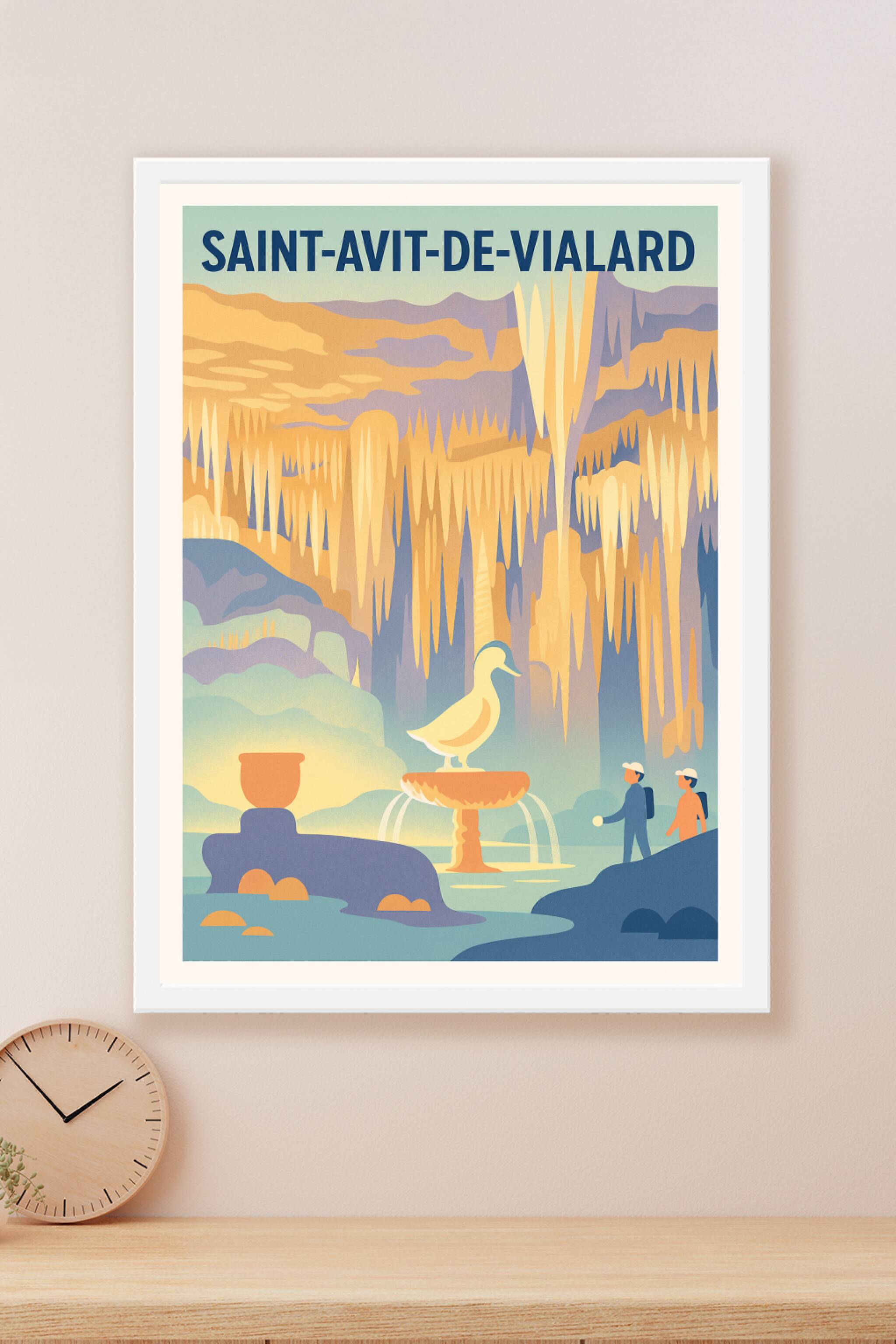 Découvrez la magie des grottes de Saint-Avit-de-Vialard avec cette affiche au style rétro et coloré, mettant en scène les célèbres stalactites et l...