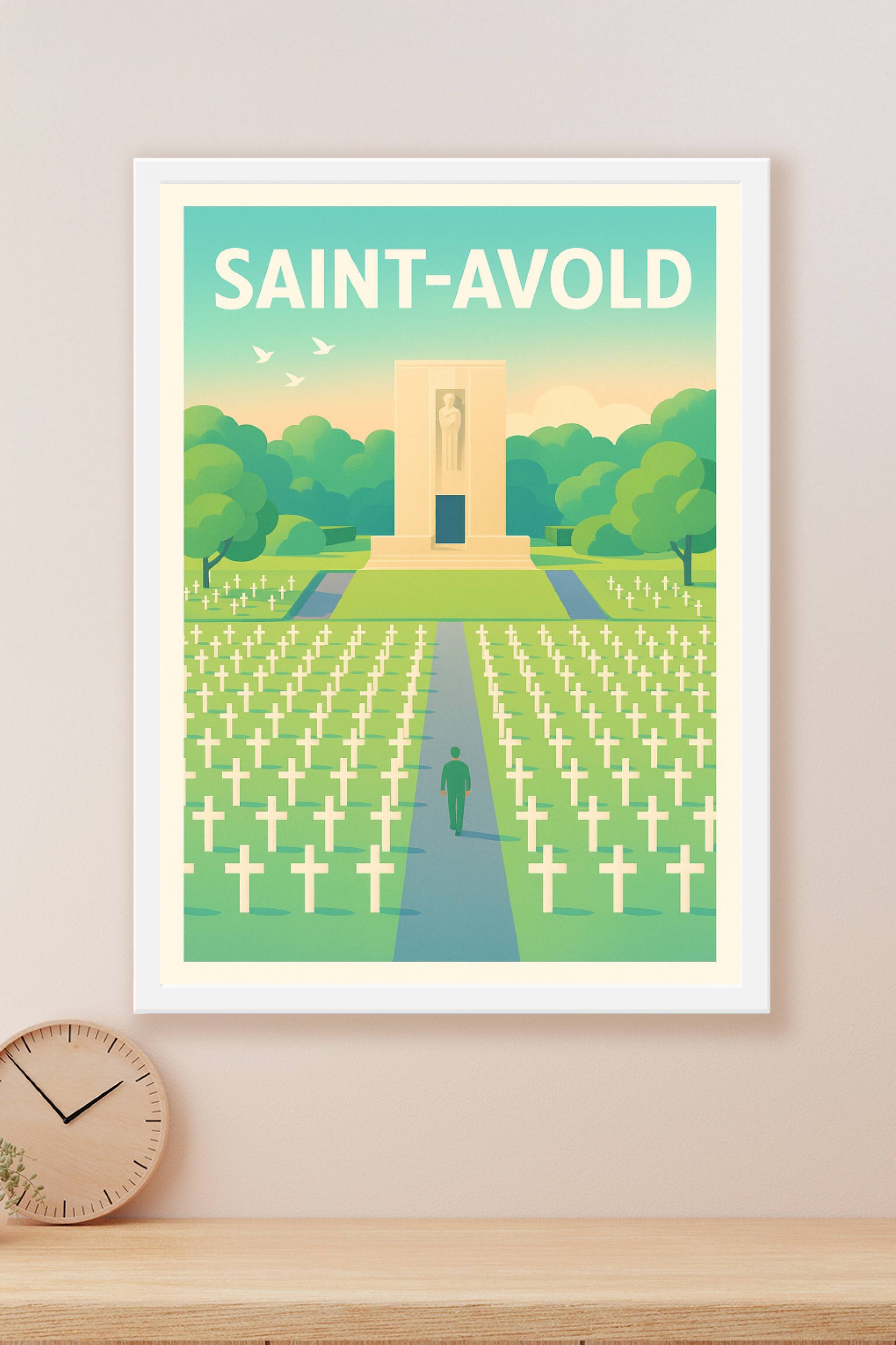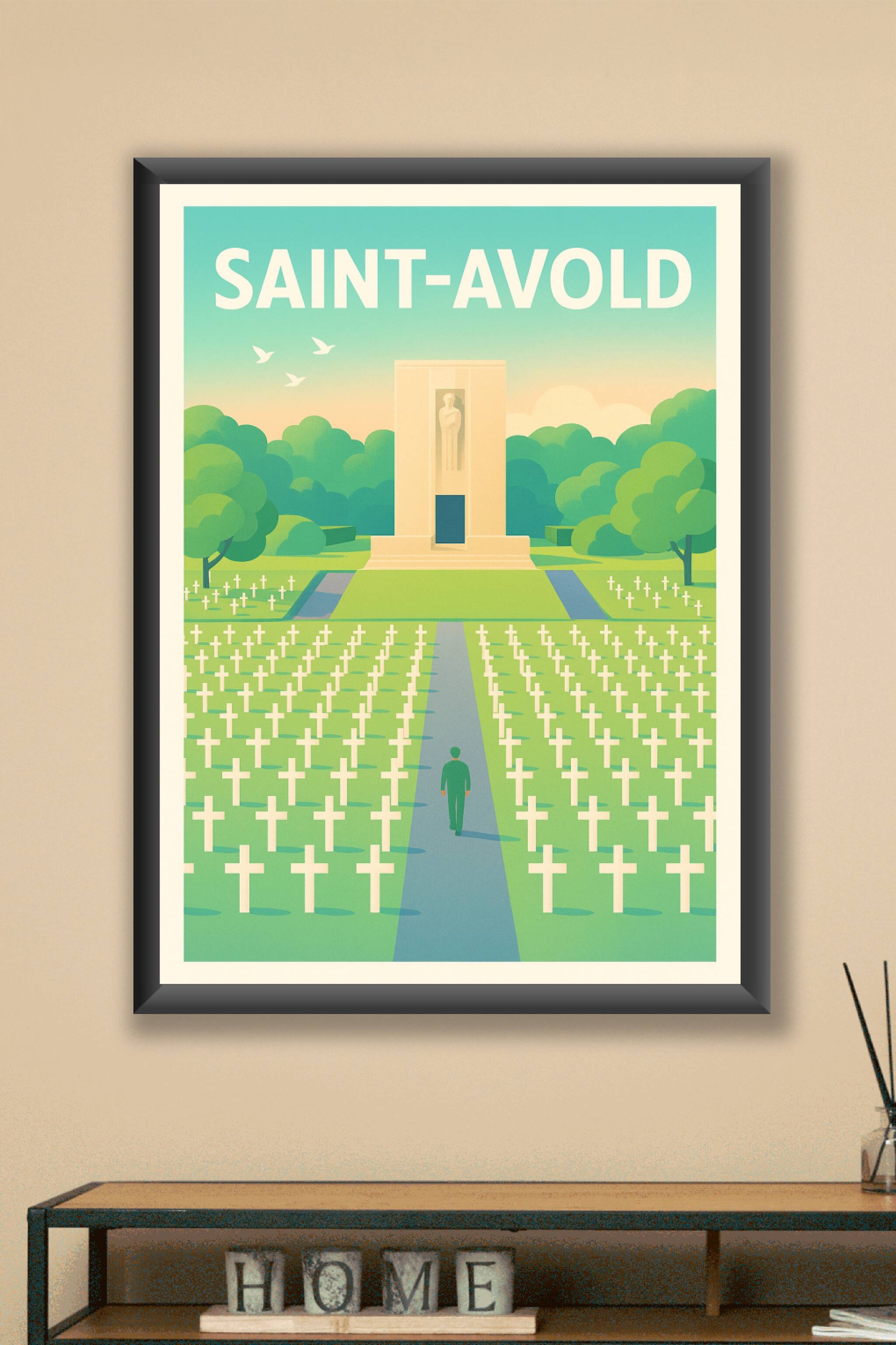 Revivez un moment empreint de respect et de recueillement avec cette affiche illustrée représentant le cimetière militaire de Saint-Avold, un lieu chargé d'histoire et de mémoire. Le poster met en lumière la perspective paisible des nombreuses croix blanches bordant une allée menant à un mémorial, dans un cadre verdoyant et apaisant.Disponible en tirage "Fine Art" premium, cette affiche est imprimée sur un papier 305g coton qui garantit une qualité d'impression exceptionnelle, avec des couleurs lumineuses et un rendu durable. Vous pouvez choisir parmi les formats A1 à A4, avec ou sans cadre, pour s'adapter parfaitement à votre intérieur ou votre espace de travail.Apportez une touche à la fois élégante et symbolique à votre décoration, ou offrez un cadeau plein de sens aux passionnés d'histoire et aux amateurs d'art. Chaque poster est conçu avec un soin artisanal en France, pour une finition irréprochable.