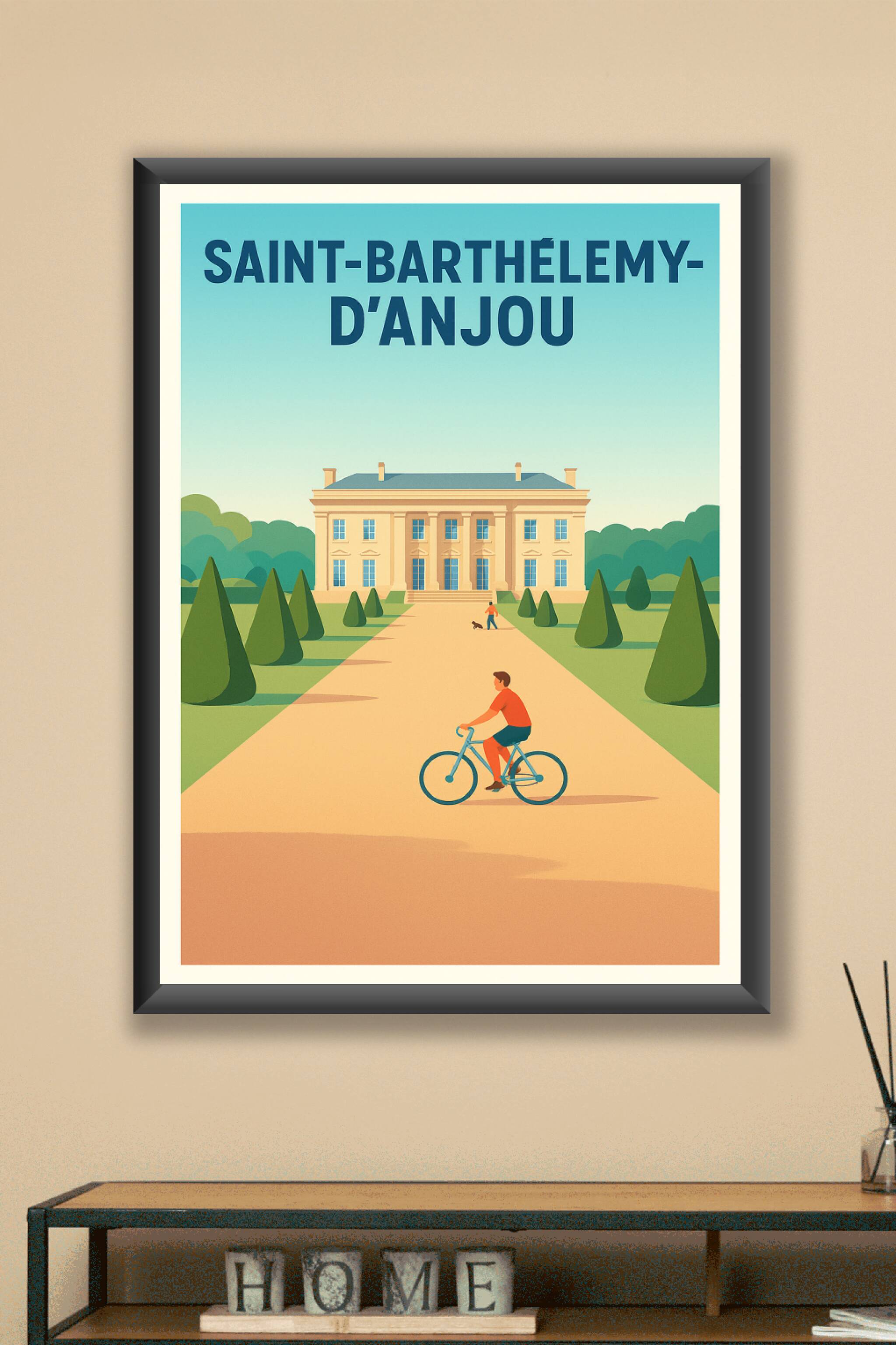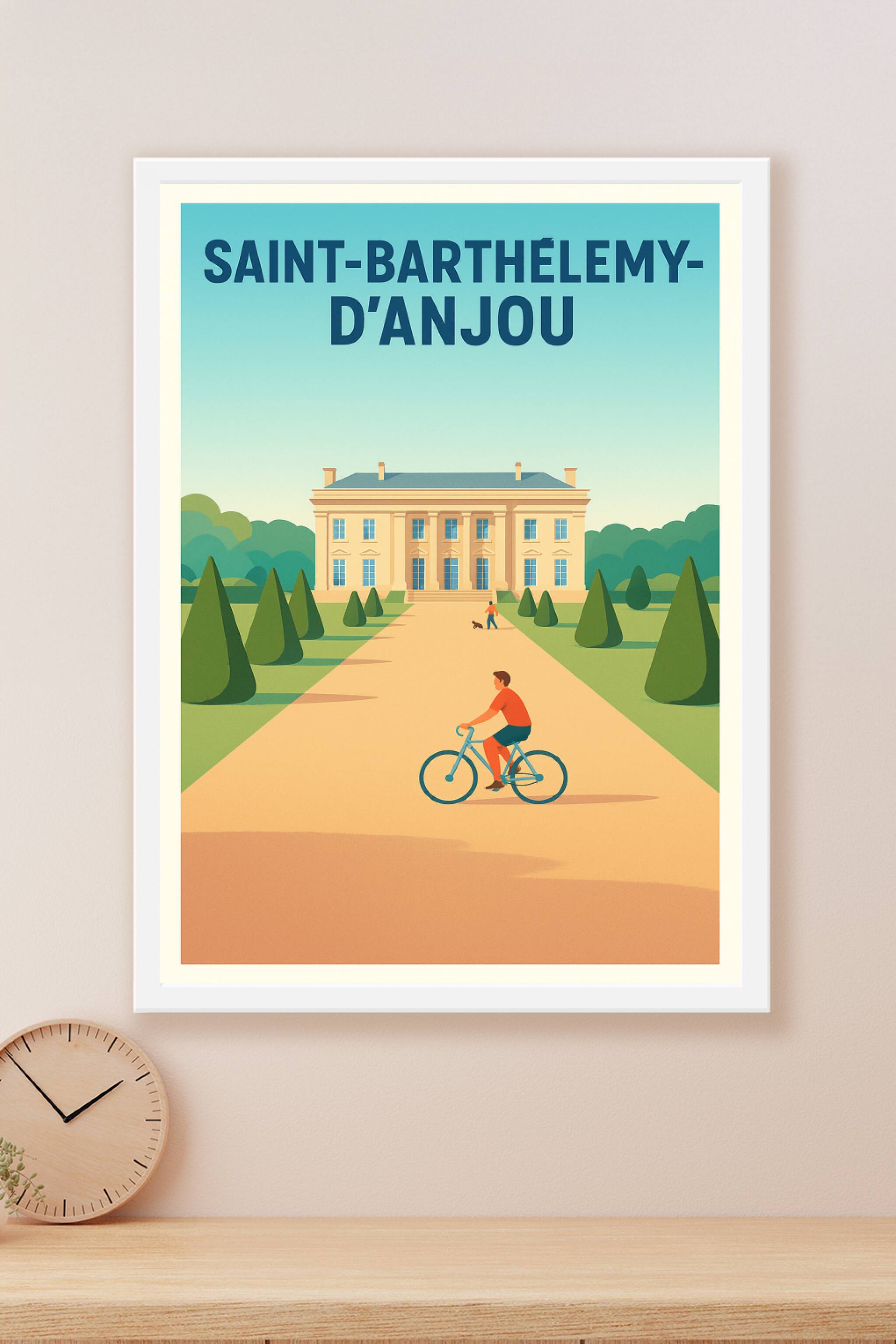 Découvrez le charme raffiné de Saint-Barthélemy-d'Anjou avec cette affiche illustrant une scène tranquille devant un château élégant au cœur d'un p...