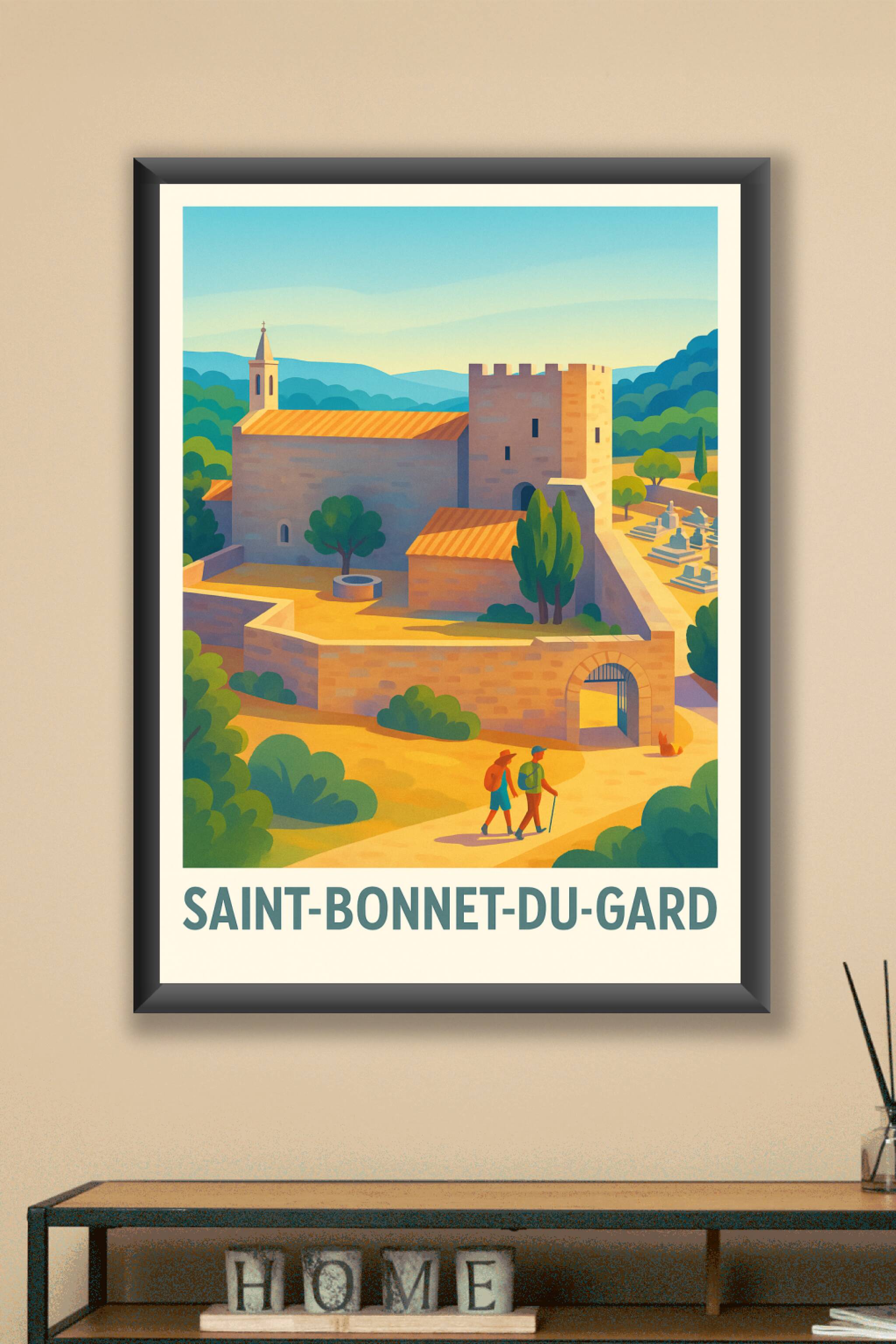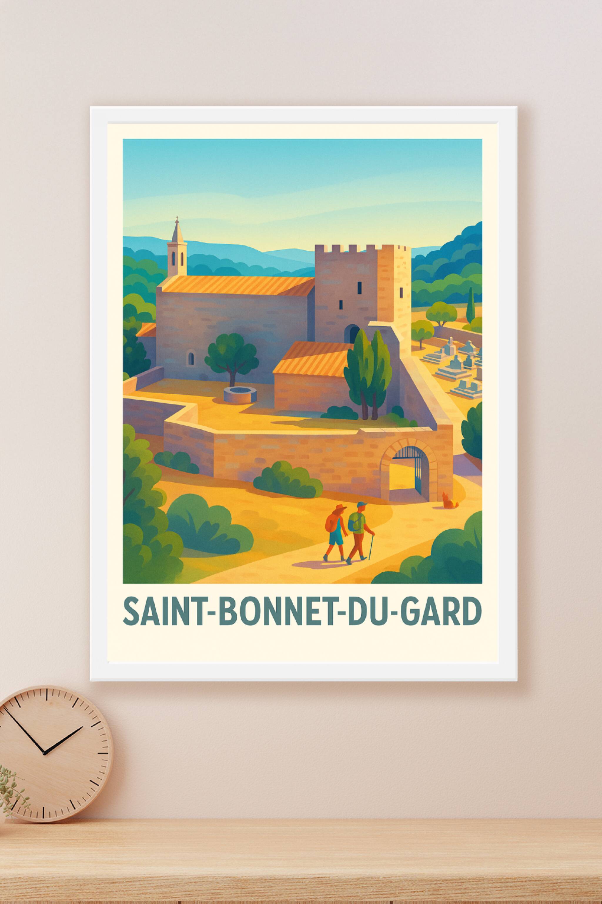 Découvrez l'atmosphère paisible et authentique de Saint-Bonnet-du-Gard avec cette affiche illustrée mettant en valeur son patrimoine historique et ...