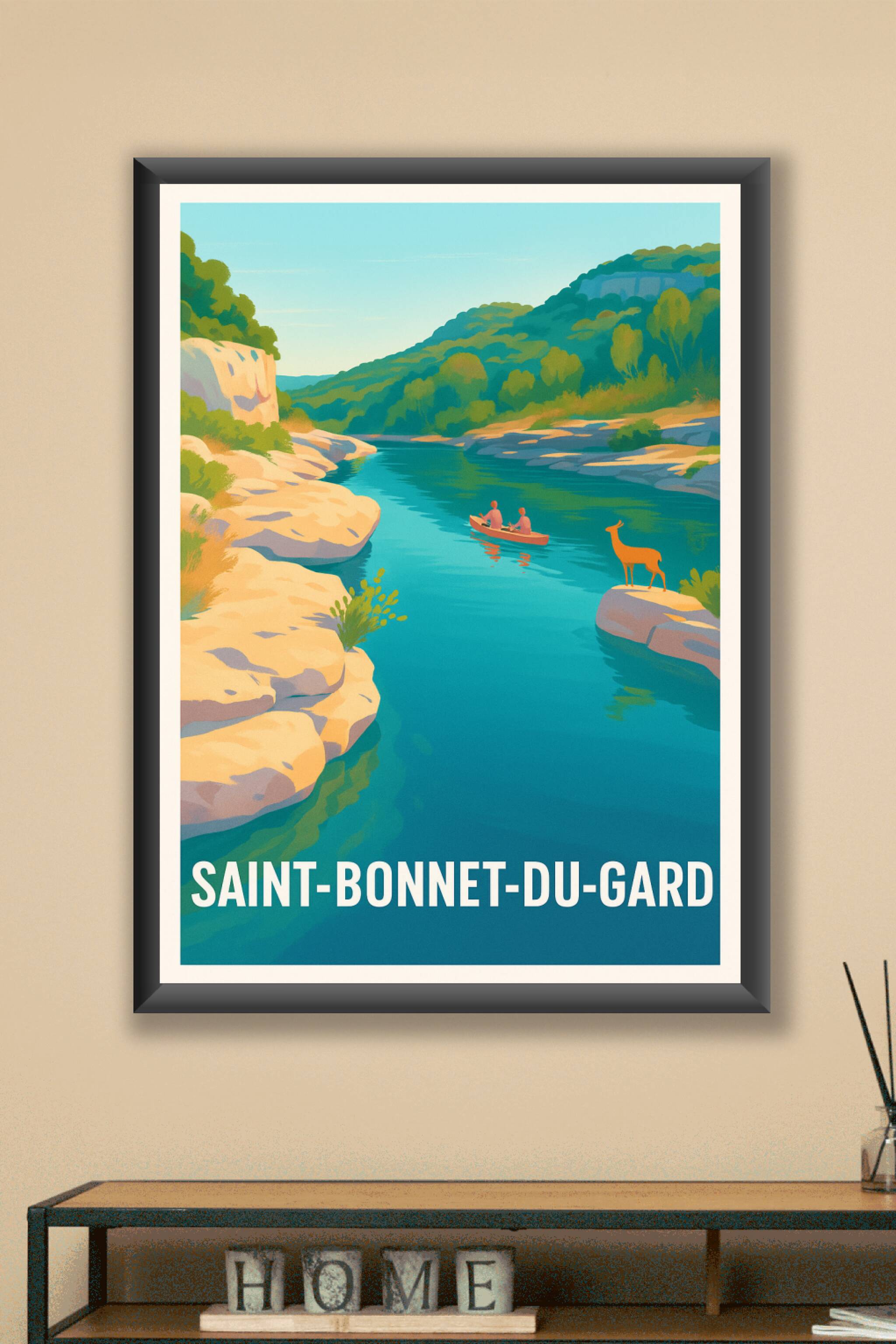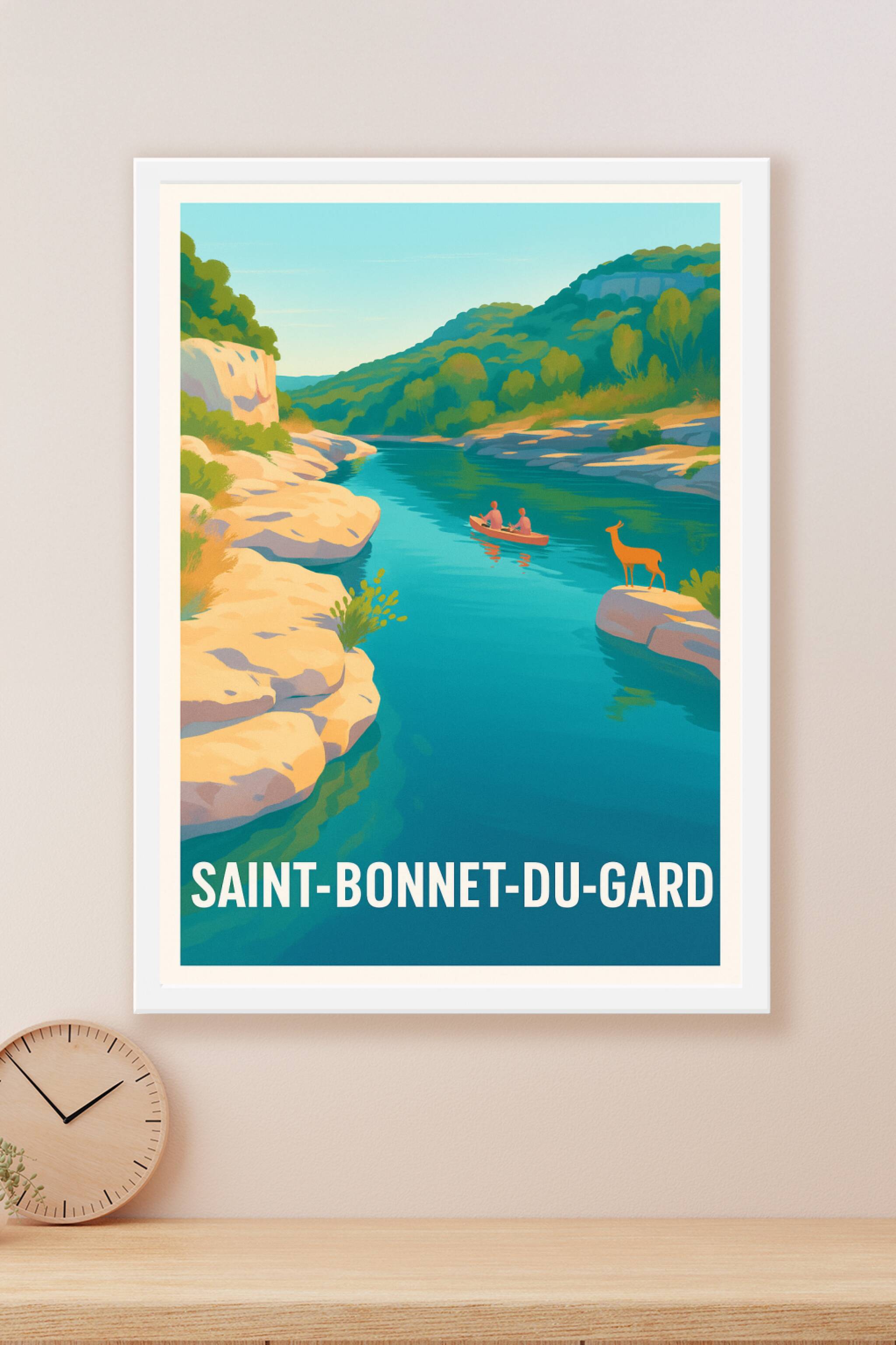 Découvrez la beauté naturelle et apaisante de Saint-Bonnet-du-Gard avec cette affiche illustrée représentant une paisible rivière bordée de falaises et d’arbres verdoyants, où deux personnes pagaient en canoë sous un ciel bleu clair. Cette scène bucolique, complétée par la présence d’un chevreuil sur un rocher, invite à l’évasion et au calme.Afin de sublimer votre décoration, ce poster est disponible en tirage "Fine Art" sur papier 305g coton, garantissant une qualité d'impression exceptionnelle au rendu détaillé et aux couleurs vibrantes. Choisissez parmi les formats A1 à A4, avec ou sans cadre, pour adapter parfaitement cette affiche à votre intérieur ou offrir un cadeau unique inspiré par la douceur de cette région. Entièrement imprimé en France, ce poster allie authenticité et élégance pour un souvenir durable de Saint-Bonnet-du-Gard.