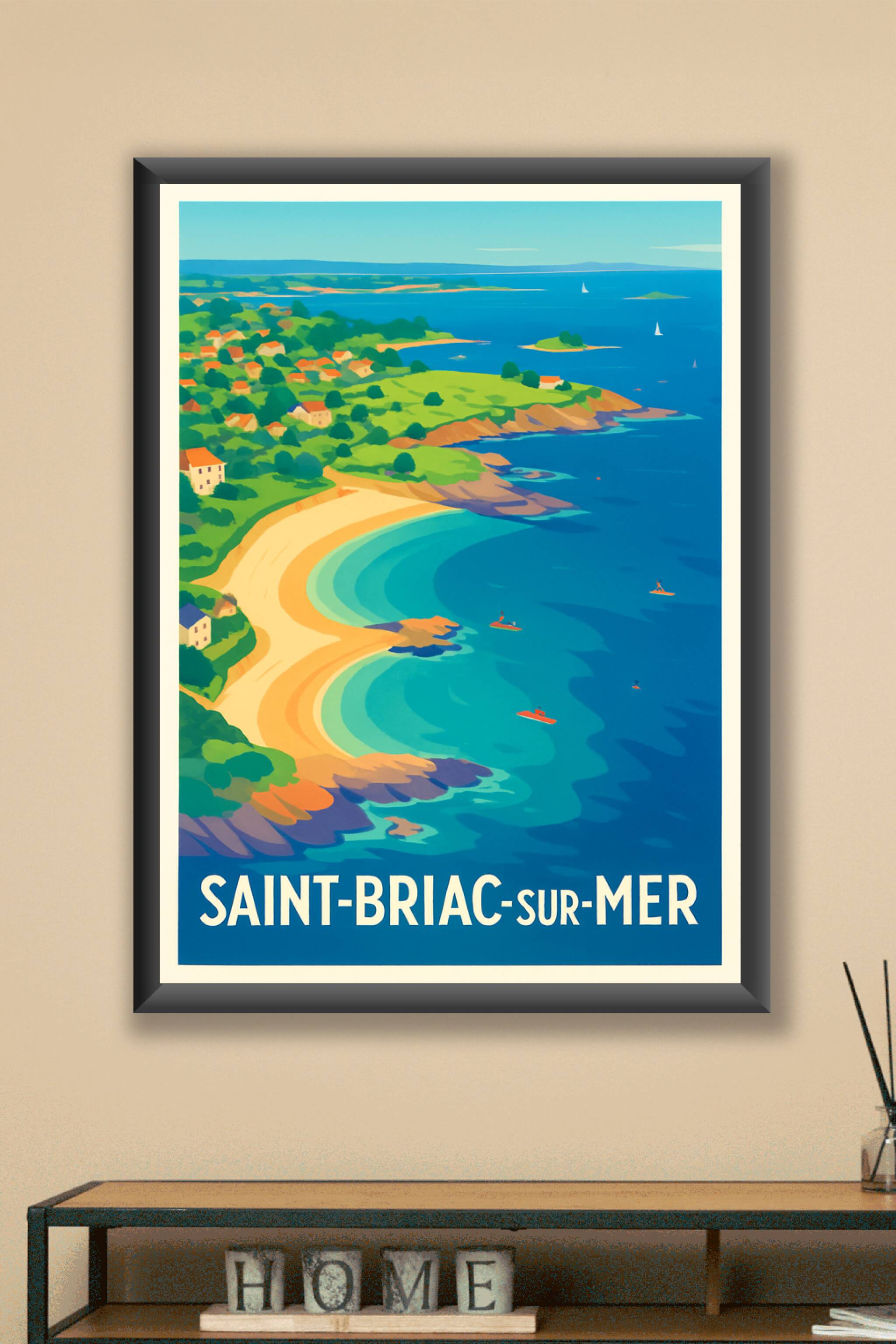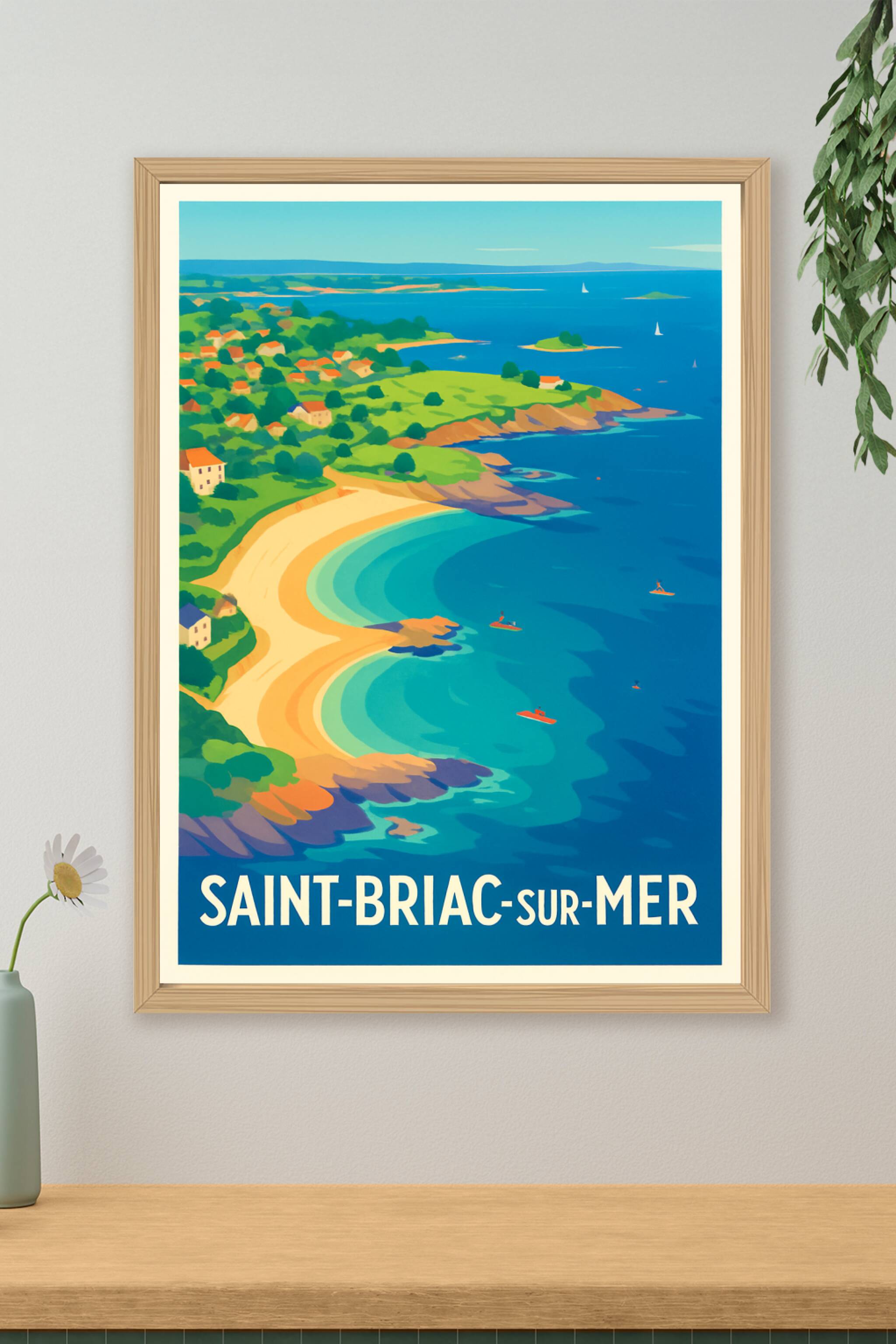 Découvrez la beauté naturelle de Saint-Briac-sur-Mer avec ce poster vibrant, illustrant ses plages dorées et ses eaux turquoise. Cette affiche rétr...