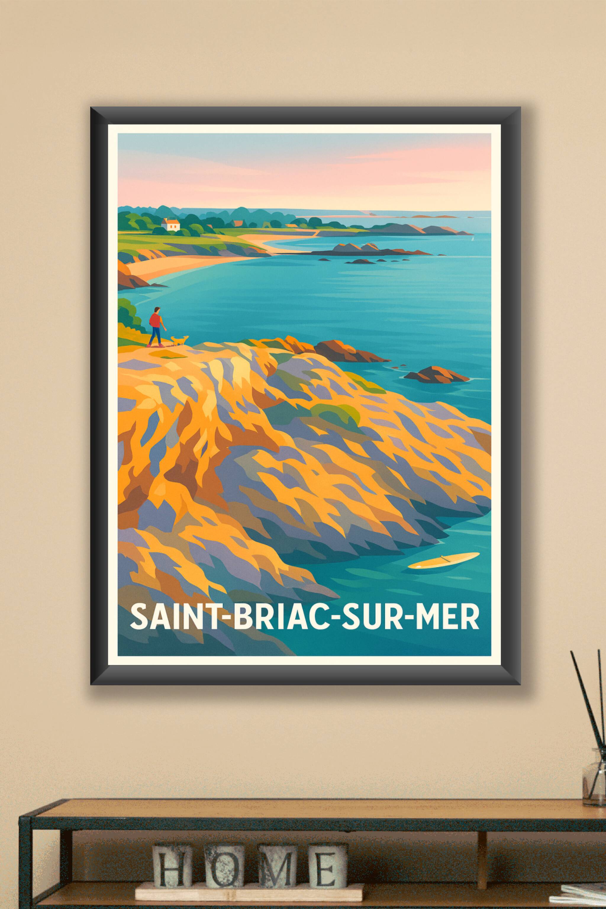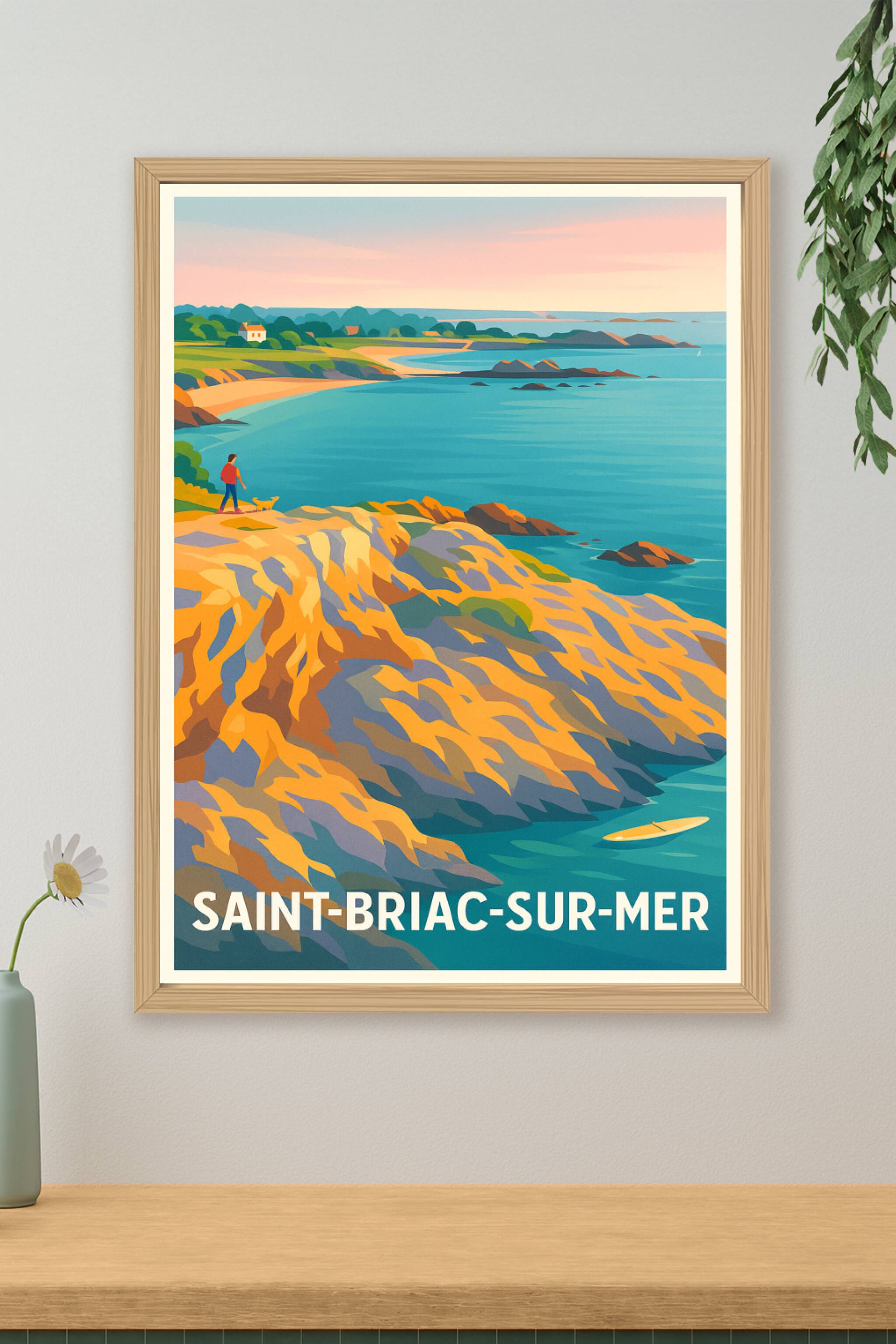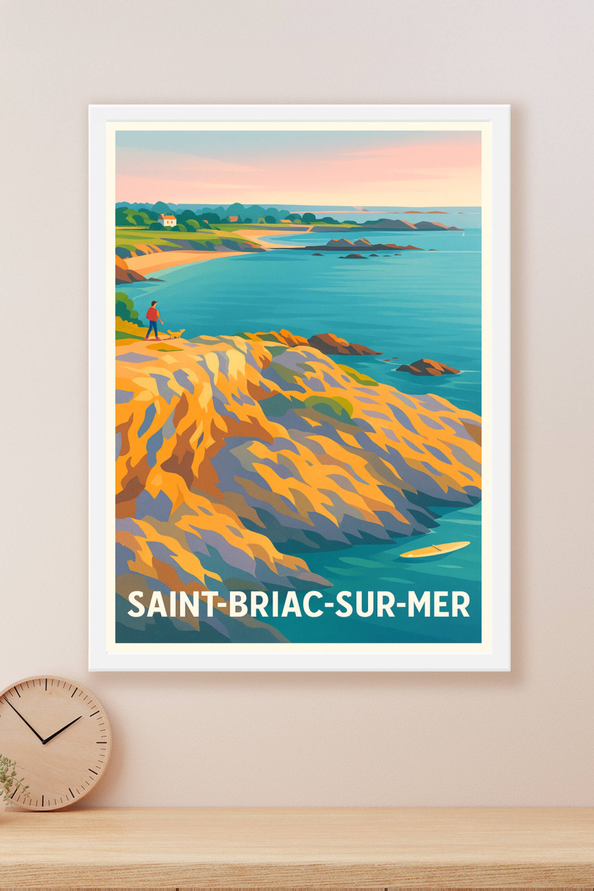 Découvrez la beauté naturelle de Saint-Briac-sur-Mer avec cette affiche illustrée qui capture la douceur des falaises baignées par le soleil et l’é...