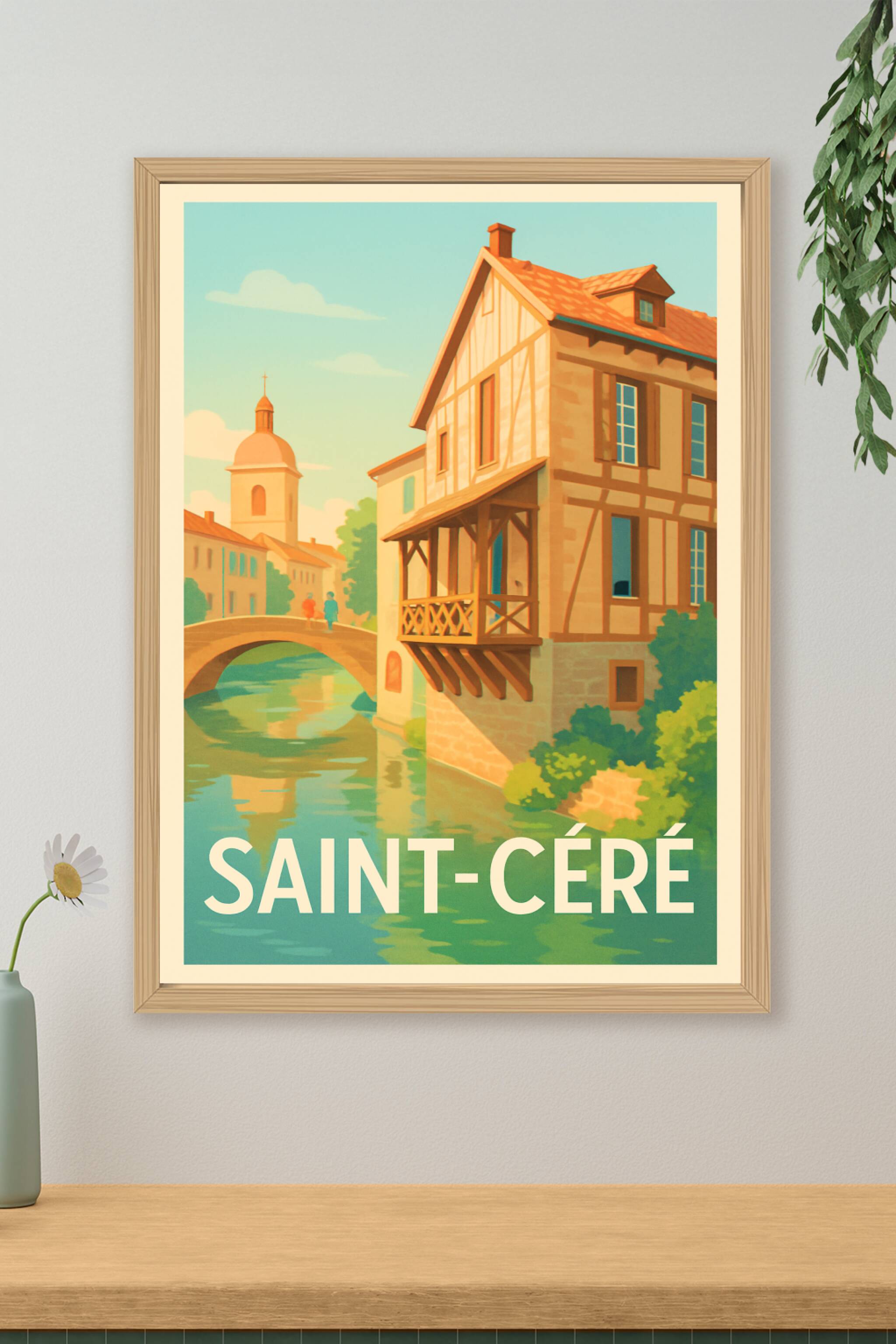 Découvrez l'élégance intemporelle de Saint-Céré avec cette affiche illustrée mettant en scène une maison à colombages au bord de l'eau, baignée par...