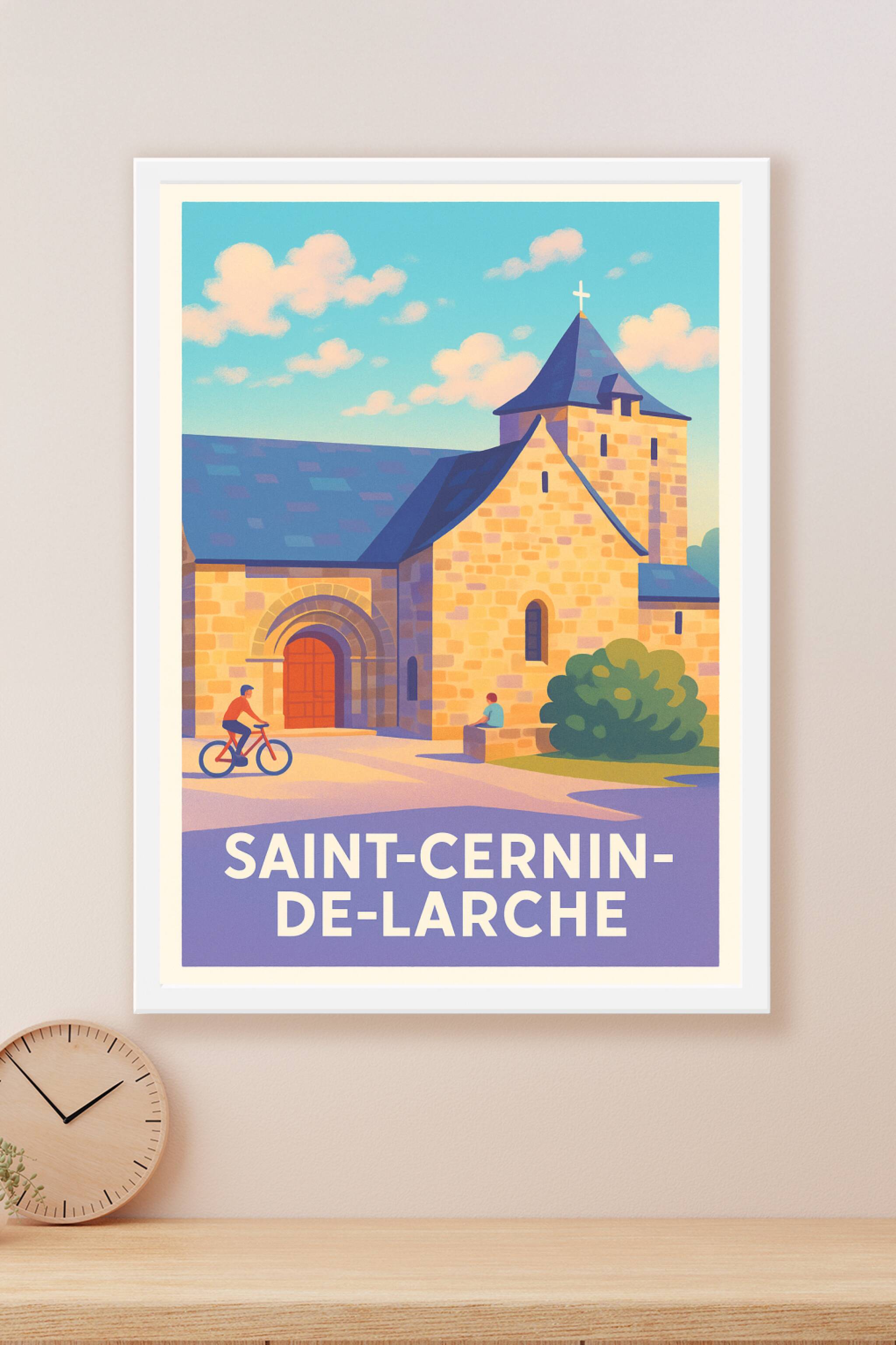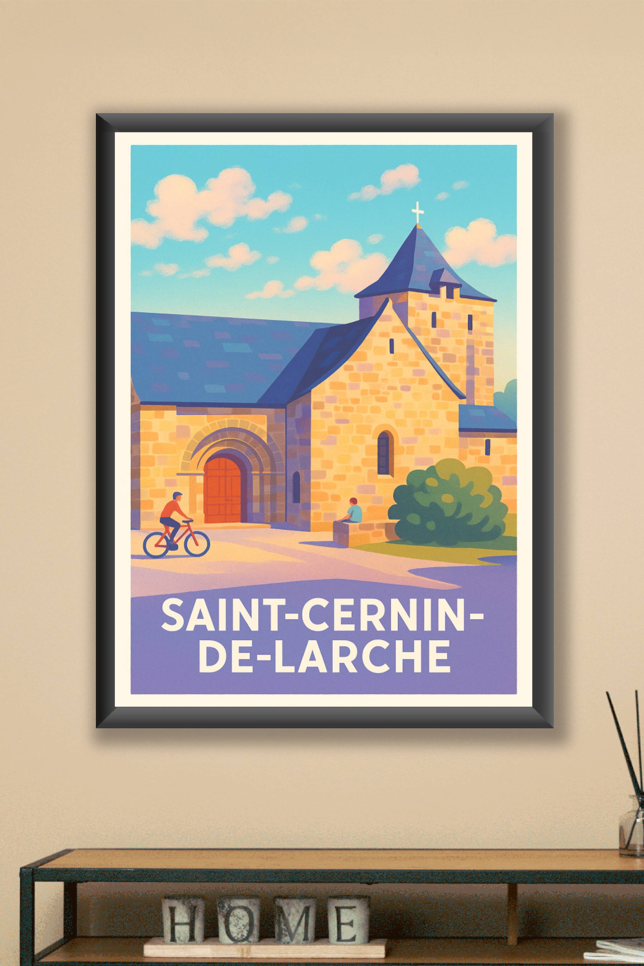 Découvrez l’élégance intemporelle de Saint-Cernin-de-Larche avec cette affiche illustrée mettant en valeur l’architecture typique de la région sous...