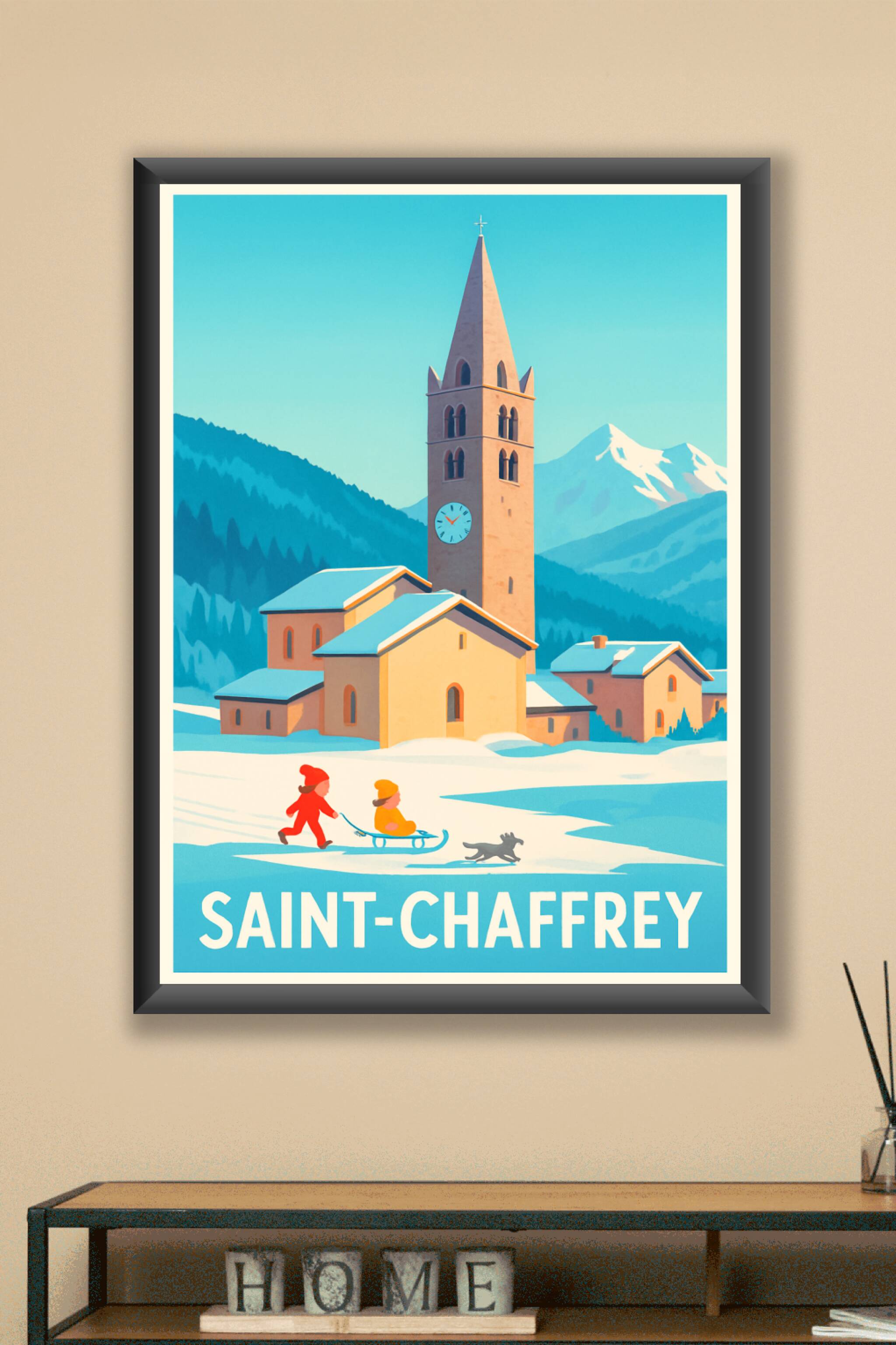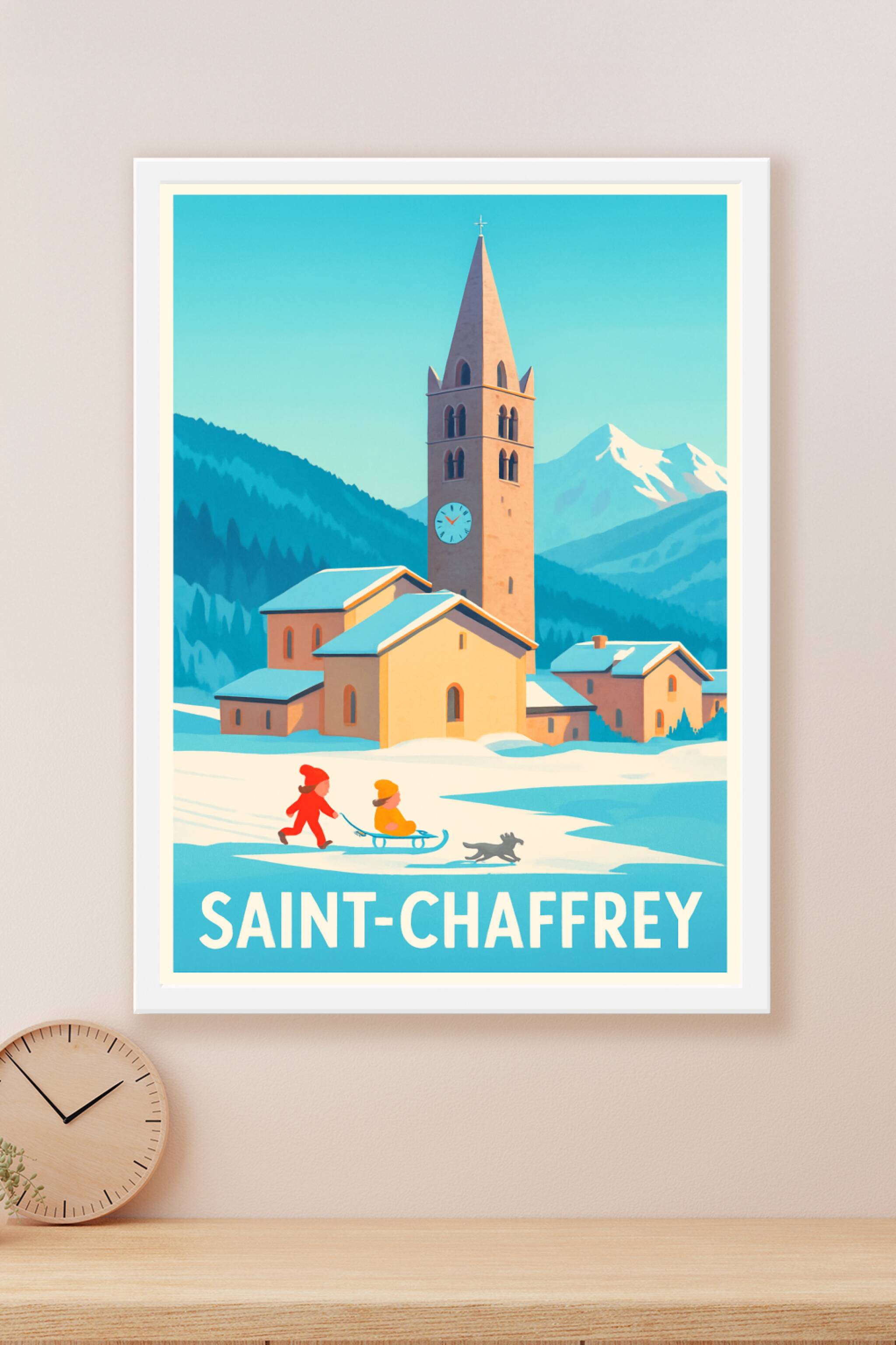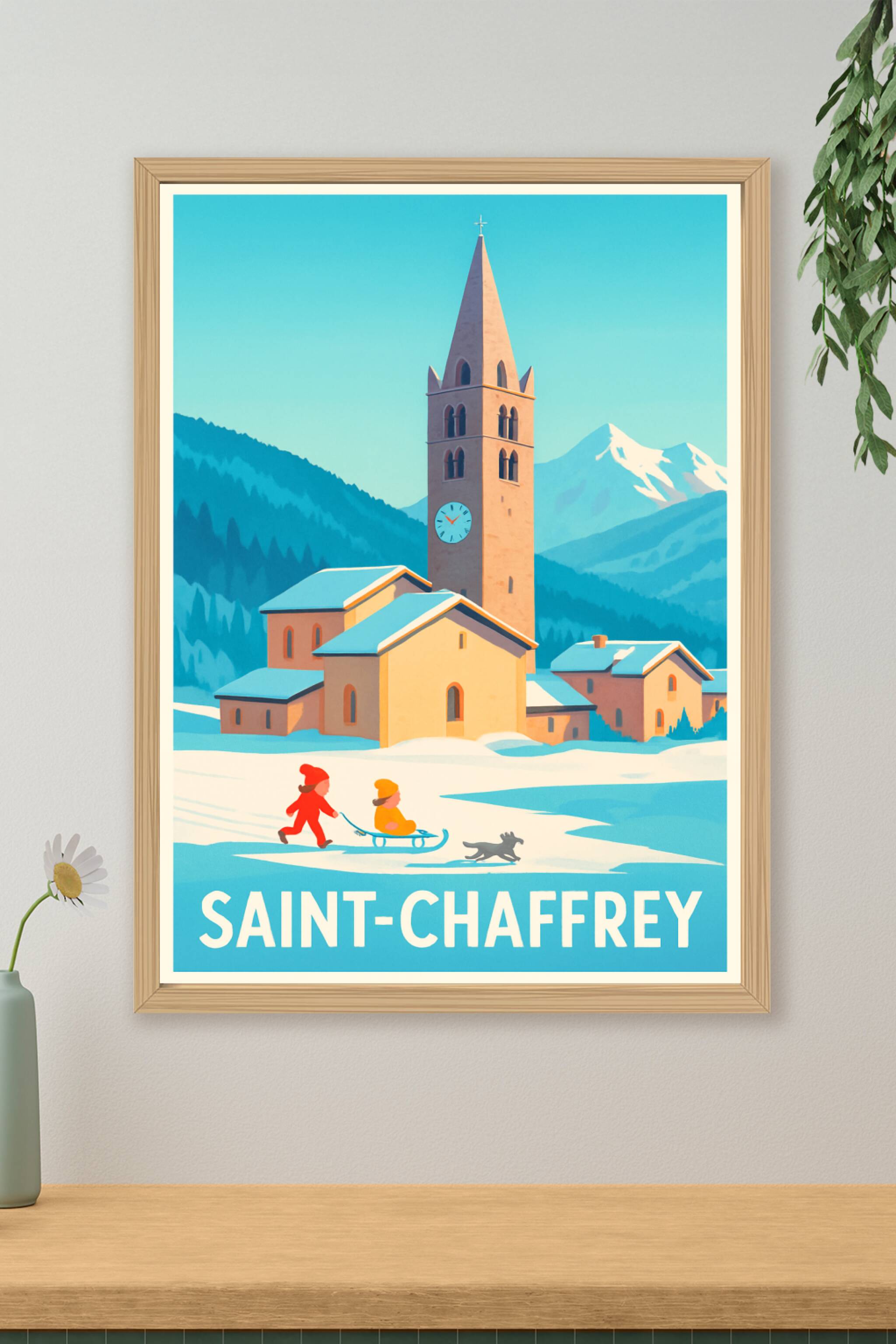 Découvrez la magie hivernale de Saint-Chaffrey avec cette affiche illustrée d'un village alpin baigné de lumière douce, dominé par son clocher horl...