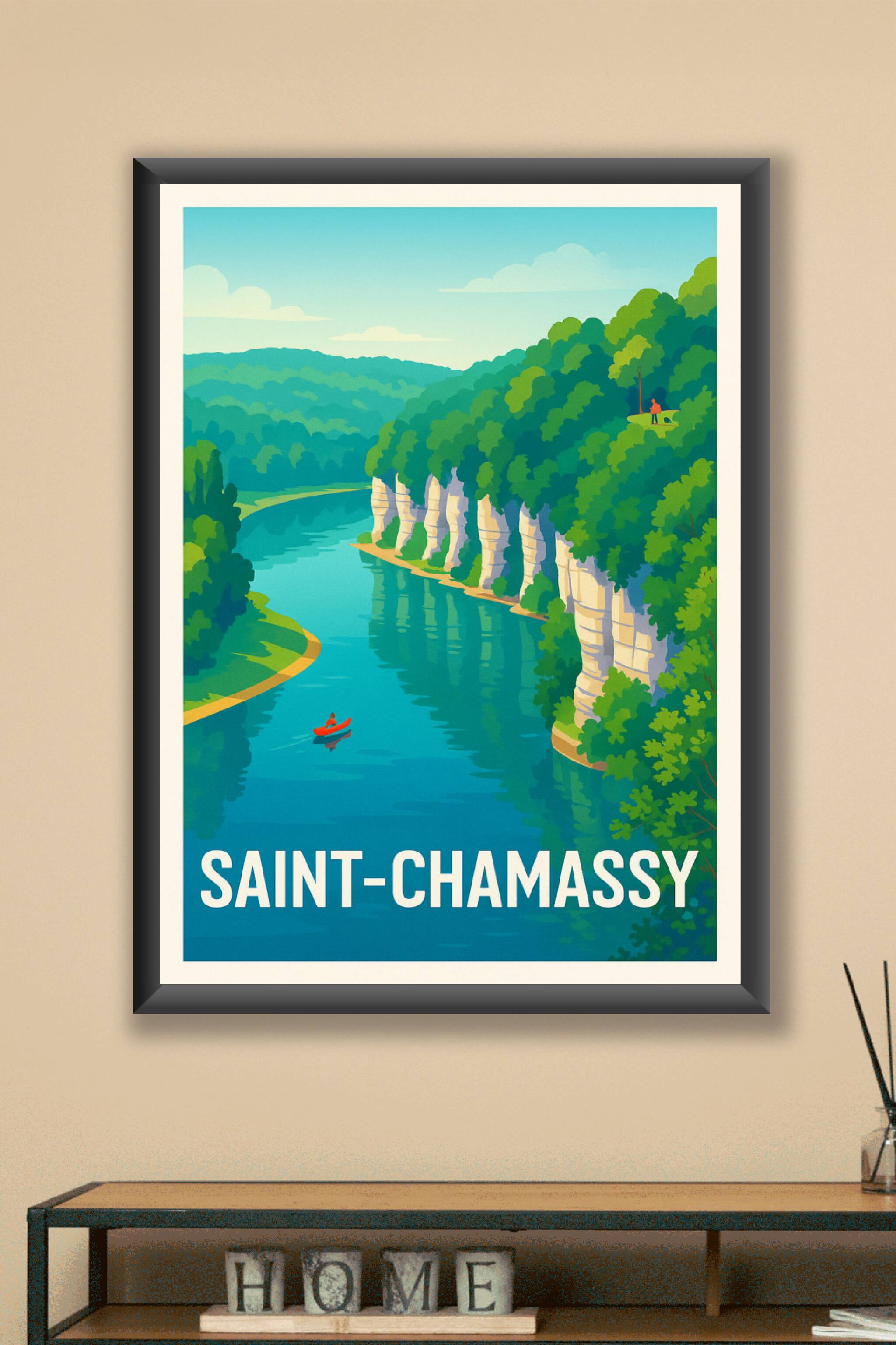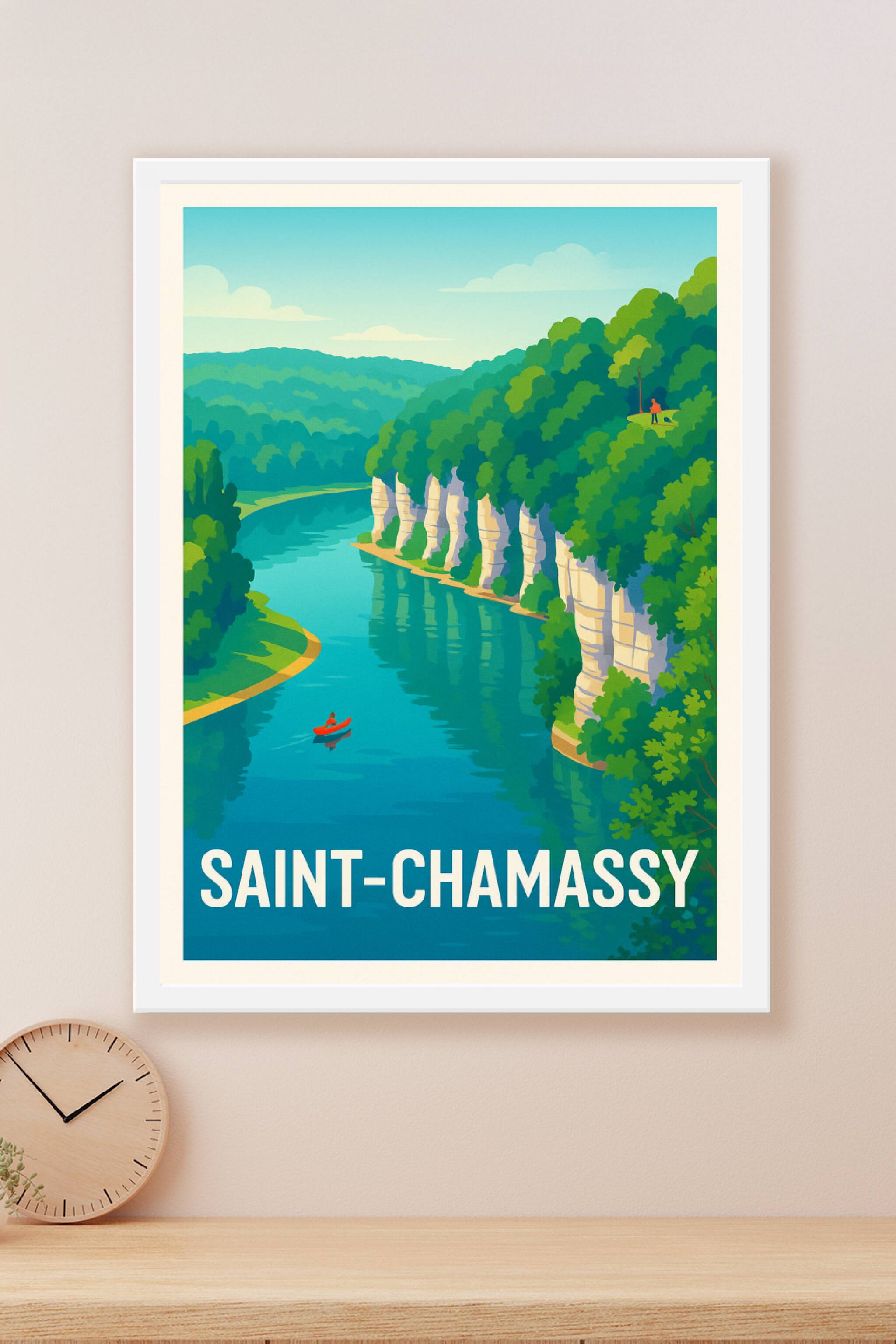Découvrez la splendeur paisible de Saint-Chamassy avec cette affiche illustrée aux couleurs vibrantes, mettant en avant les falaises blanches surpl...