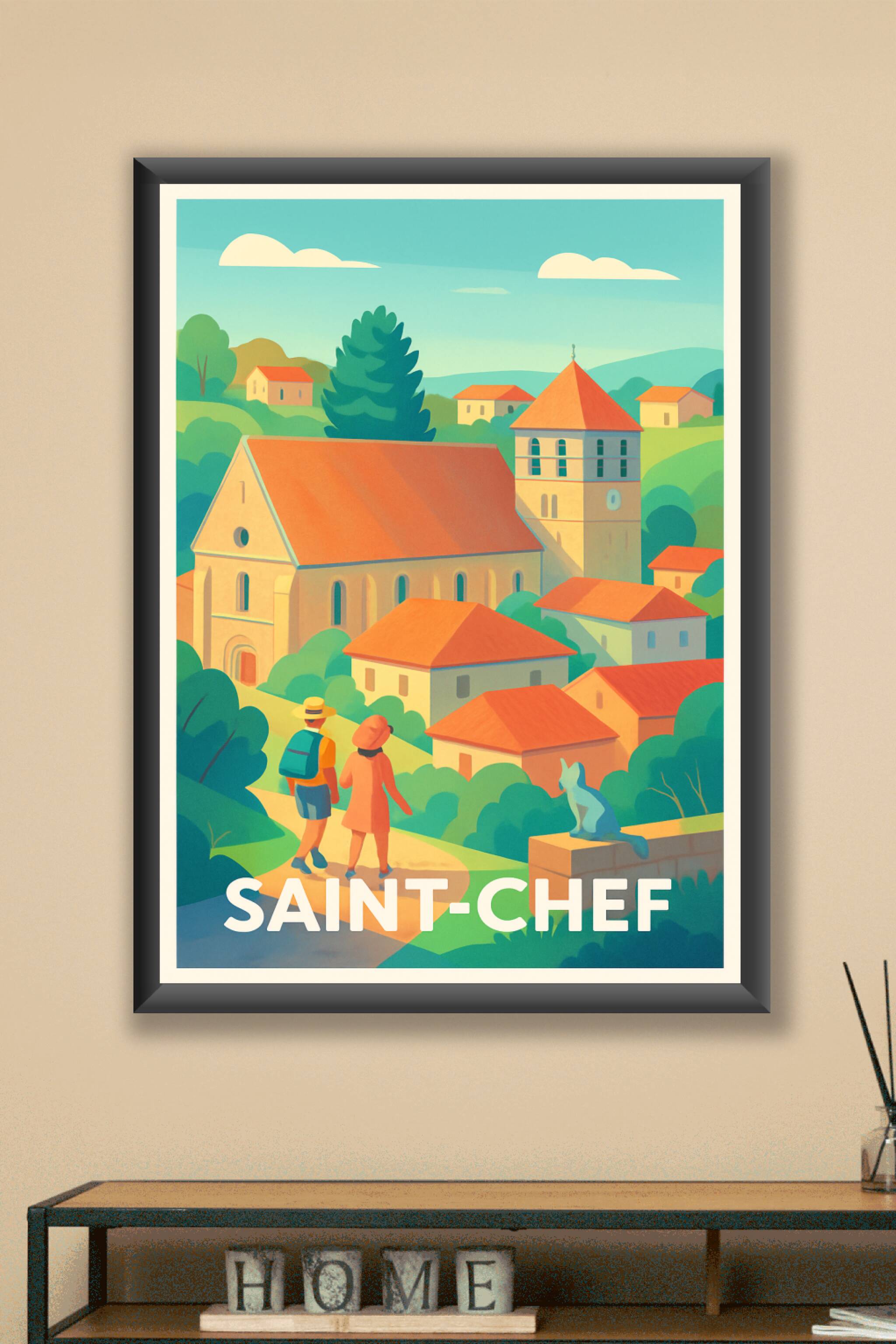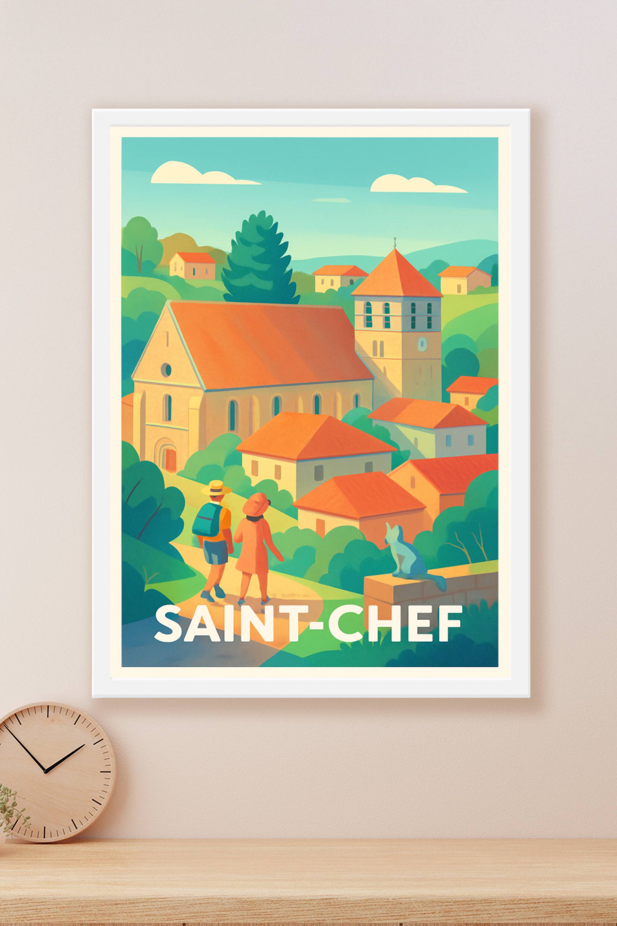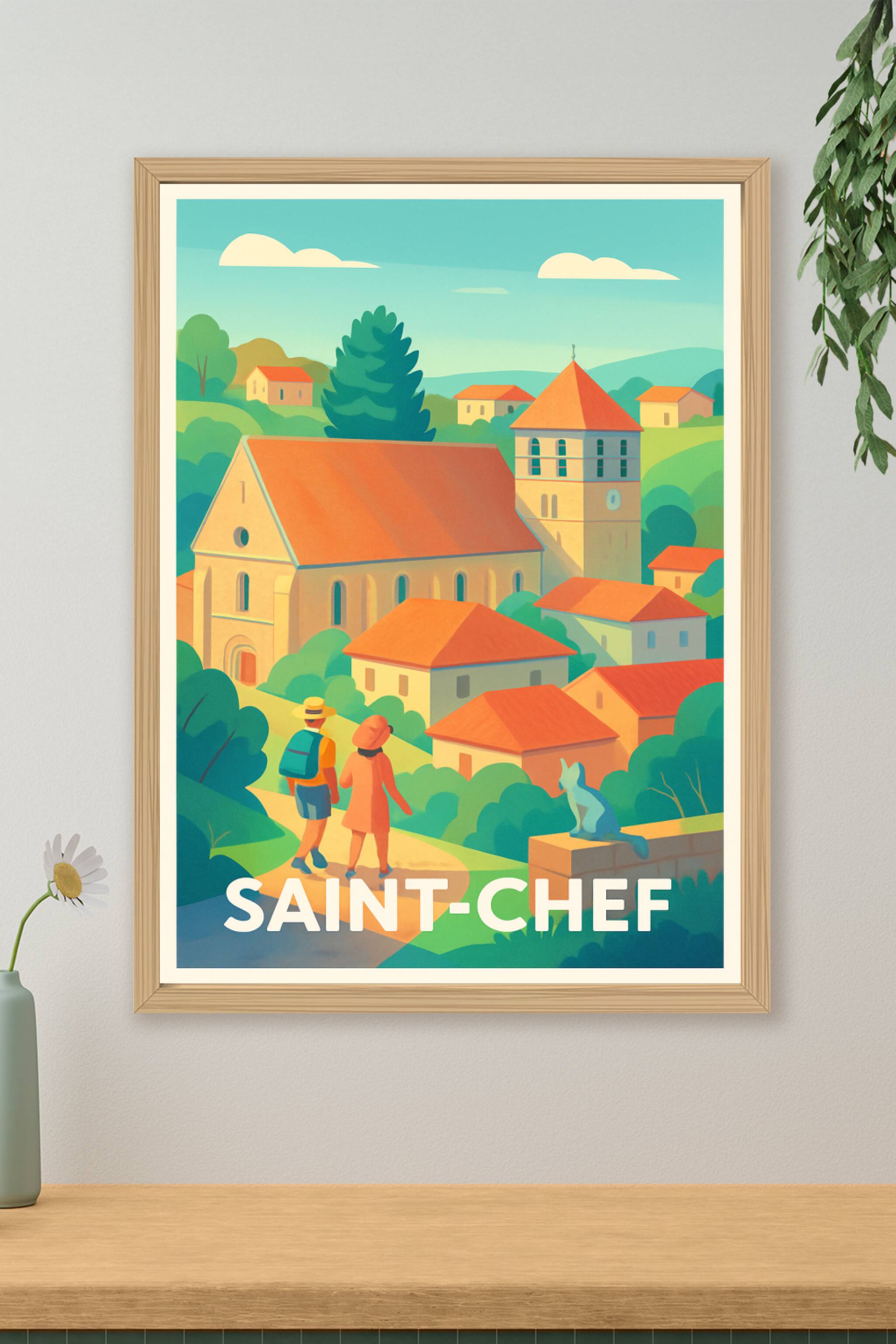 Découvrez l'atmosphère paisible et chaleureuse de Saint-Chef avec cette affiche artistique illustrant ses toits colorés et son clocher emblématique...
