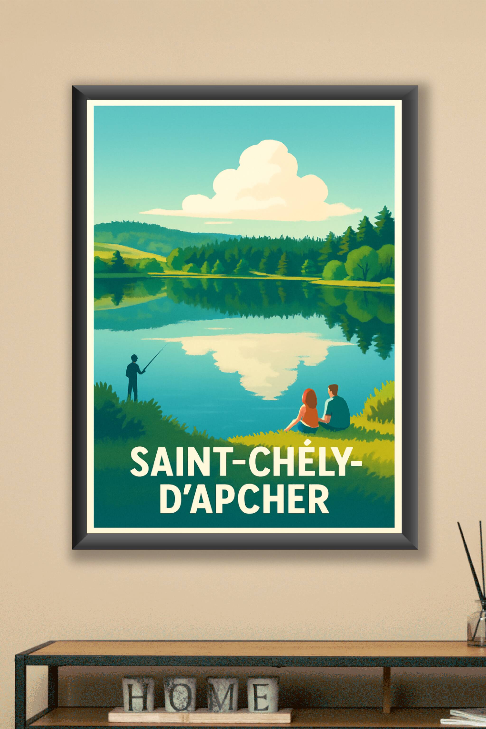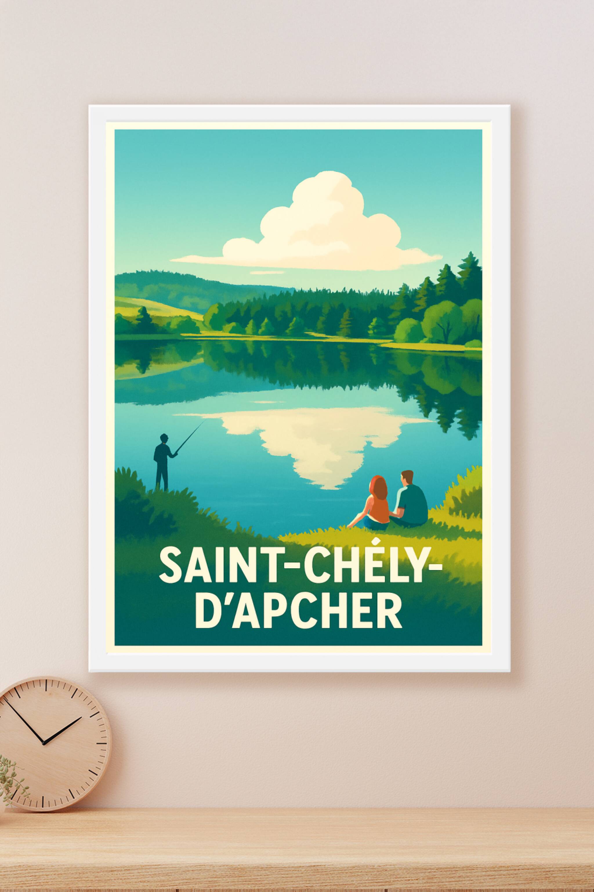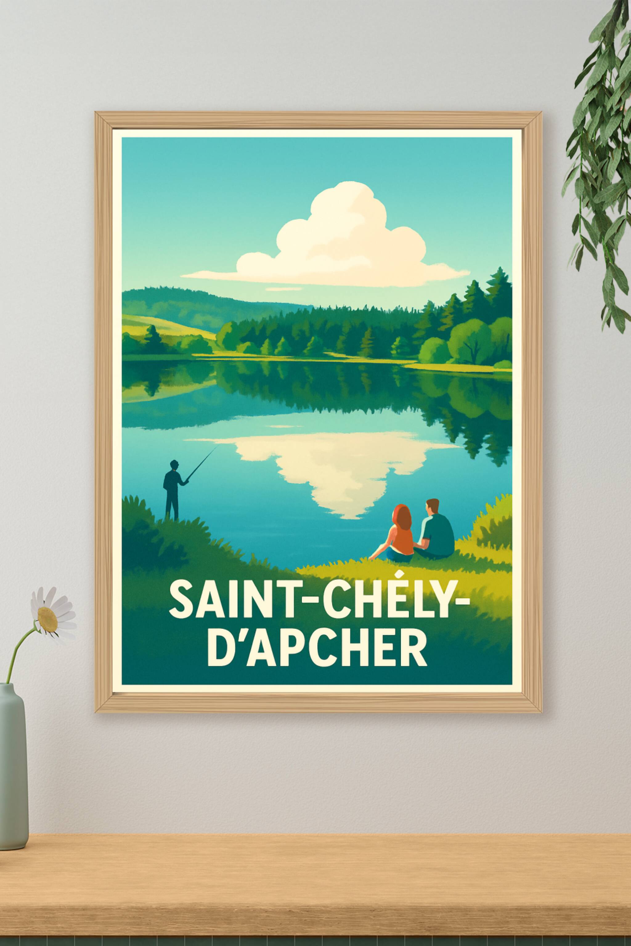 Découvrez la quiétude de Saint-Chély-d'Apcher avec cette affiche illustrée représentant un paisible lac où se reflète un ciel d'été, entouré de ver...