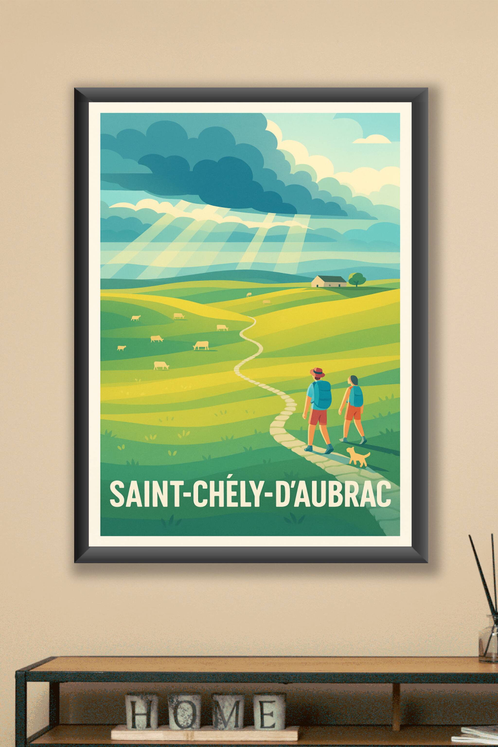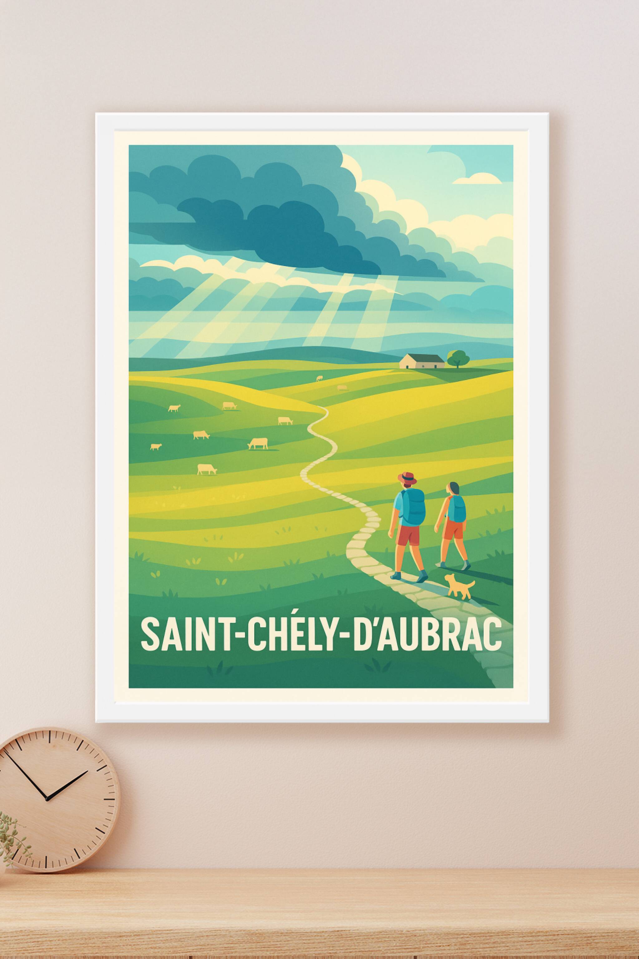 Découvrez la douceur paisible des paysages de Saint-Chély-d'Aubrac avec cette superbe affiche illustrée aux couleurs apaisantes et au style rétro. ...