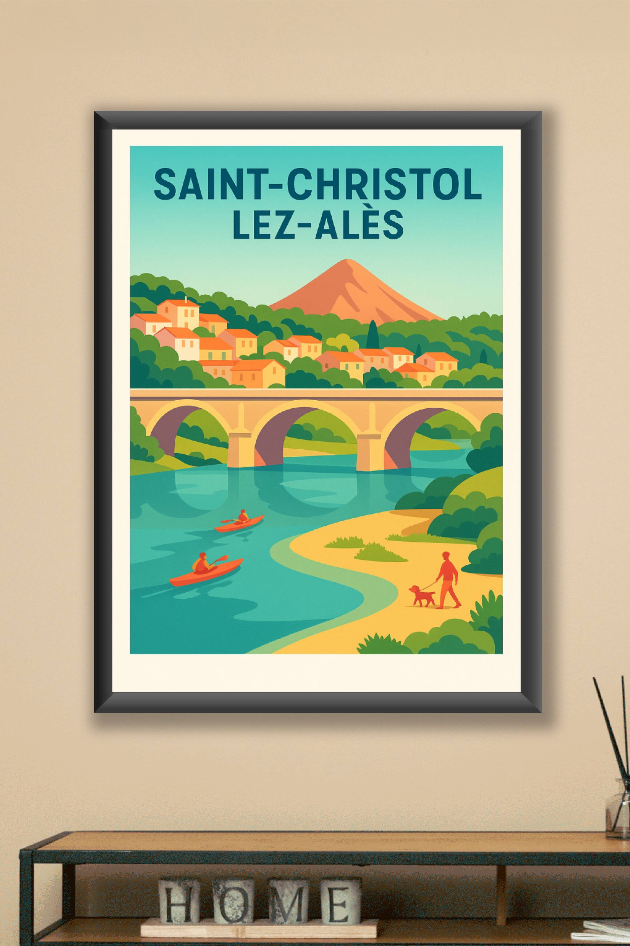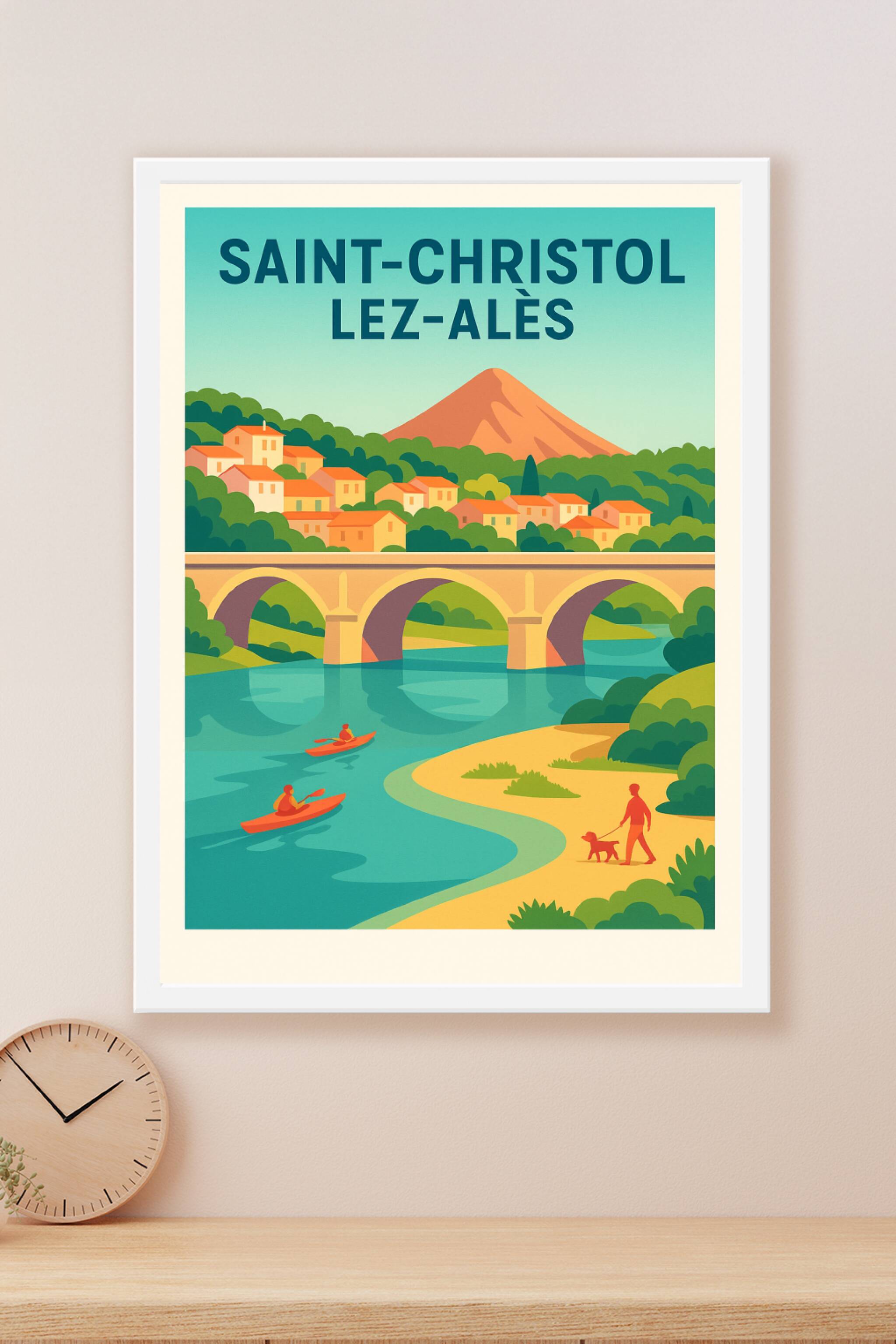 Découvrez le charme paisible de Saint-Christol-lez-Alès avec cette affiche illustrée aux couleurs vives et harmonieuses. Plongez dans cette scène bucolique où rivière, pont historique, collines verdoyantes et village coloré se mêlent pour créer une atmosphère apaisante et authentique. Ce poster est imprimé en tirage "Fine Art" sur papier 305g coton, garantissant une qualité d'impression exceptionnelle et une durabilité remarquable. Disponible en formats A1 à A4, avec ou sans cadre, cette affiche apporte une touche de fraîcheur et de convivialité à votre décoration intérieure. Fabriquée en France, elle s'adresse à tous les amoureux de nature, de paysages ruraux et d'art graphique contemporain.