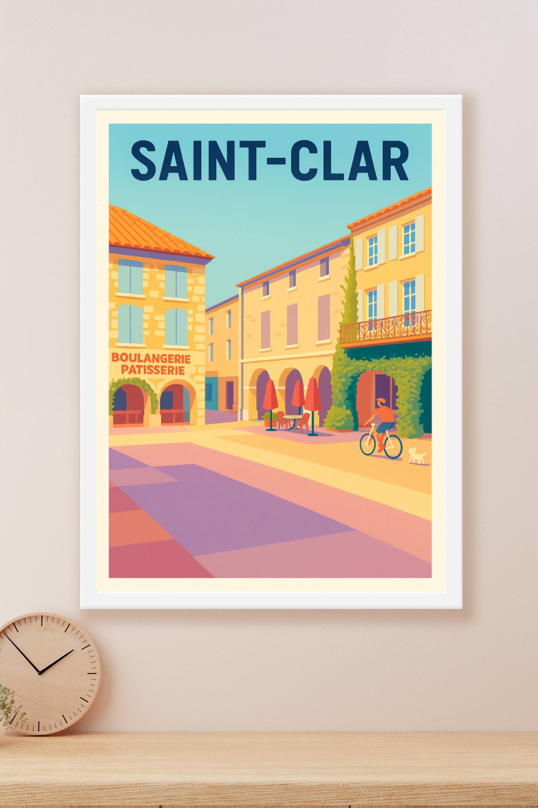 Découvrez ce poster illustré qui capture l'atmosphère paisible et chaleureuse de Saint-Clar, avec ses ruelles ensoleillées, ses façades en pierres ...