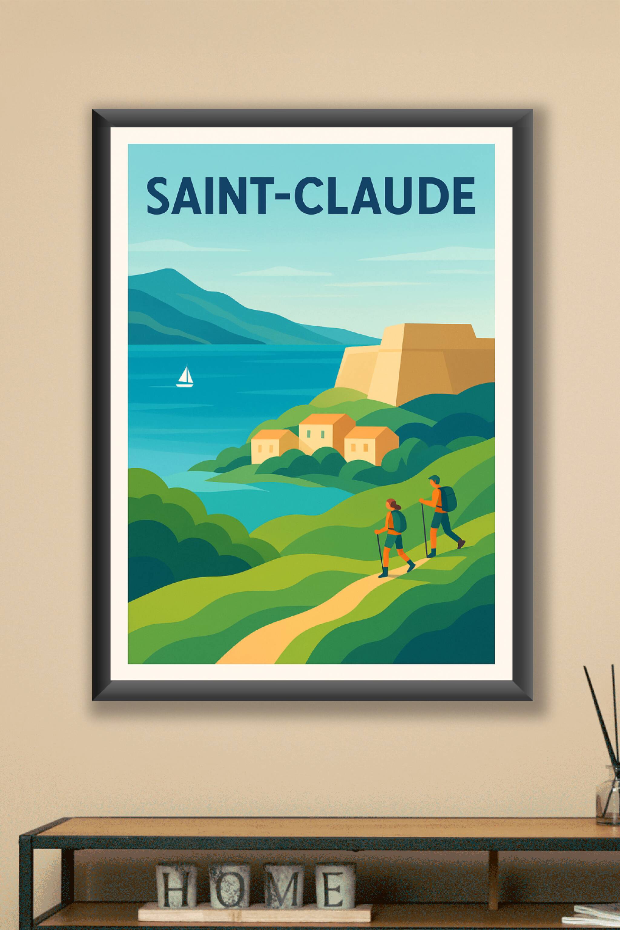 Découvrez la beauté sauvage et apaisante de Saint-Claude avec ce poster illustré, mettant en scène des randonneurs au cœur d’un paysage vallonné au...