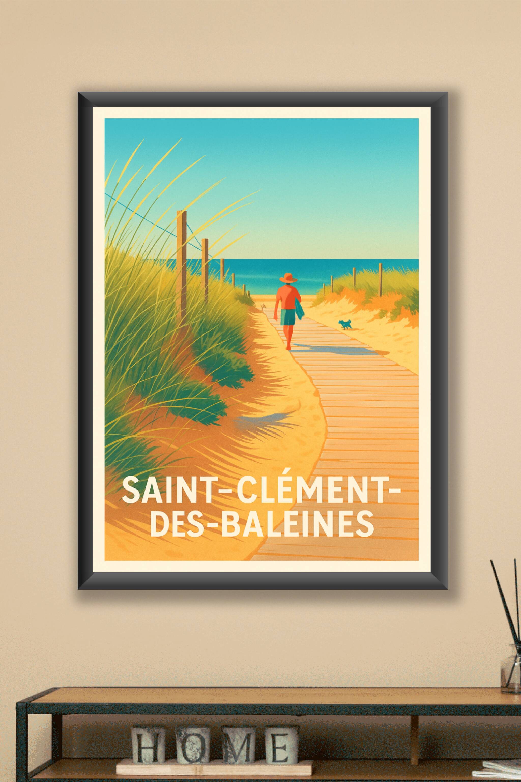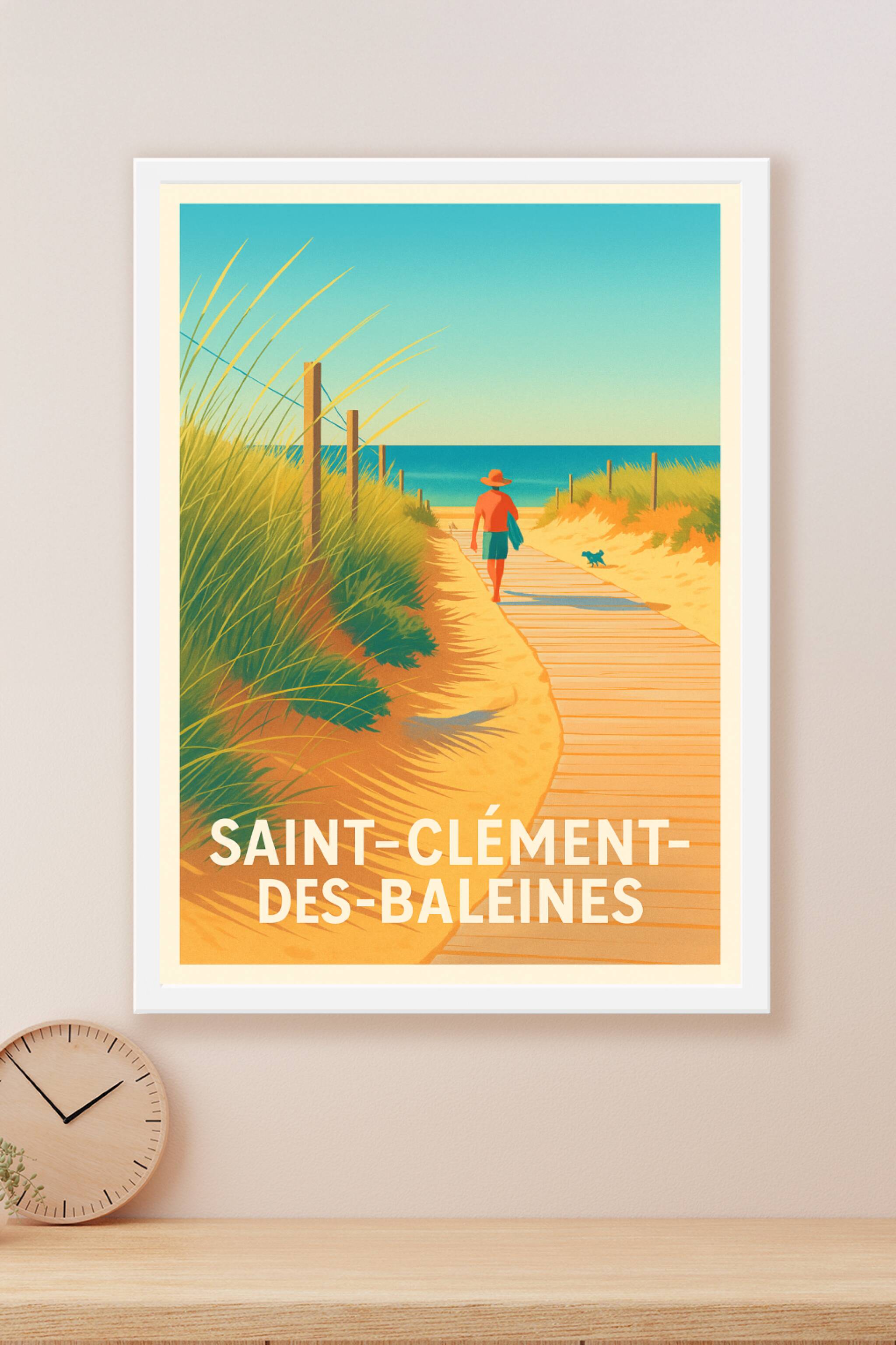 Découvrez l'atmosphère apaisante de Saint-Clément-des-Baleines avec cette affiche élégante représentant un chemin de planches menant à la mer, baig...