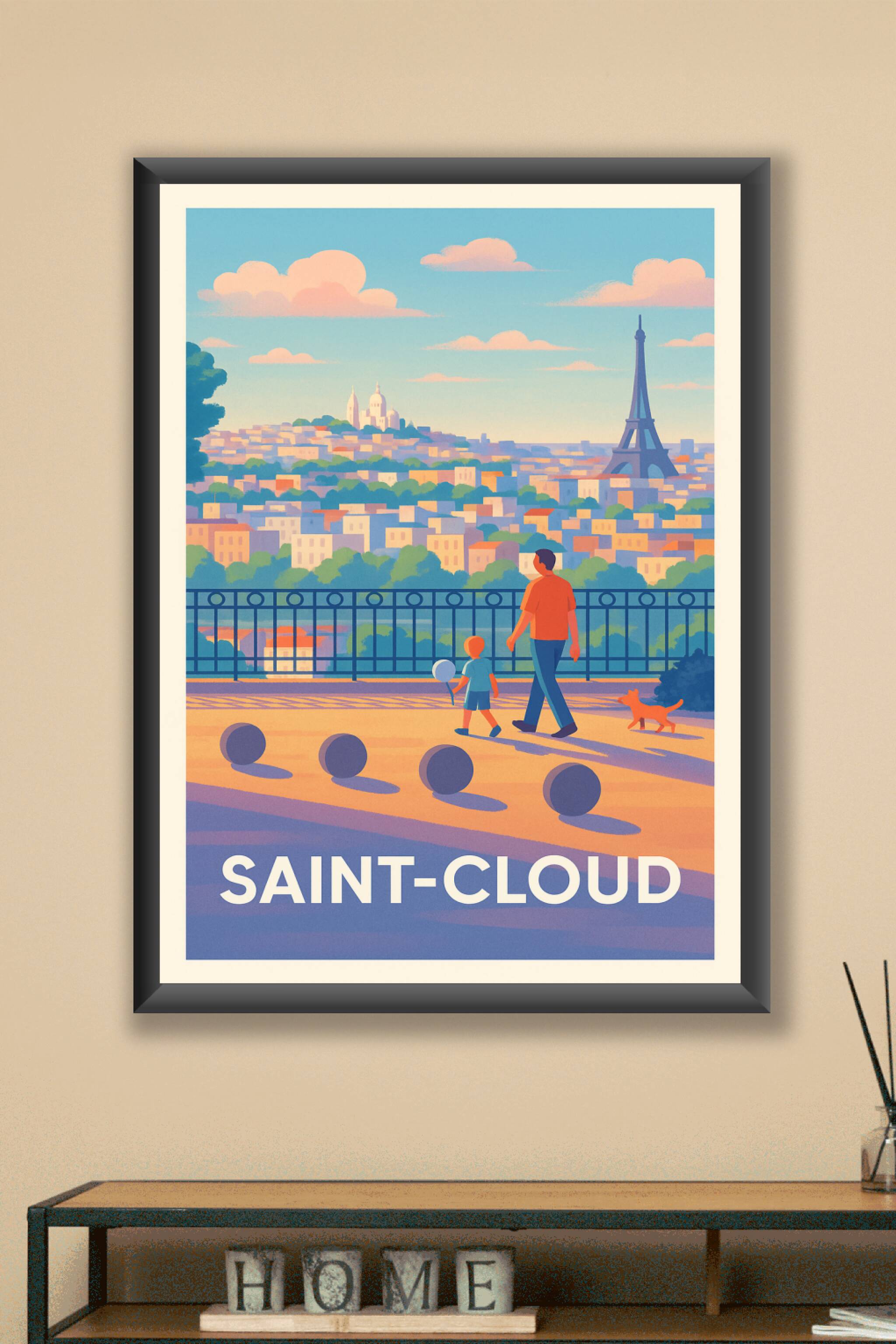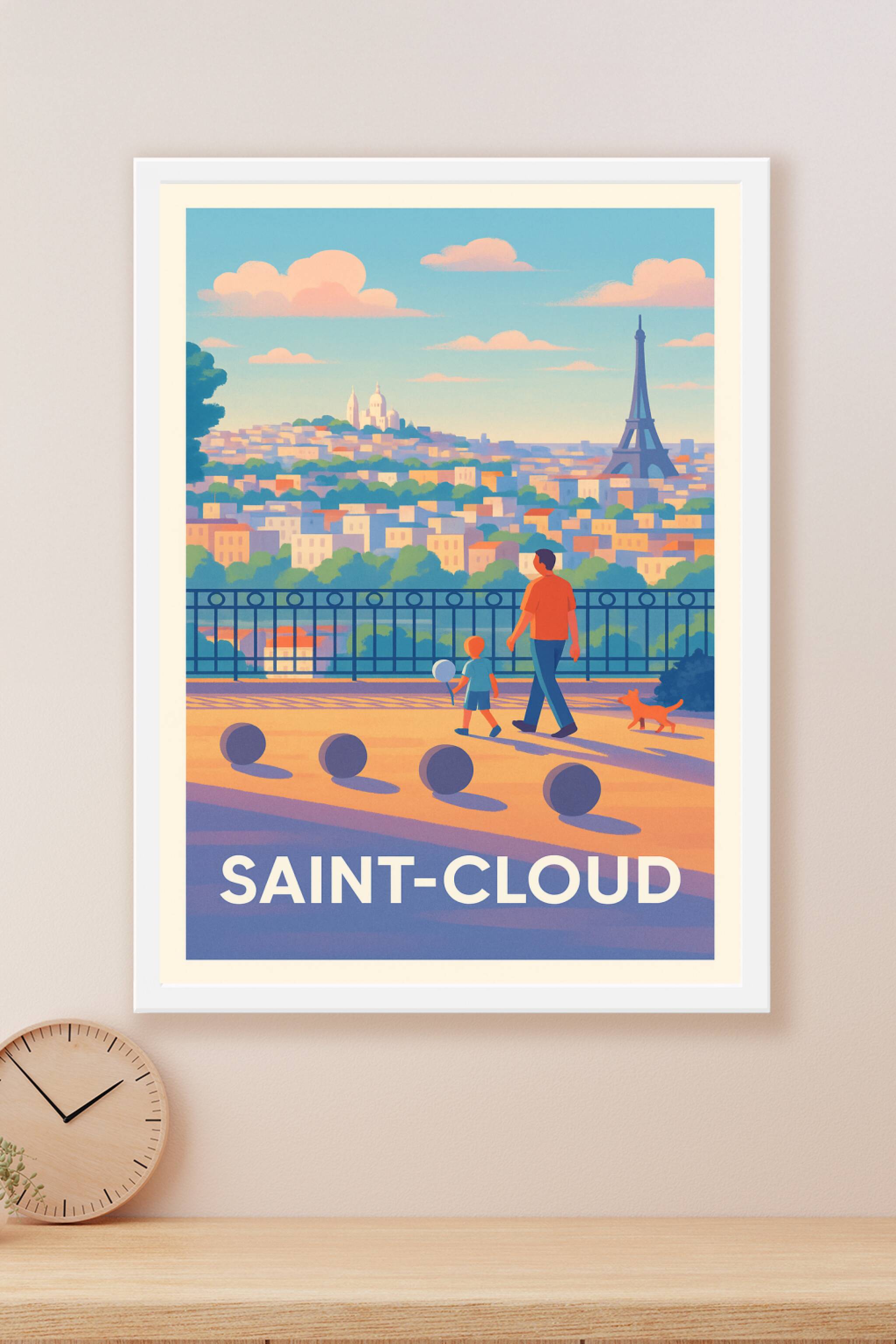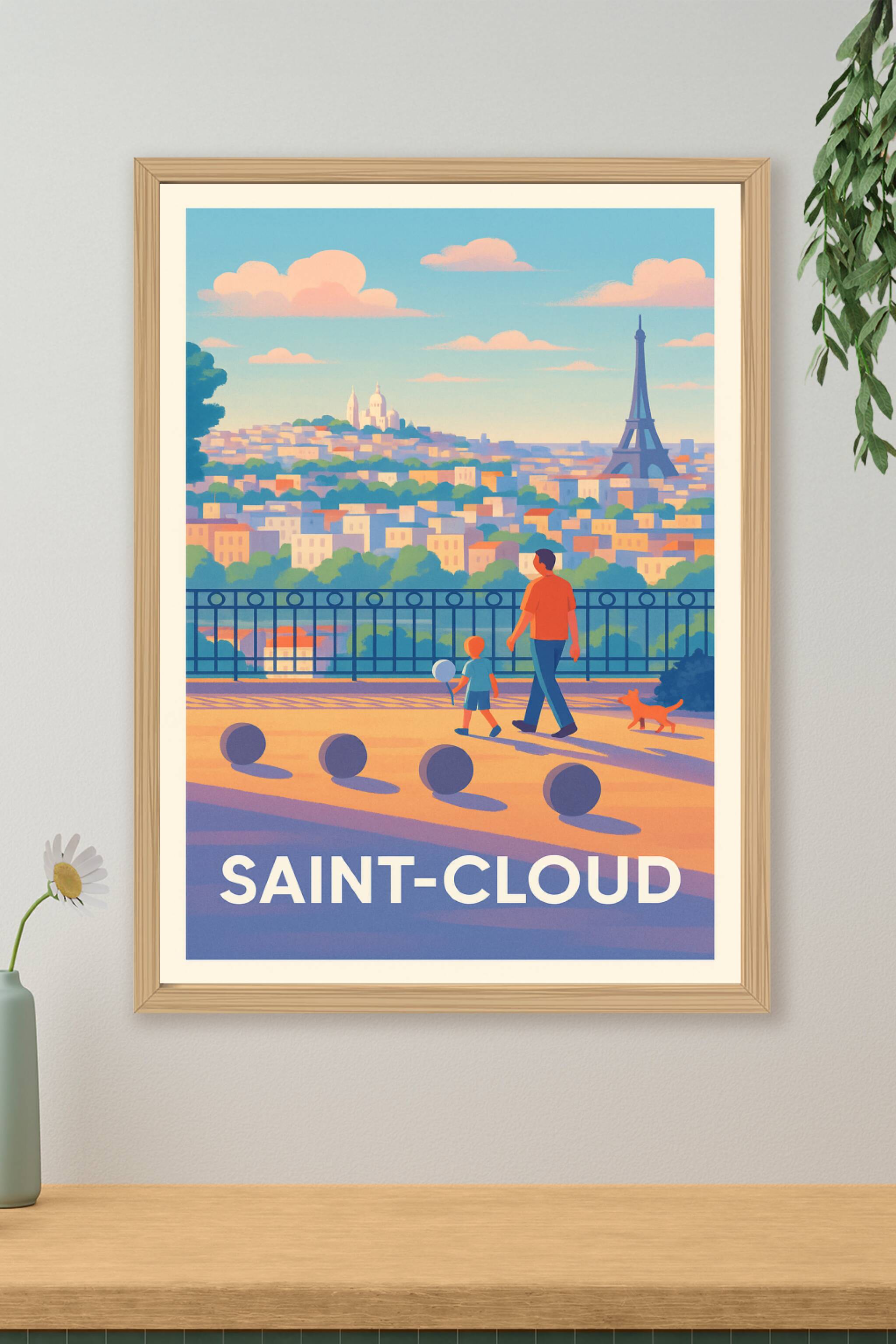 Découvrez la douceur de vivre en banlieue parisienne avec cette affiche illustrée mettant en scène une promenade familiale à Saint-Cloud, sur fond ...