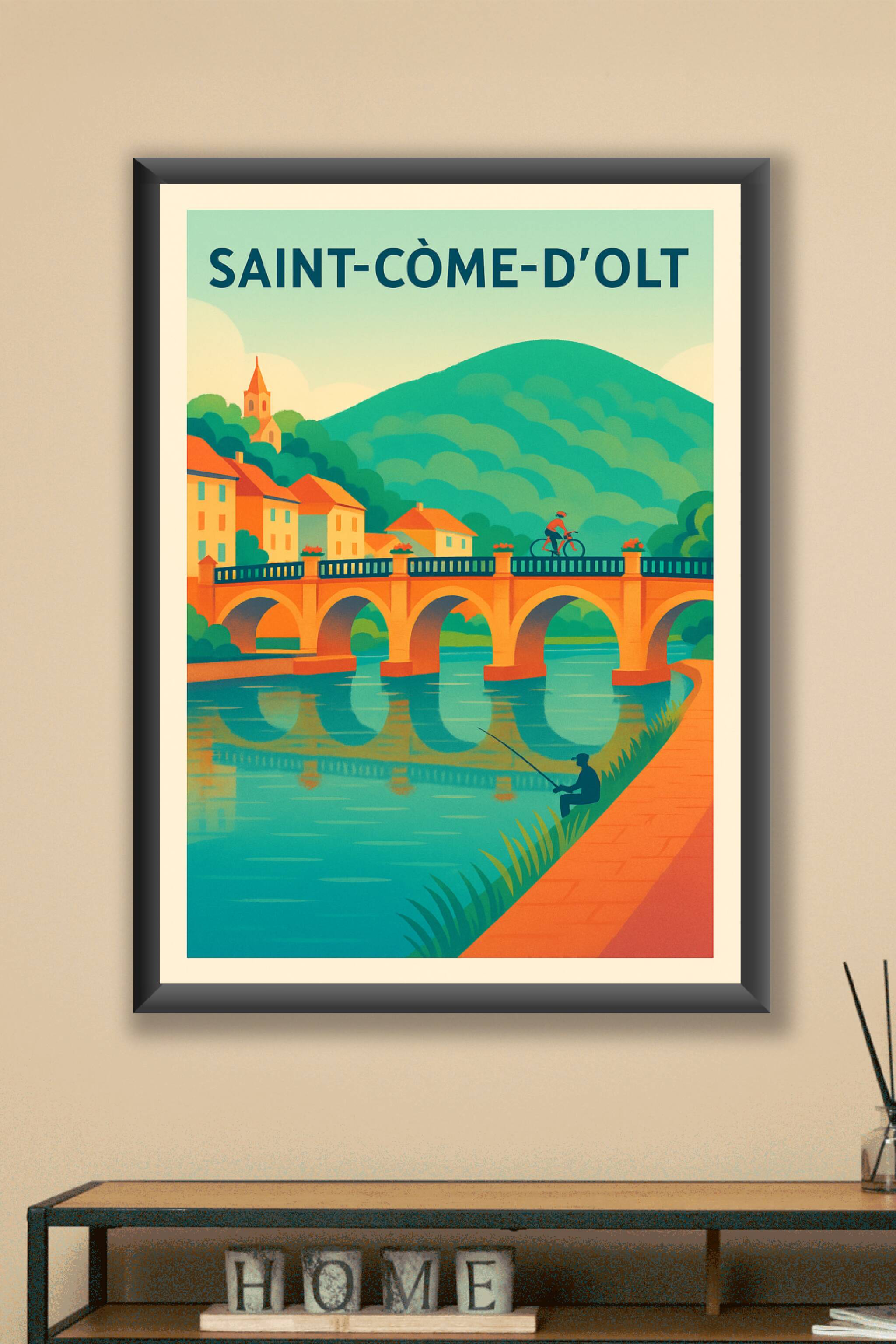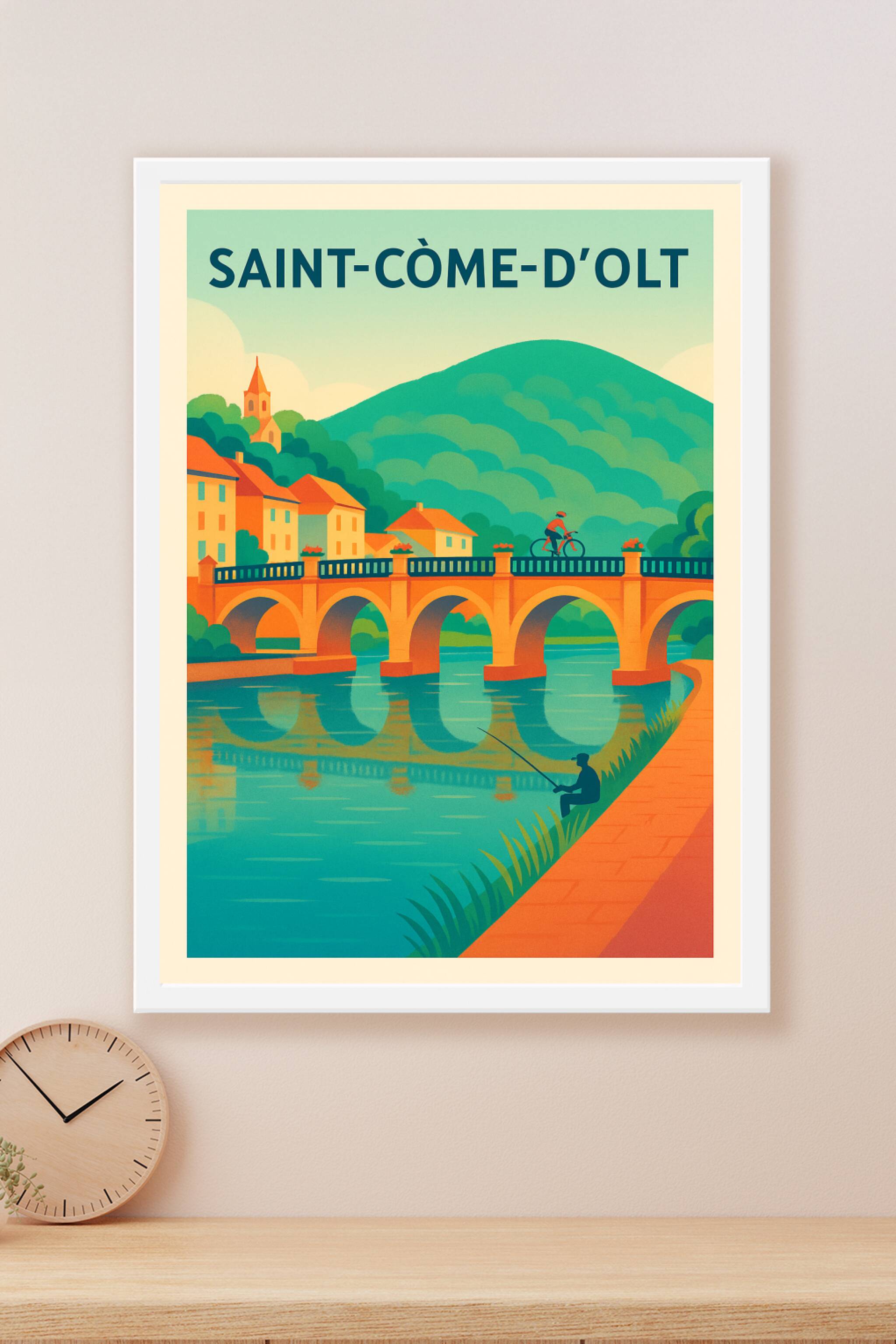 Découvrez le charme paisible de Saint-Côme-d'Olt à travers cette affiche illustrée mettant en scène son pont emblématique et ses paysages verdoyant...