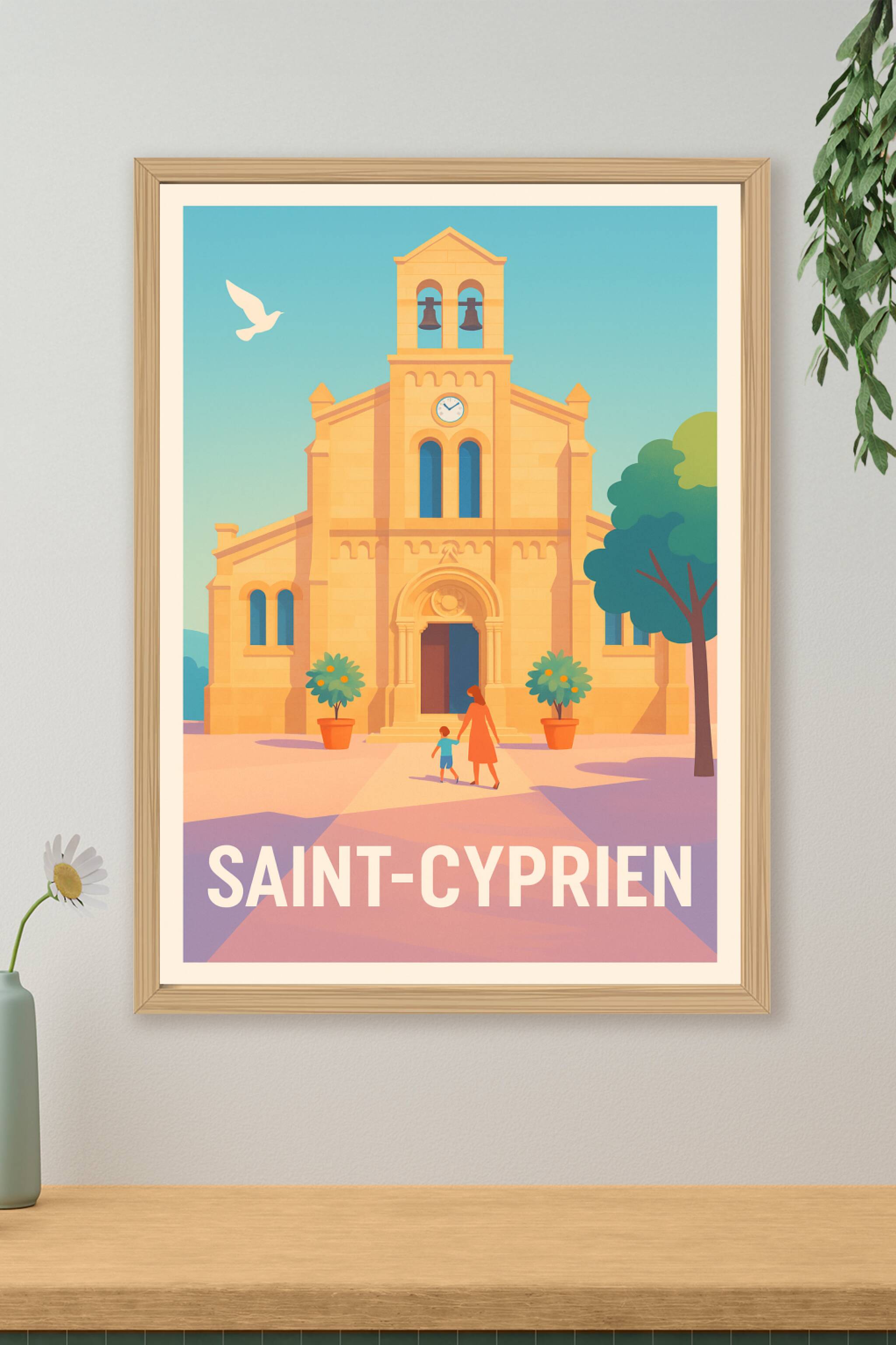 Découvrez l'élégance paisible de Saint-Cyprien avec cette affiche illustrée mettant en scène son église emblématique, baignée par une lumière douce...