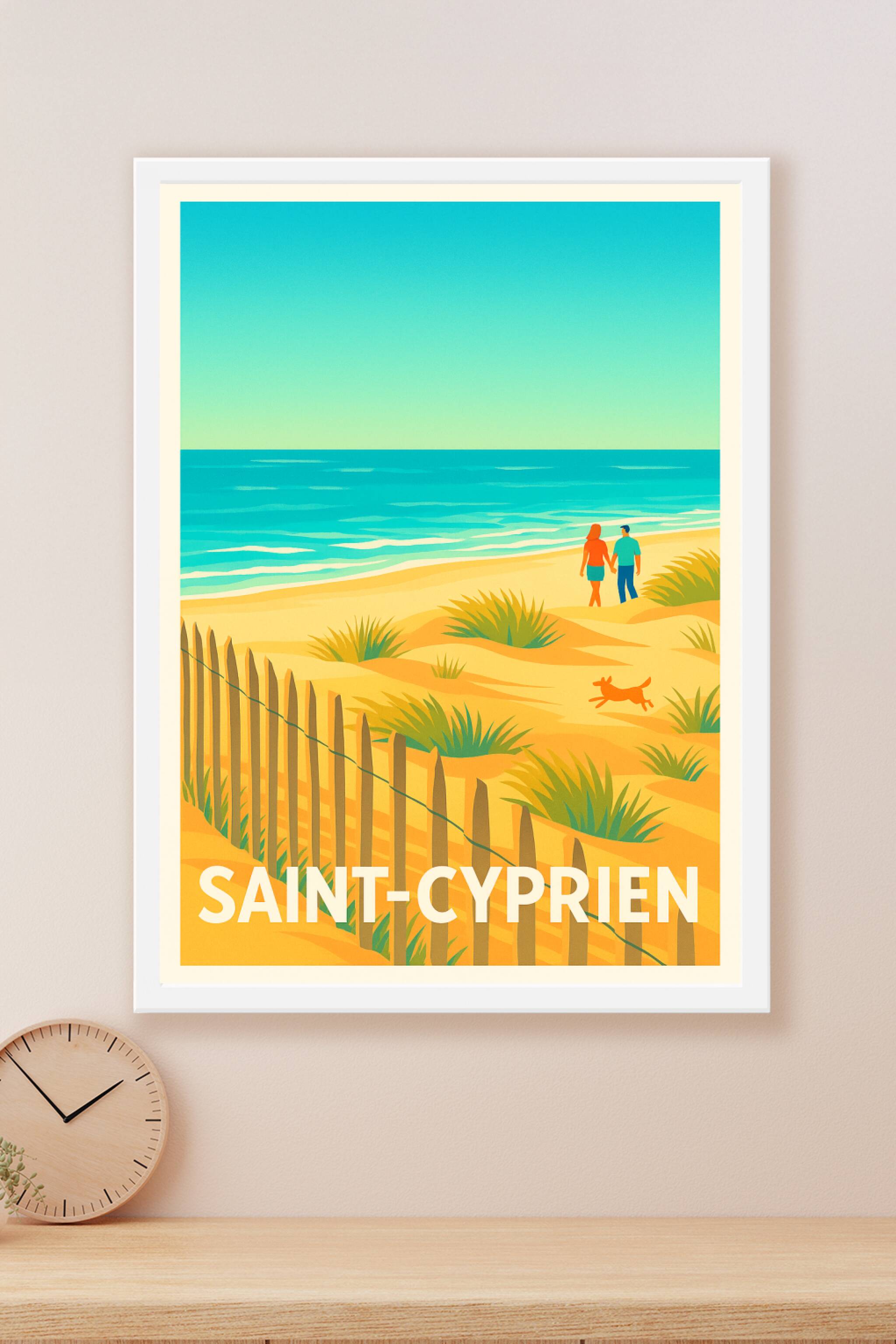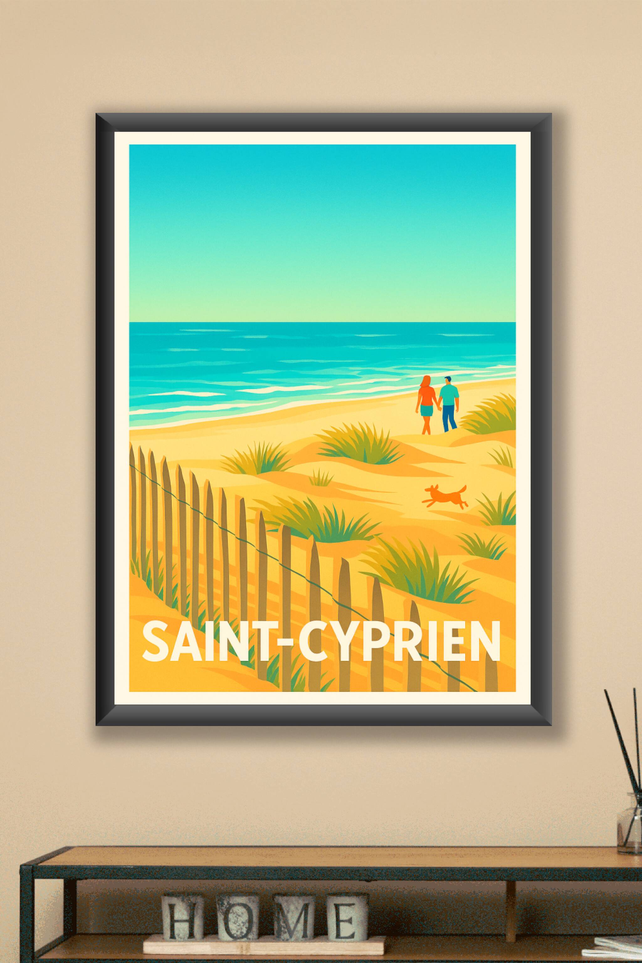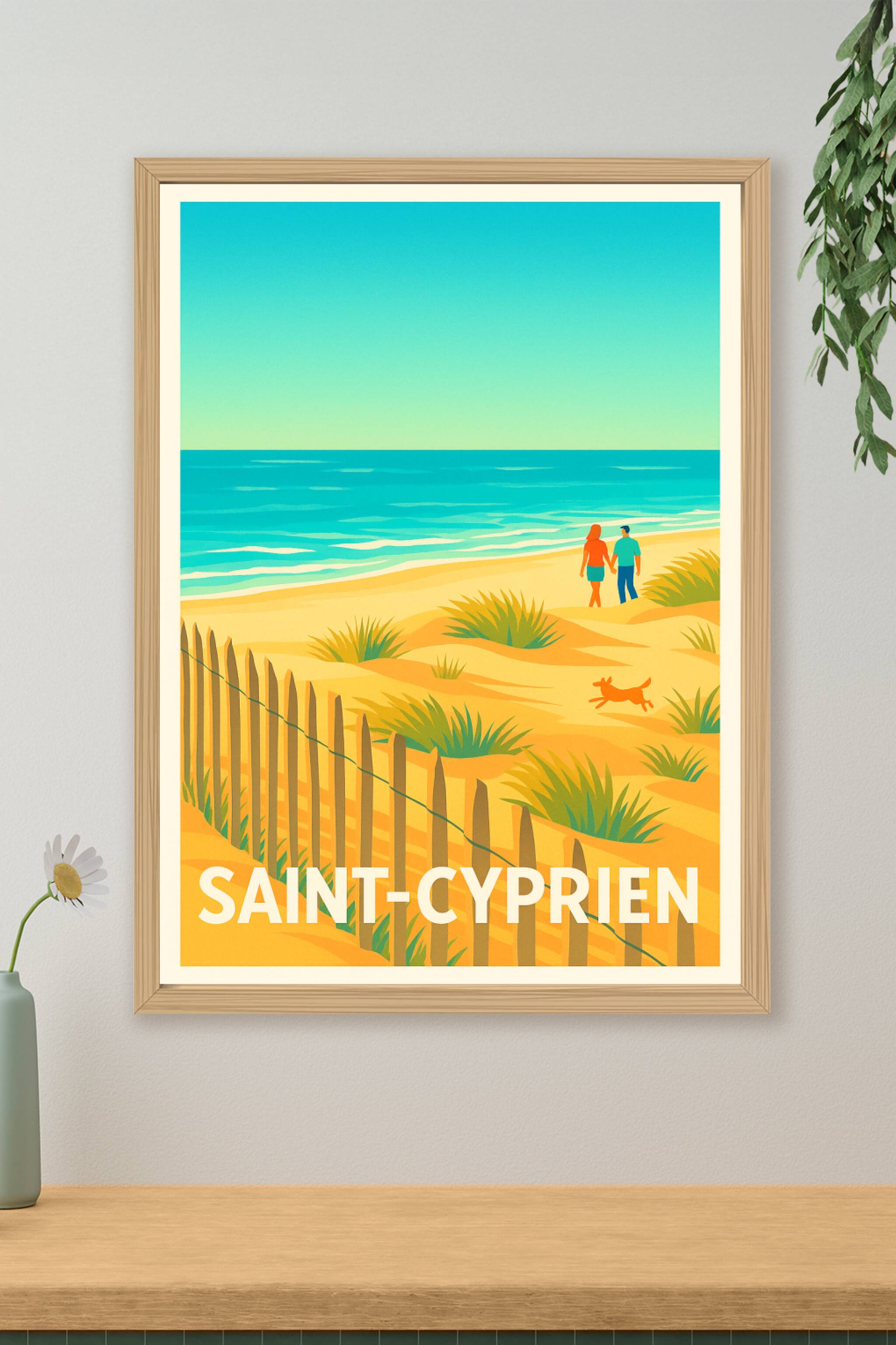 Embarquez pour une escapade relaxante sur la plage ensoleillée de Saint-Cyprien avec cette affiche vintage aux couleurs chaudes et apaisantes. Illustrant un couple et un chien profitant du sable fin et des dunes bordées par la mer turquoise, ce poster apporte une ambiance douce et estivale à votre intérieur. Ce magnifique poster est disponible en tirage "Fine Art" sur papier coton 305g, garantissant une qualité d'impression exceptionnelle et une tenue durable des couleurs. Choisissez parmi les formats A1 à A4, avec ou sans cadre, pour cadrer parfaitement votre espace déco. 100% fabriqué en France, ce poster Saint-Cyprien sublimera votre maison ou fera un cadeau idéal pour les amoureux des paysages marins et des moments de détente.