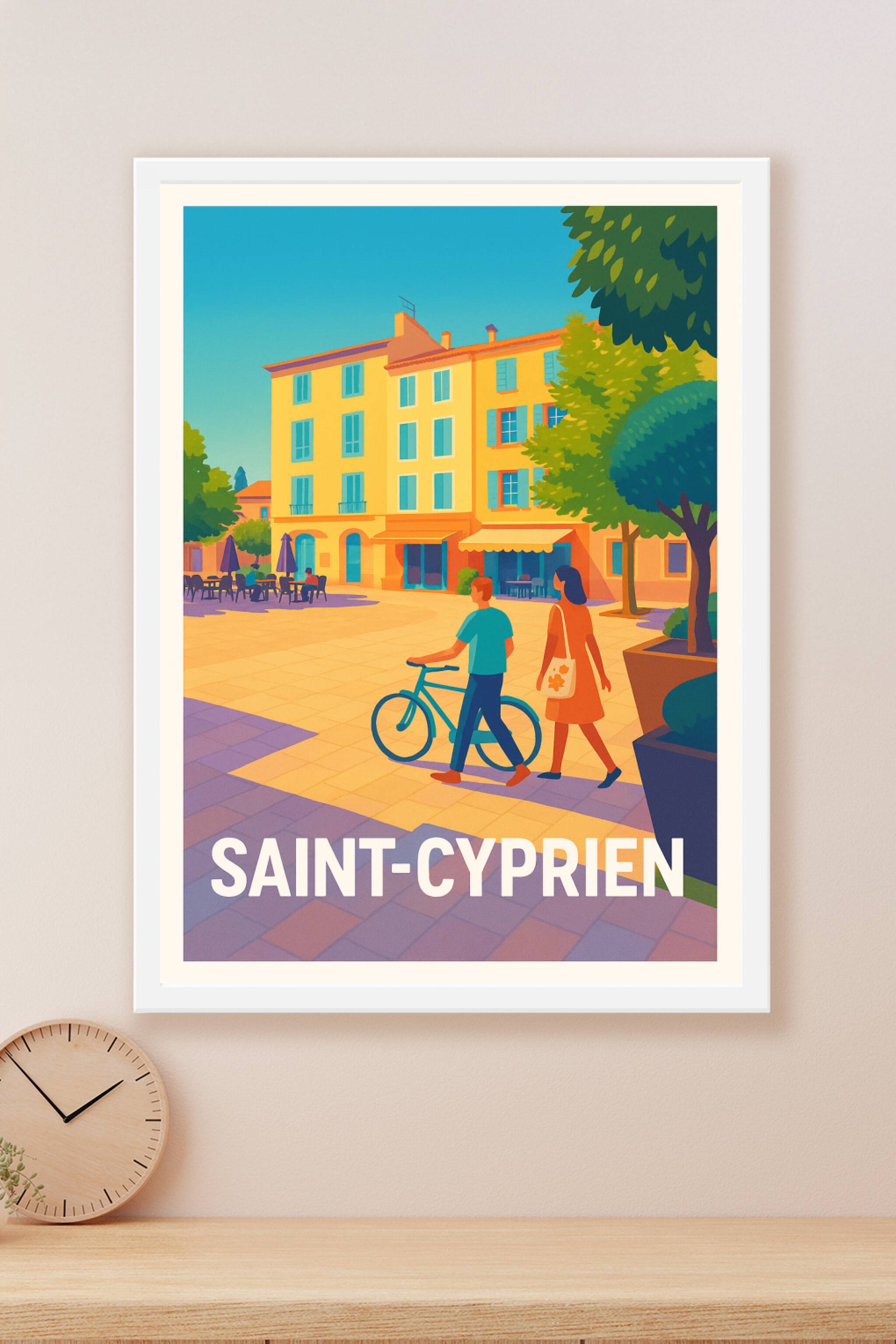 Découvrez la douceur de vivre à Saint-Cyprien avec cette affiche illustrant une scène paisible sous un ciel azur. Ce poster captures l'essence des ...