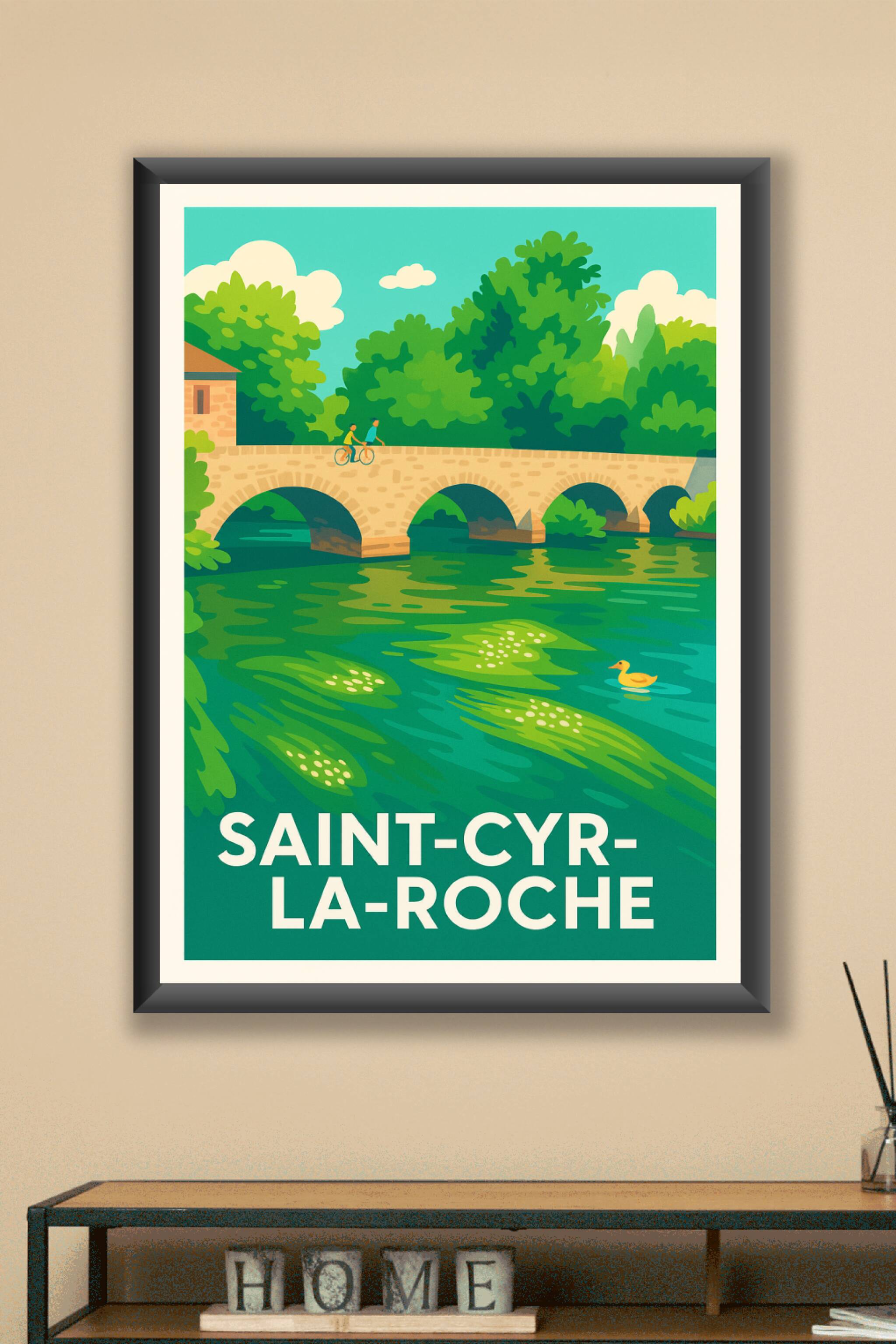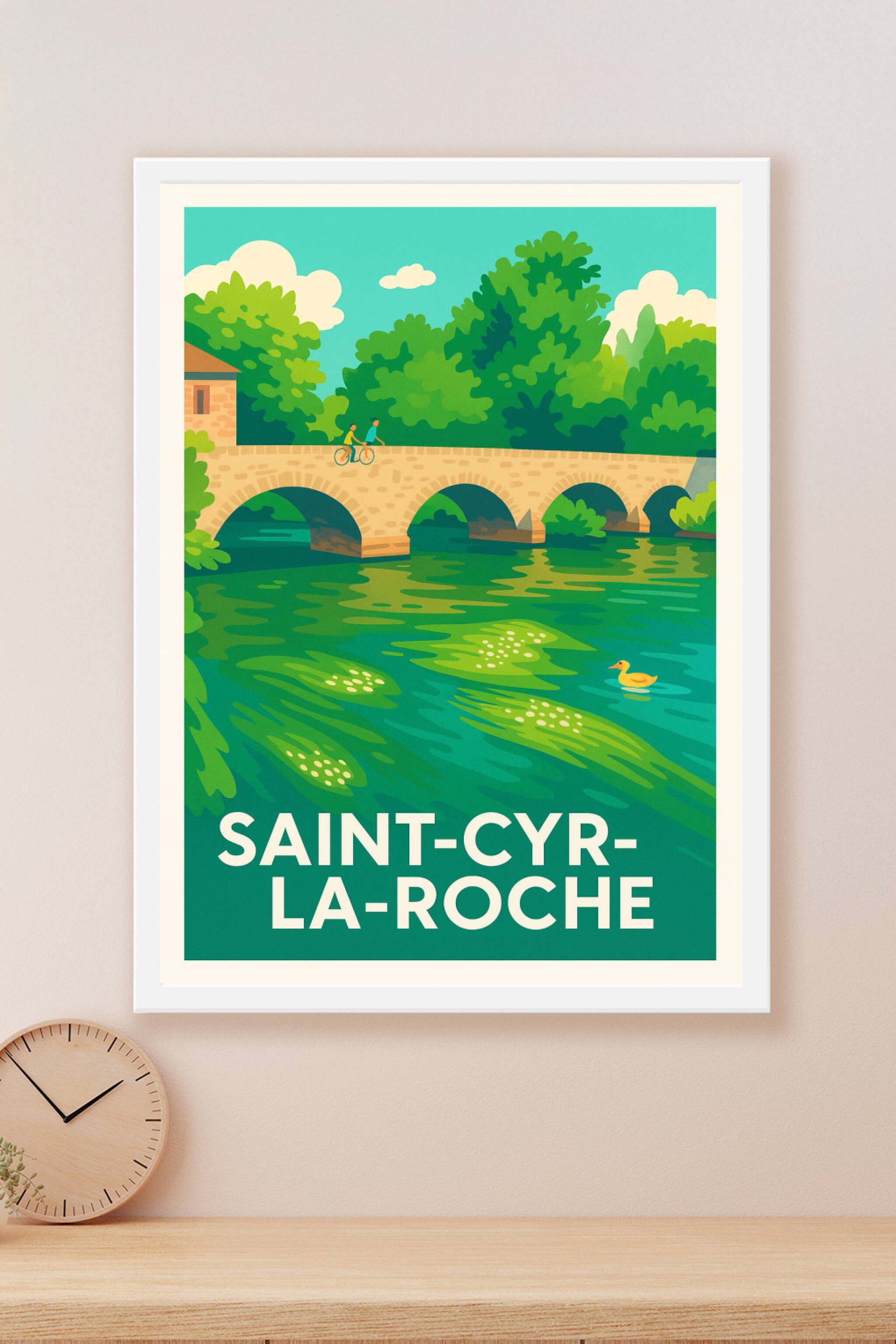 Découvrez Saint-Cyr-la-Roche à travers cette affiche illustrée qui capture la douceur de vivre au cœur d'un paysage verdoyant et paisible. Le pont ...