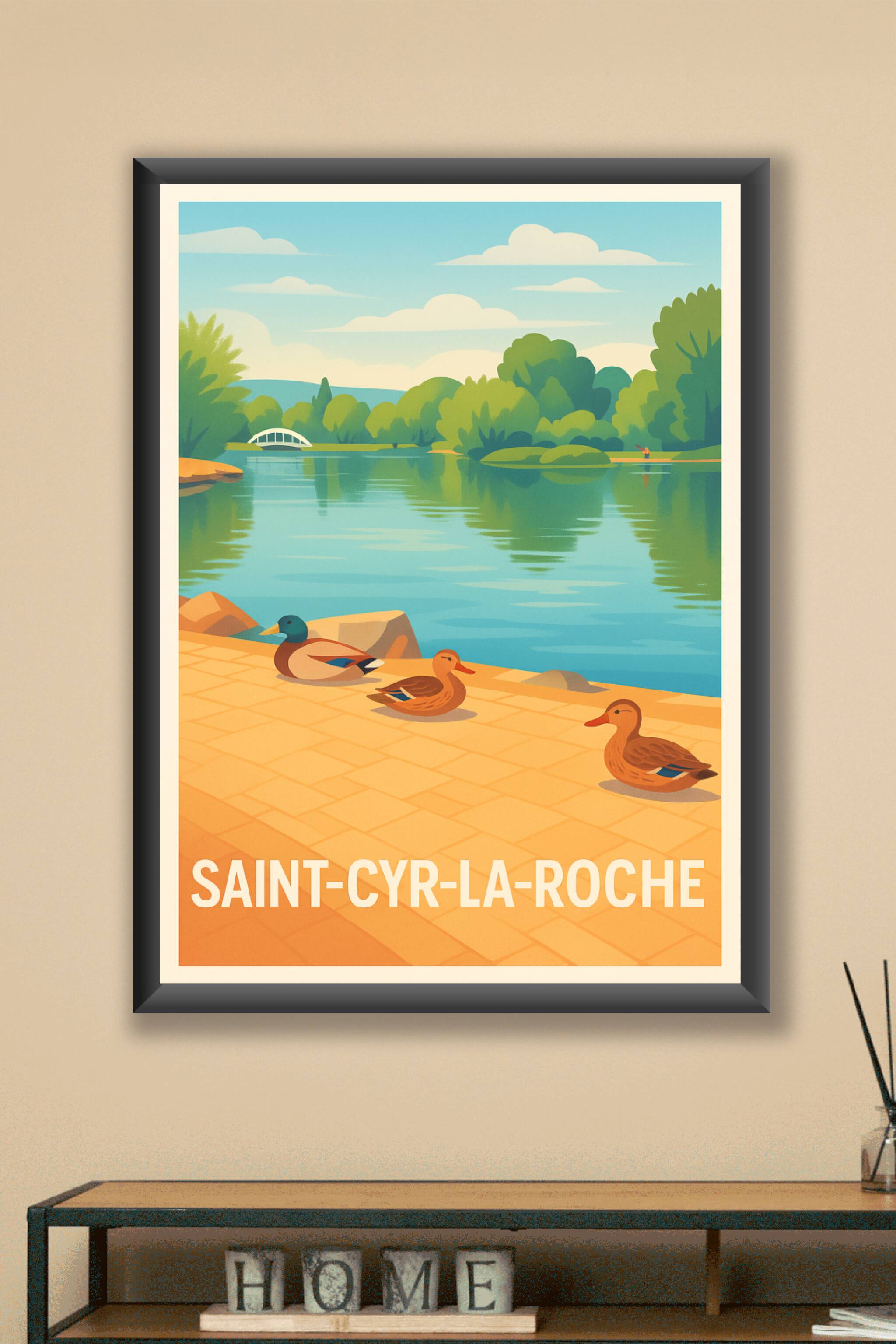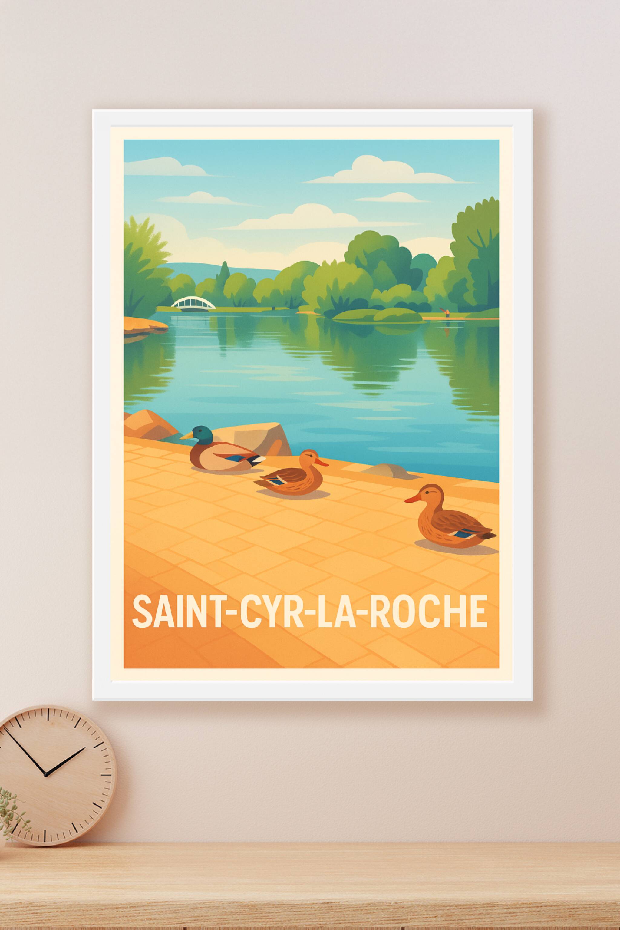 Découvrez la sérénité de Saint-Cyr-la-Roche avec cette affiche au style doux et chaleureux, illustrant un paisible paysage au bord d'une rivière où...