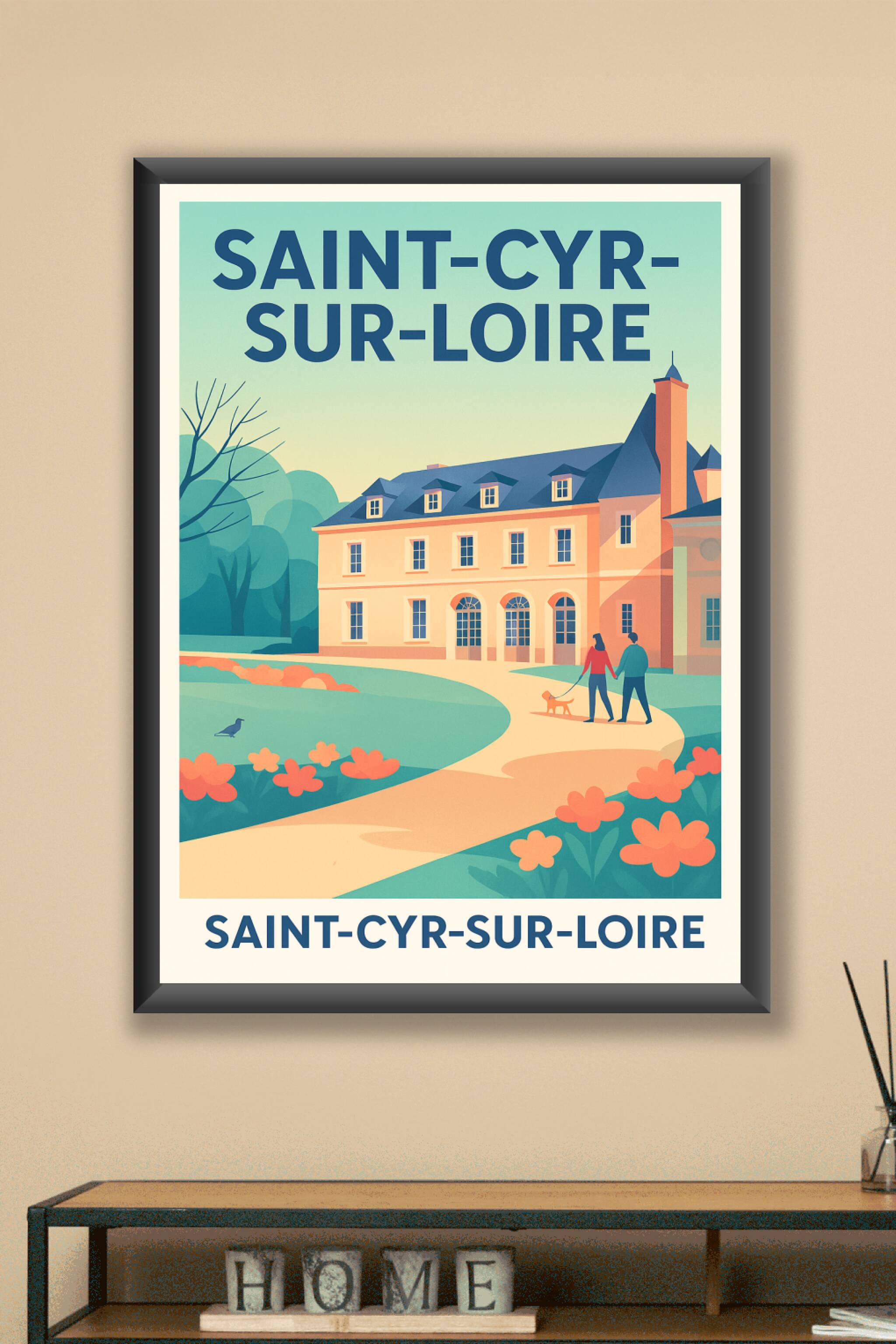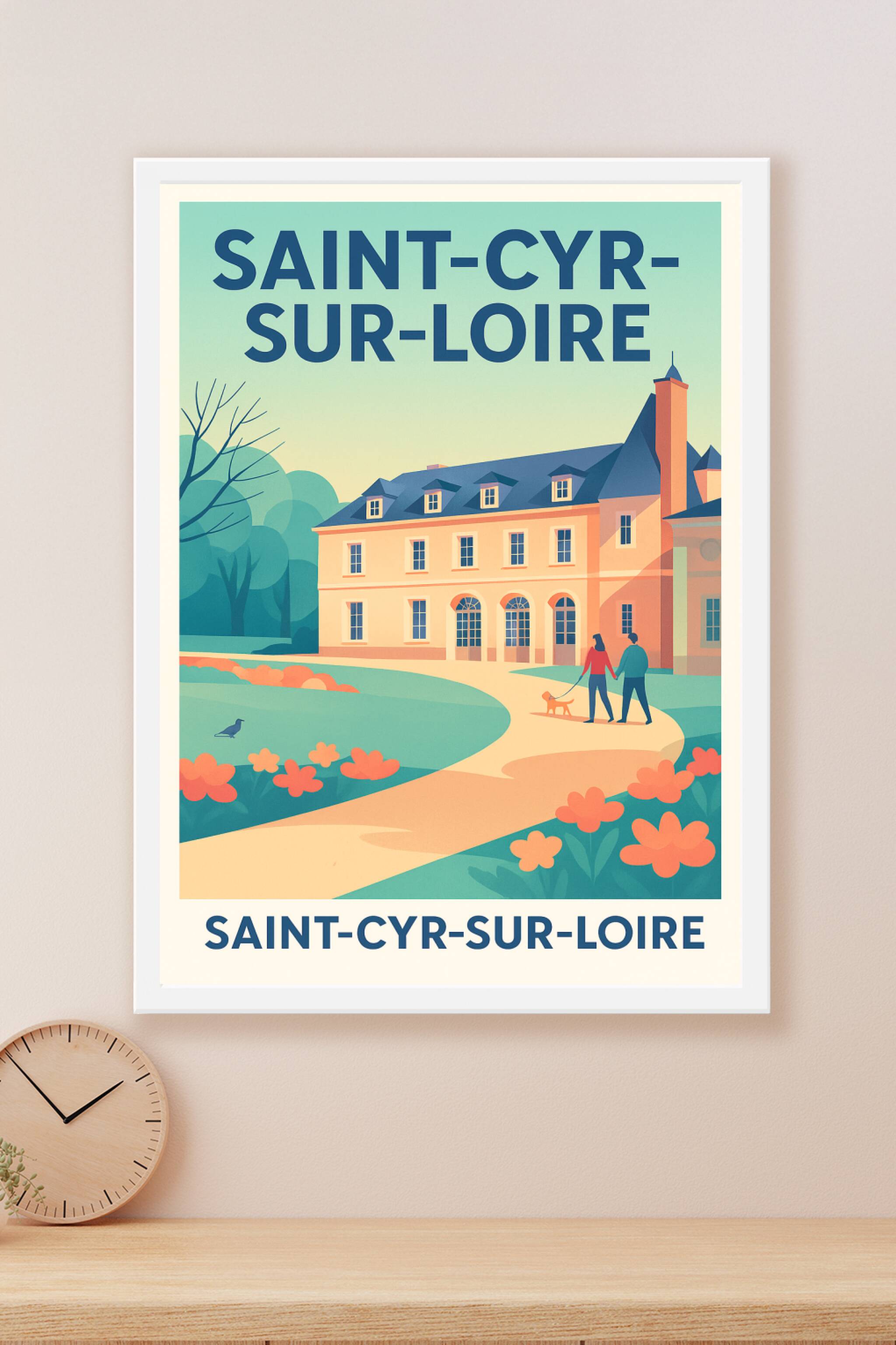 Découvrez l'élégance tranquille de Saint-Cyr-sur-Loire avec cette affiche illustrée dans un style vintage moderne. Ce poster met en avant l'archite...