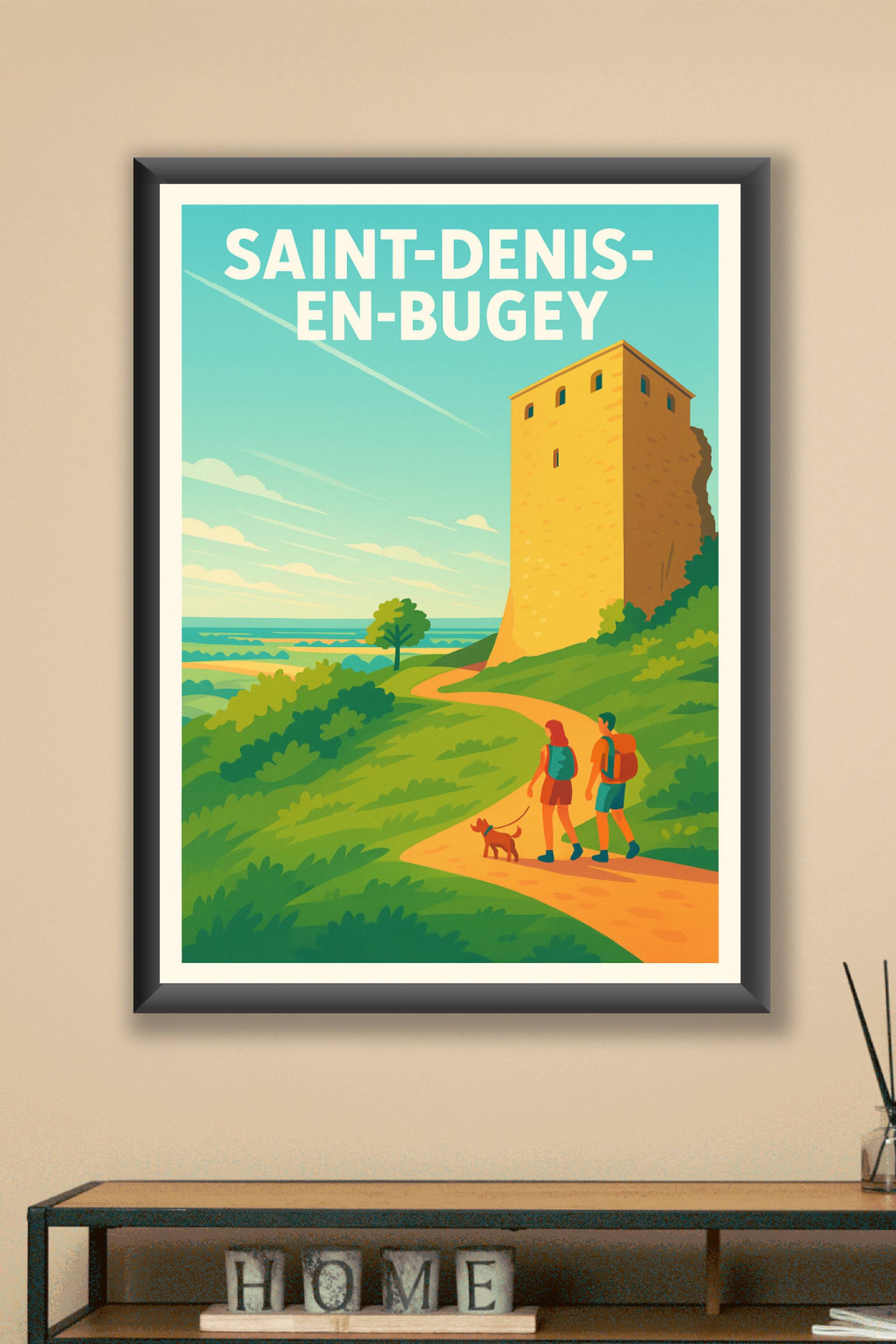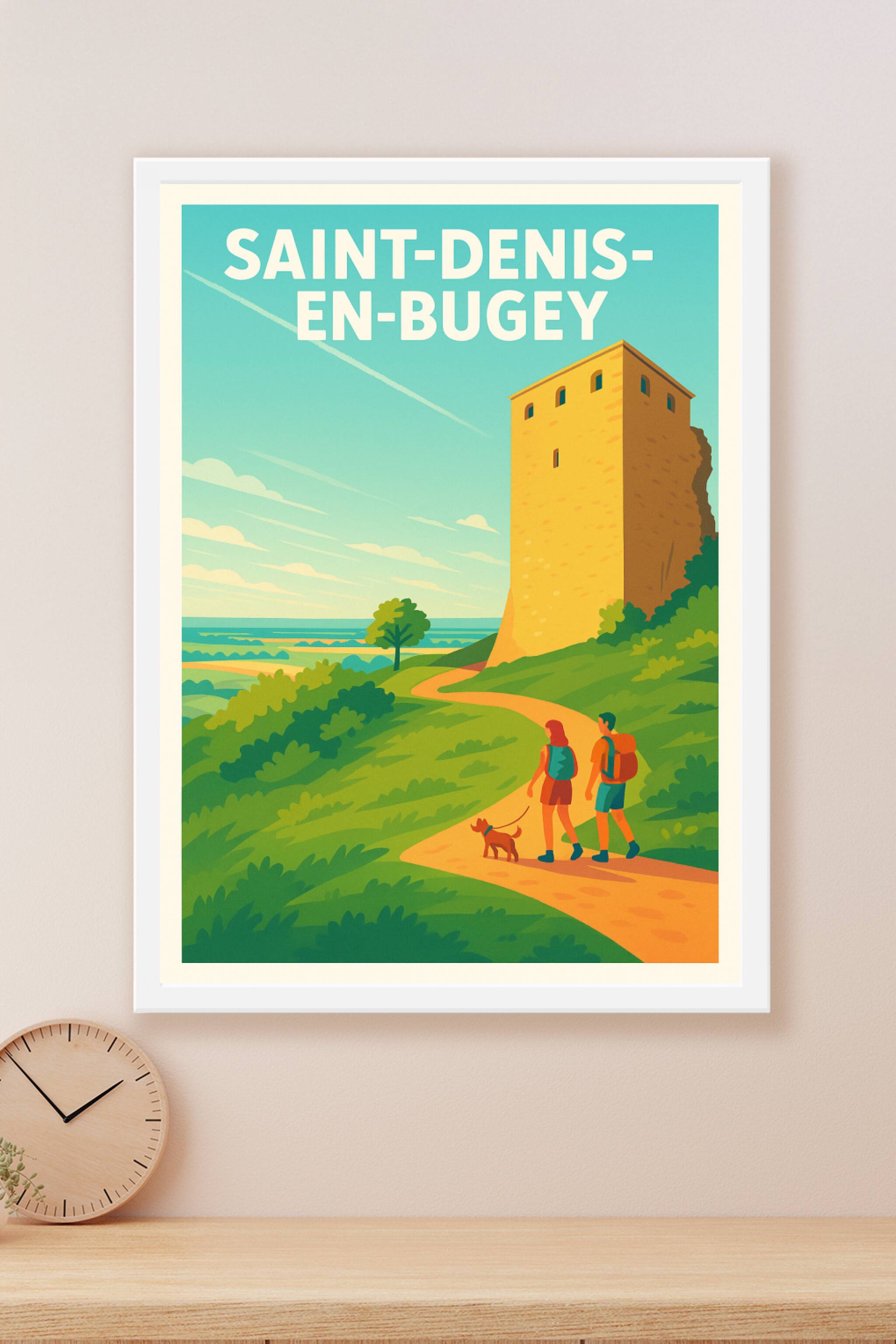 Découvrez la beauté paisible de Saint-Denis-en-Bugey à travers cette affiche au design vintage et lumineux. Le poster met en scène un sentier champêtre bordé de verdure menant à une tour historique, illustrant parfaitement l'ambiance sereine de cette destination idéale pour les amoureux de randonnée et de paysages authentiques. Ce poster est imprimé en tirage "Fine Art" sur papier 305g coton, garantissant une qualité d'impression haut de gamme et une longévité exceptionnelle. Disponible en formats A1 à A4, avec ou sans cadre, cette affiche raffinée saura sublimer votre intérieur ou faire un cadeau parfait pour les passionnés de voyage et nature. Un must-have pour enrichir votre décoration avec une touche d'évasion douce et élégante.