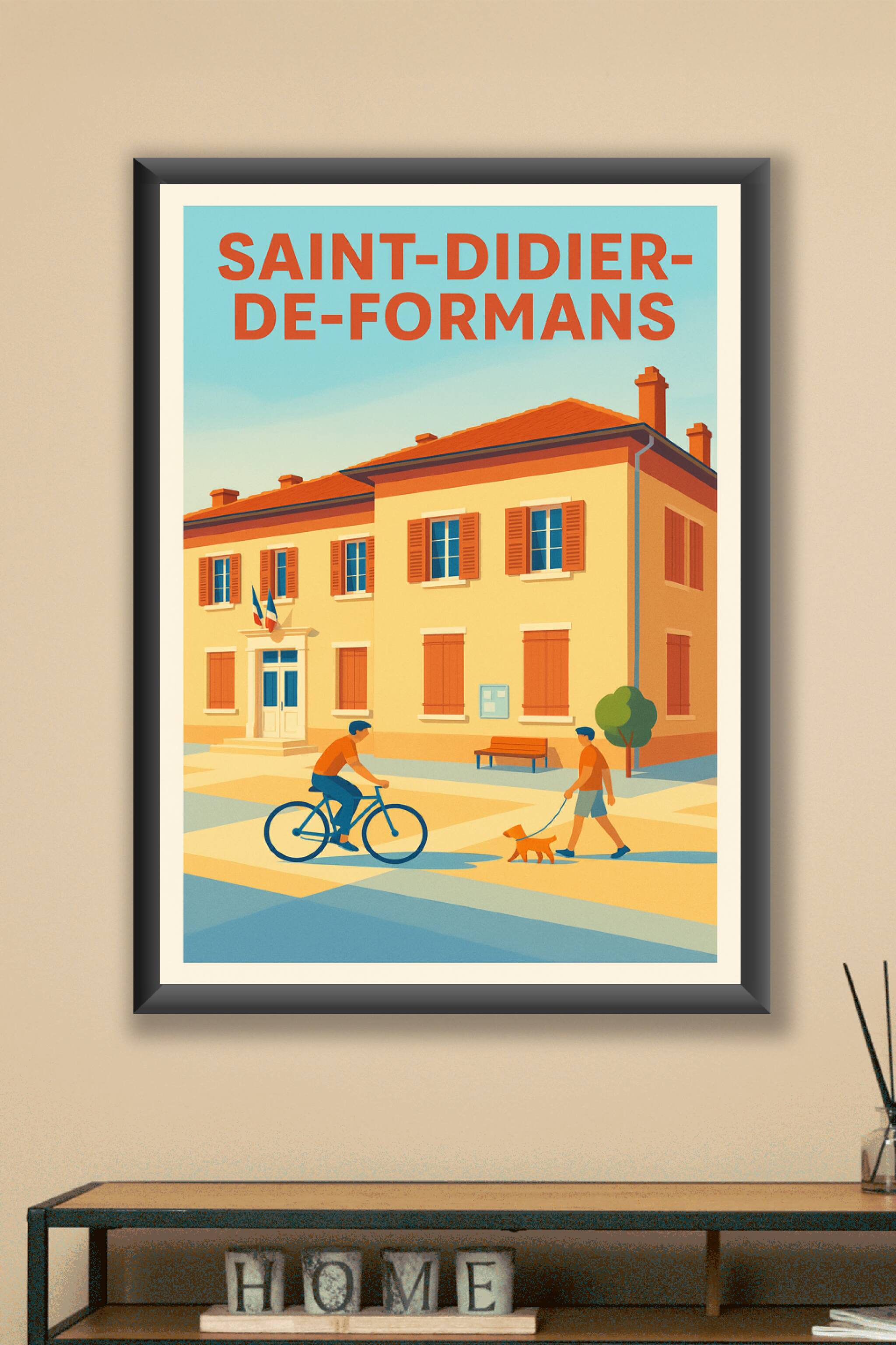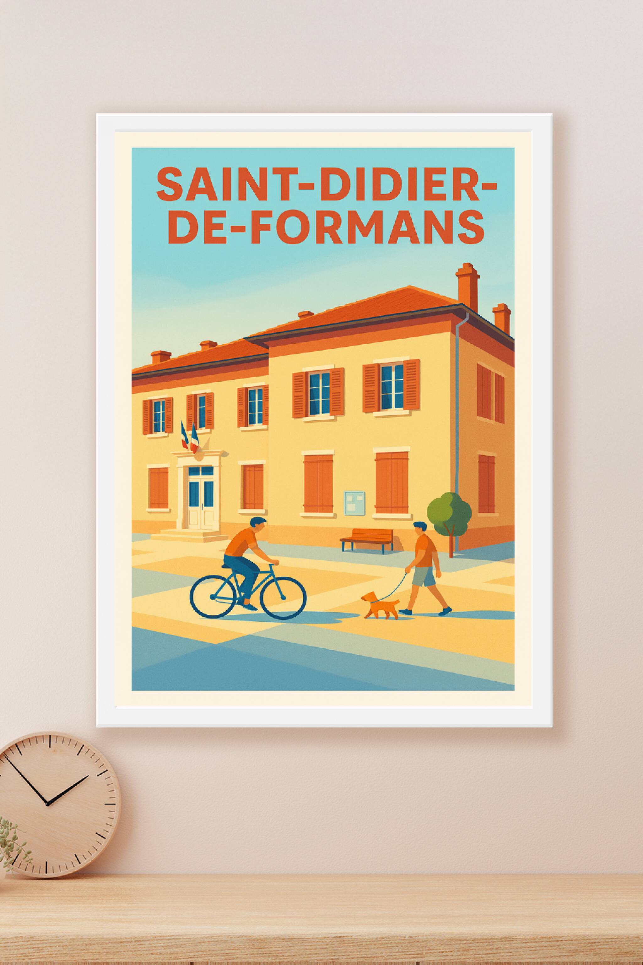 Découvrez l'ambiance tranquille et conviviale de Saint-Didier-de-Formans avec cette affiche illustrée aux couleurs chaleureuses et lumineuses. Le poster capture un instant du quotidien avec ses habitants à vélo et en promenade, devant un bâtiment typique de la ville. Imprimée en tirage "Fine Art" sur un papier 305g coton, cette affiche garantit une qualité d'impression exceptionnelle et une durabilité optimale. Disponible en plusieurs formats du A1 au A4, avec ou sans cadre, elle s'adapte parfaitement à tous les styles d'intérieur. Offrez-vous ce souvenir unique ou décorez votre espace avec une touche authentique et raffinée made in France.