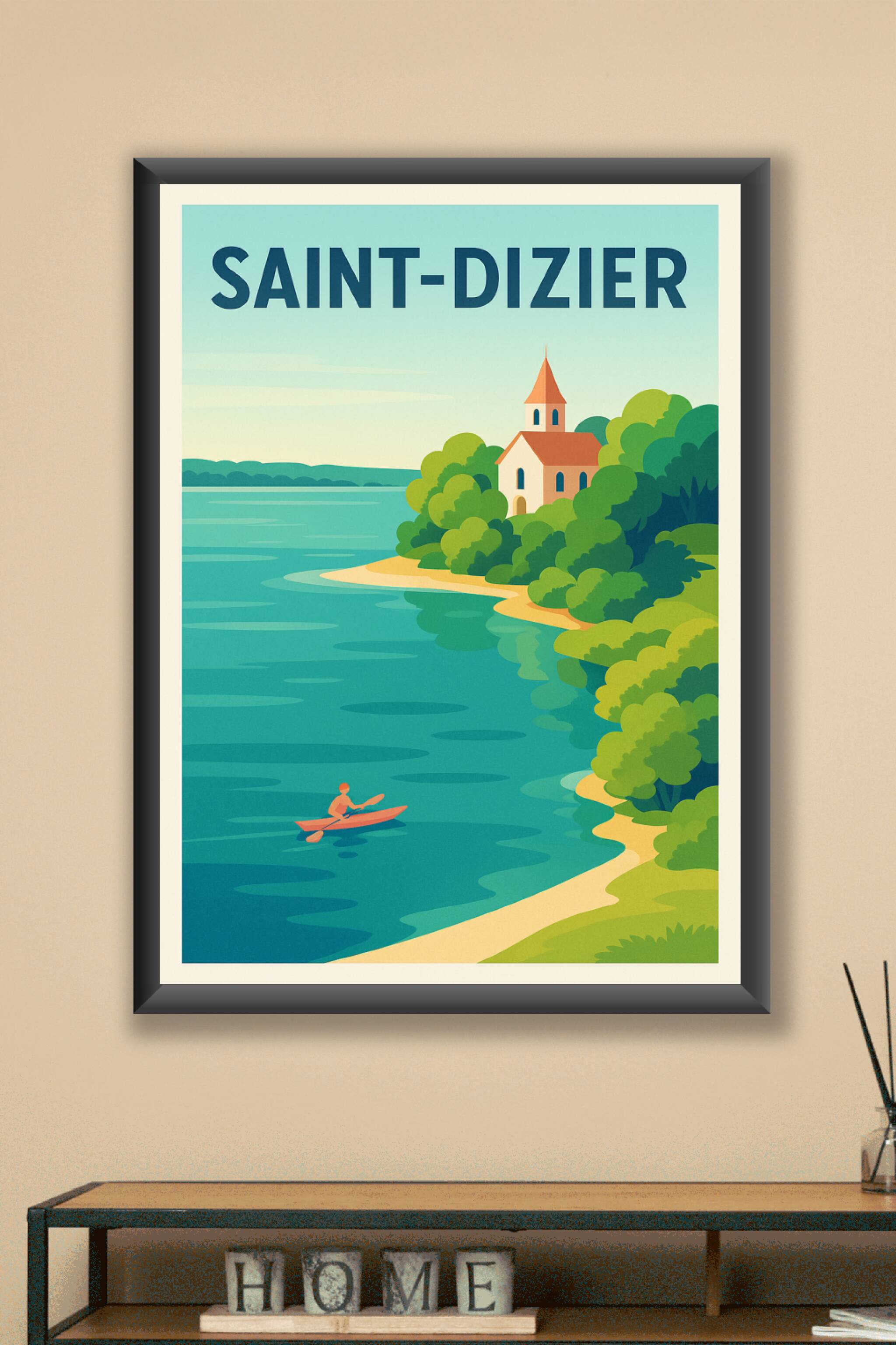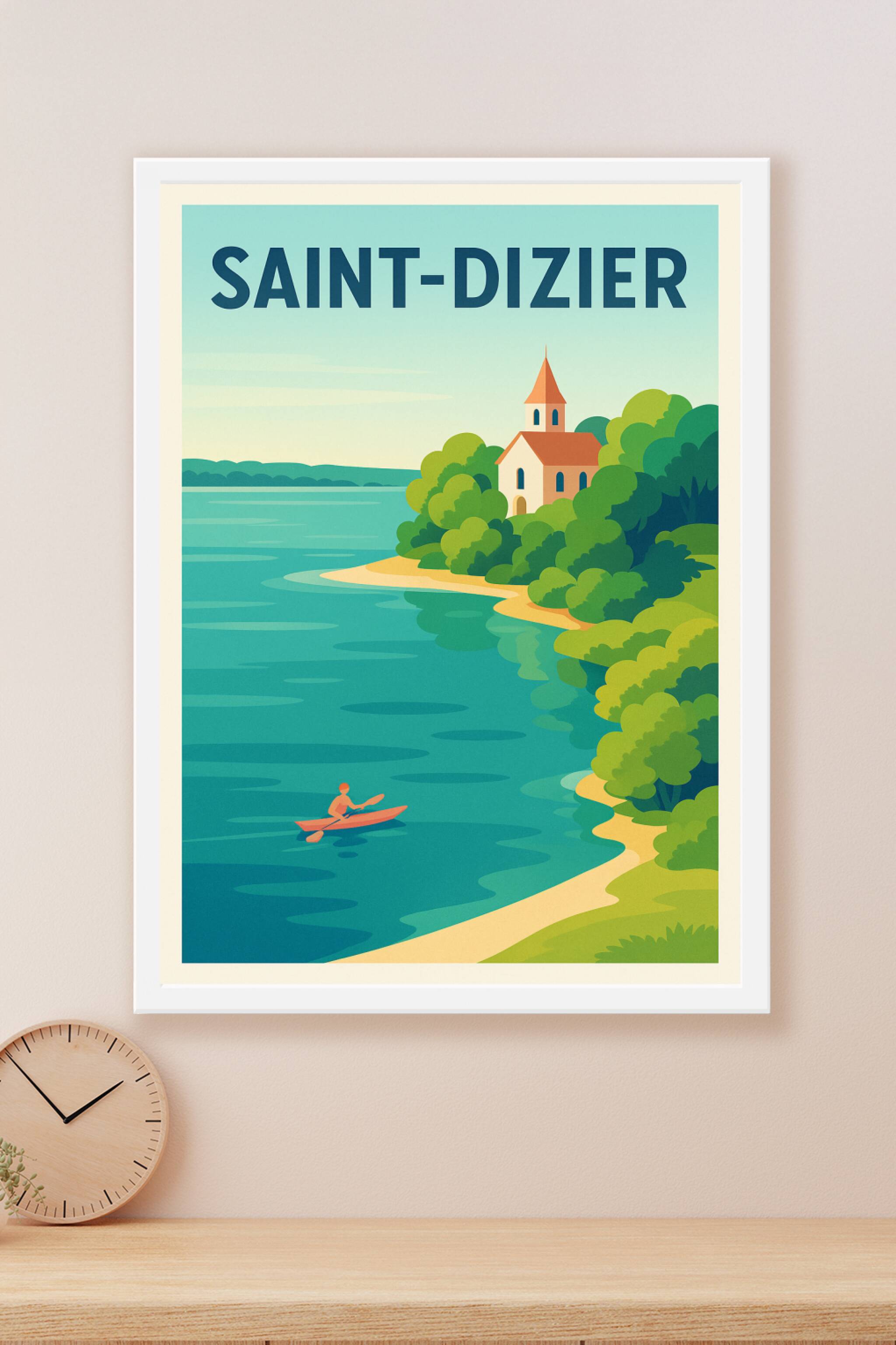 Découvrez la sérénité des paysages de Saint-Dizier avec cette affiche illustrée mettant en scène un kayakiste naviguant sur une eau calme, bordée d...