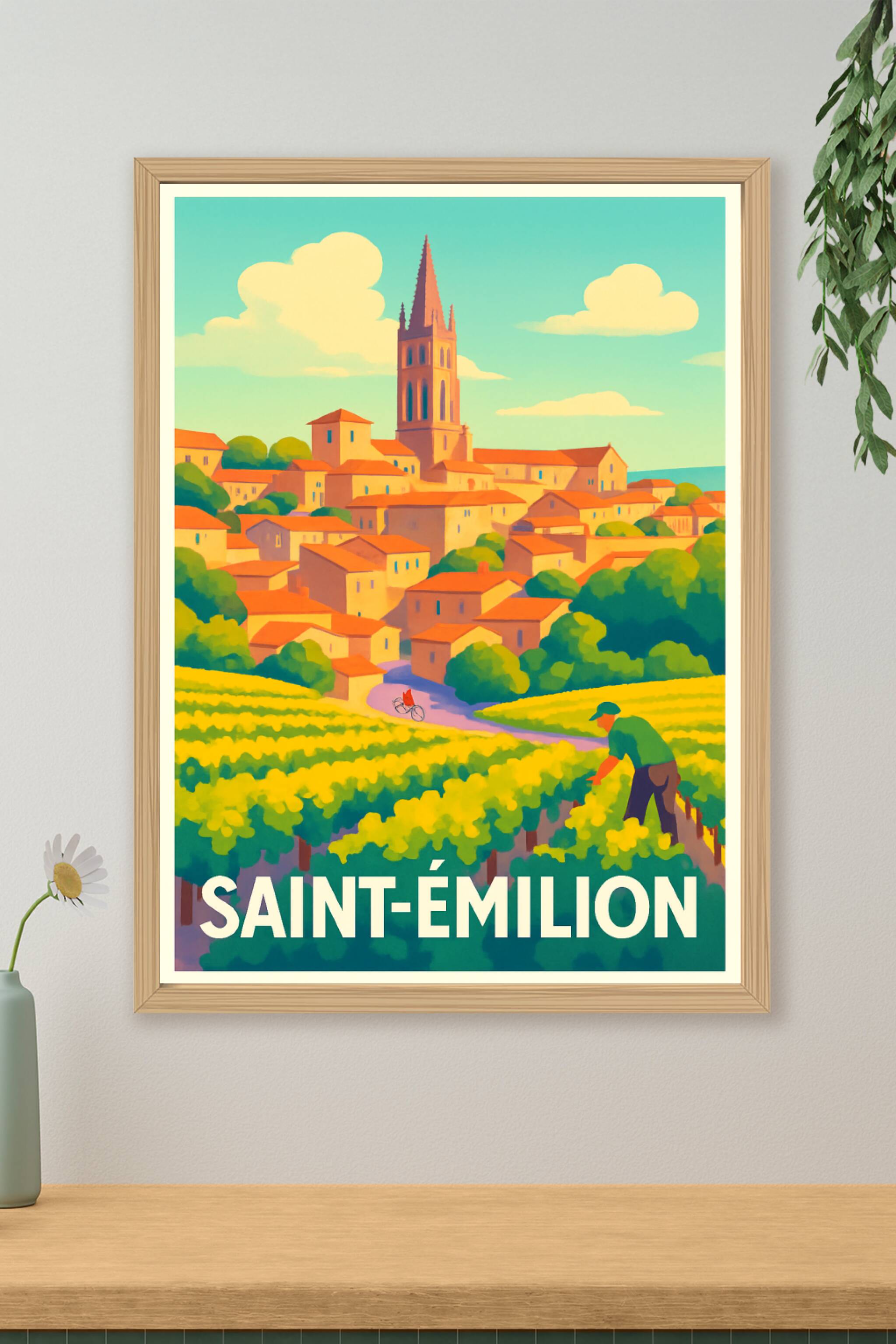 Découvrez la charmante ville de Saint-Émilion à travers cette affiche illustrée mettant en scène ses vignobles emblématiques sous une lumière chaleureuse et apaisante. Le poster capture l'essence de ce village réputé pour sa production de vins d'exception et son architecture médiévale, avec ses toits aux teintes ocres et sa célèbre église au clocher imposant.