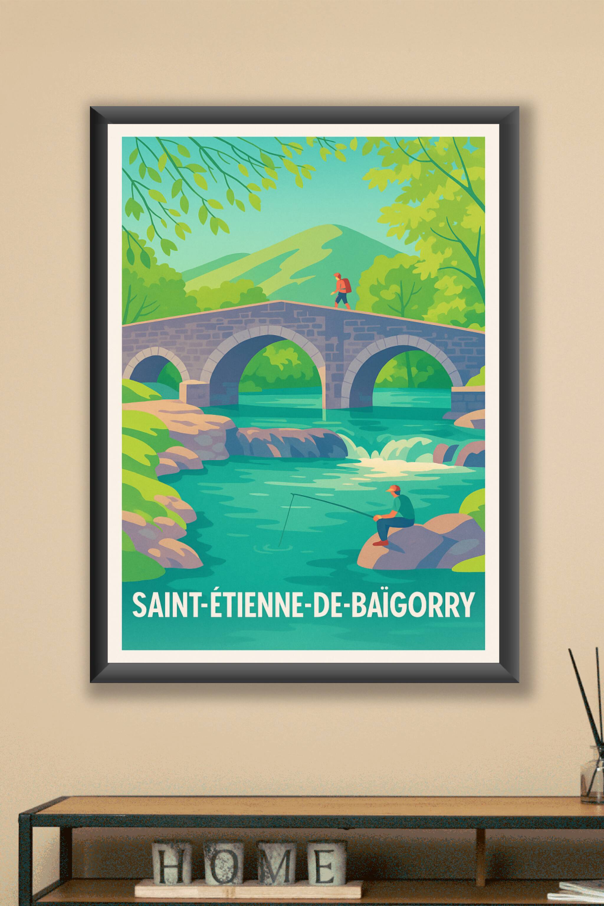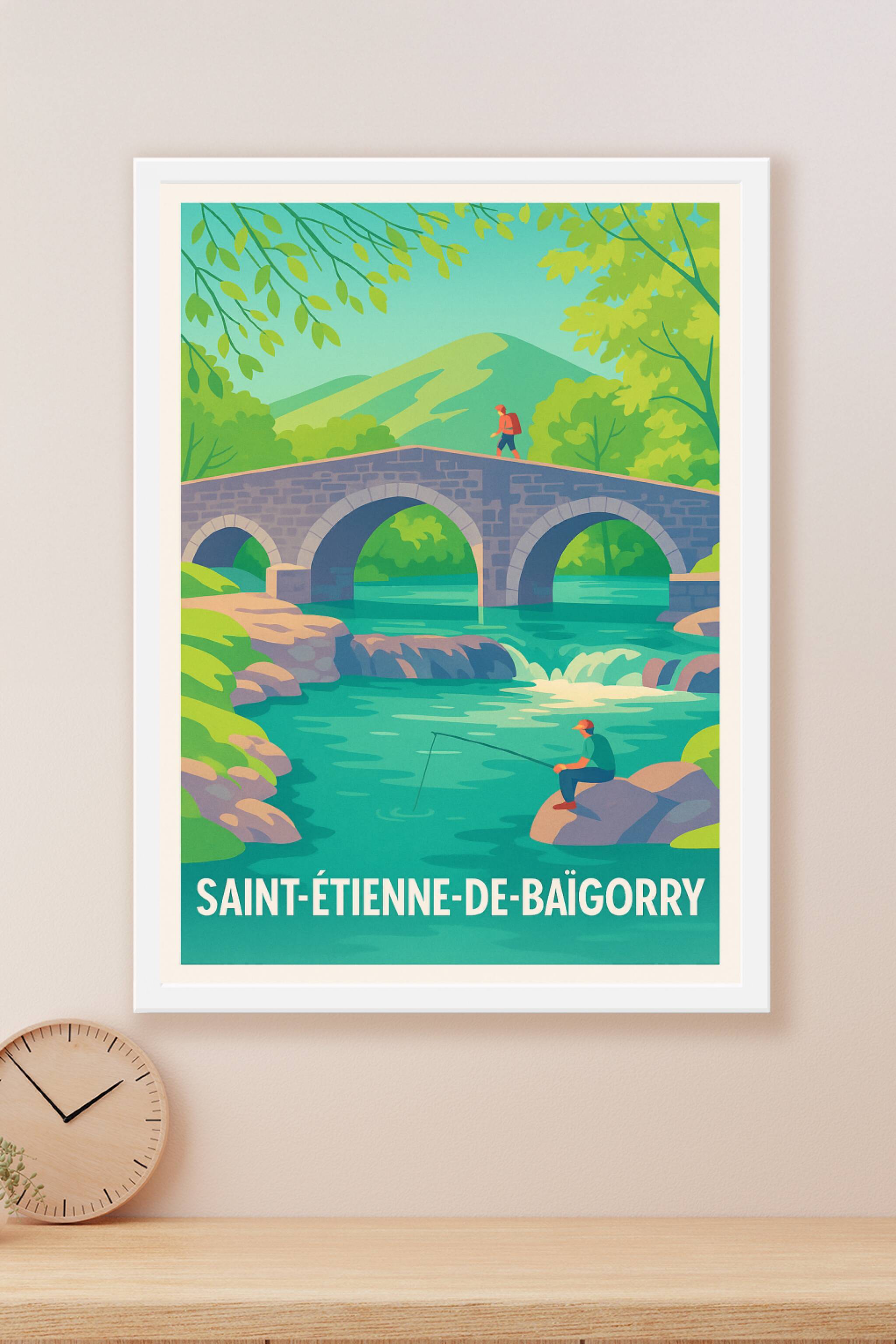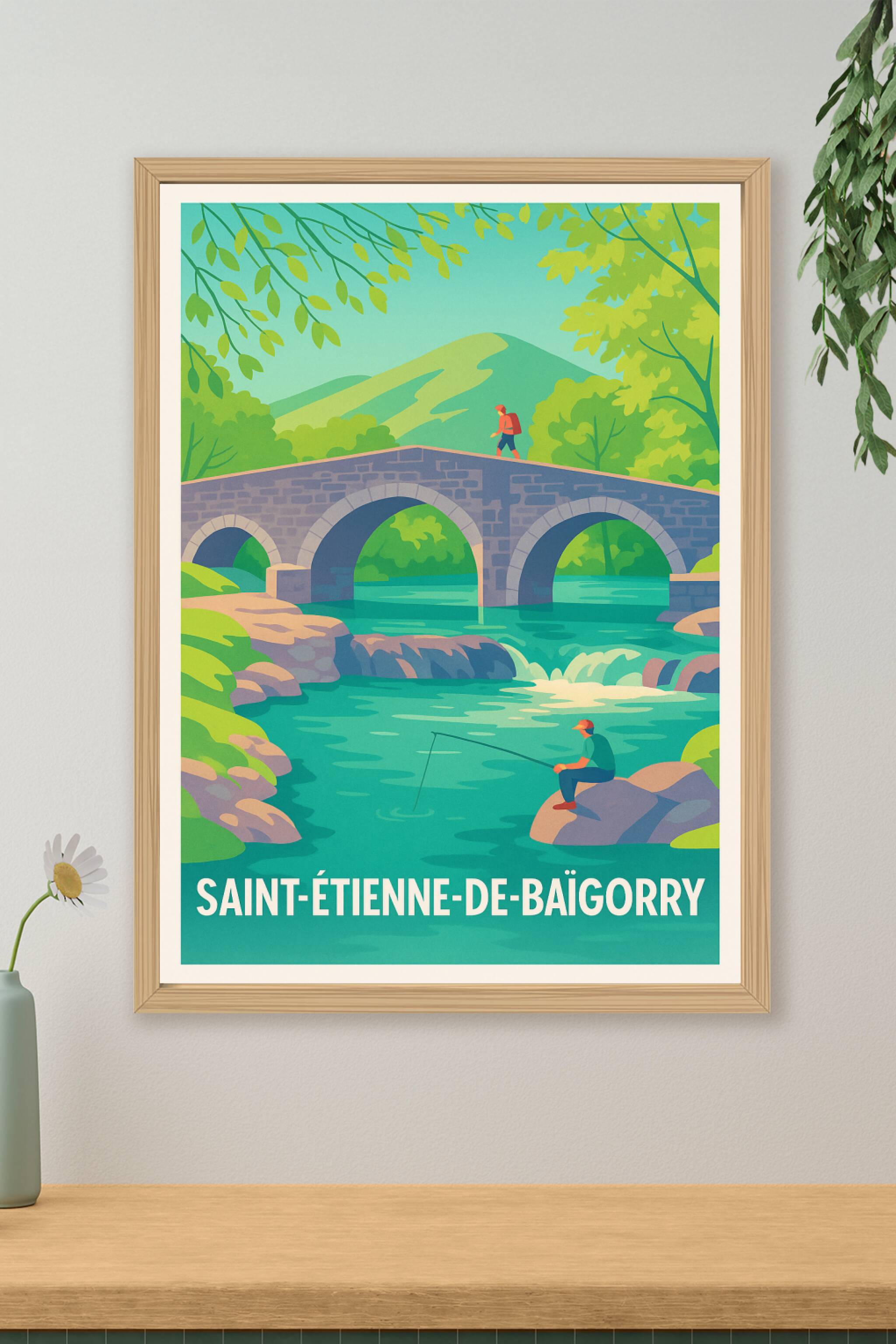 Découvrez la sérénité de Saint-Étienne-de-Baïgorry avec cette affiche élégante qui met en valeur son pont de pierre iconique, son cours d'eau limpi...