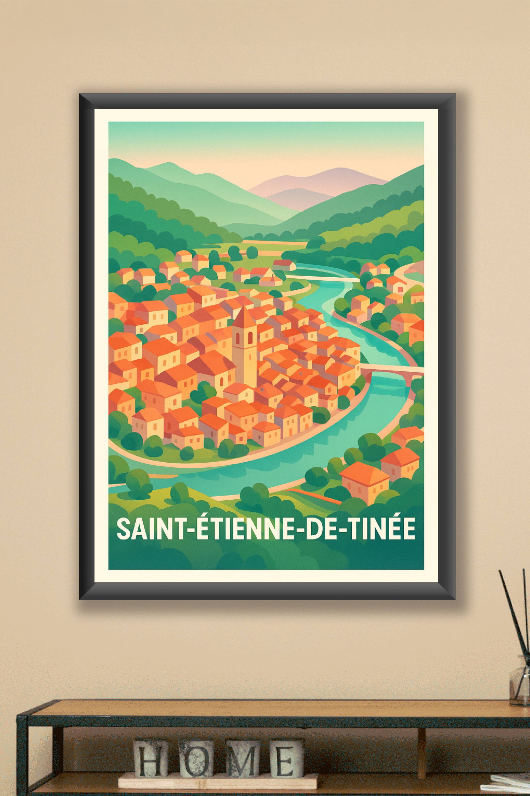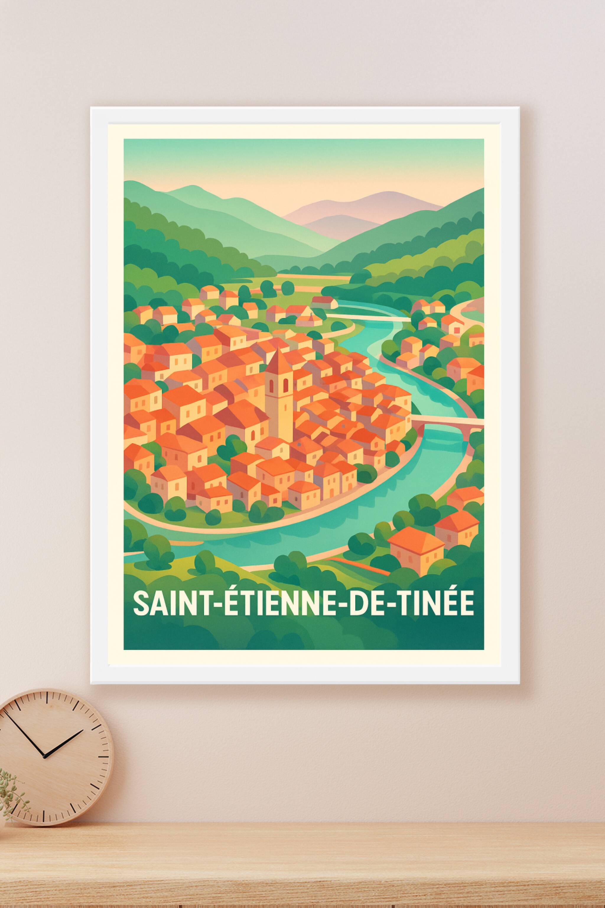 Découvrez le charme pittoresque de Saint-Étienne-de-Tinée avec cette affiche illustrée dans un style doux et coloré, mettant en valeur le village niché entre les montagnes et le cours d'eau sinueux. Ce poster est idéal pour apporter une ambiance chaleureuse et bucolique à votre intérieur. Imprimé en tirage "Fine Art" sur papier 305g coton, il garantit une qualité d'impression exceptionnelle et un rendu des couleurs durable et éclatant. Disponible en formats A1 à A4, avec ou sans cadre, cette affiche est parfaite pour décorer votre maison ou offrir un souvenir élégant de cette magnifique région alpine.