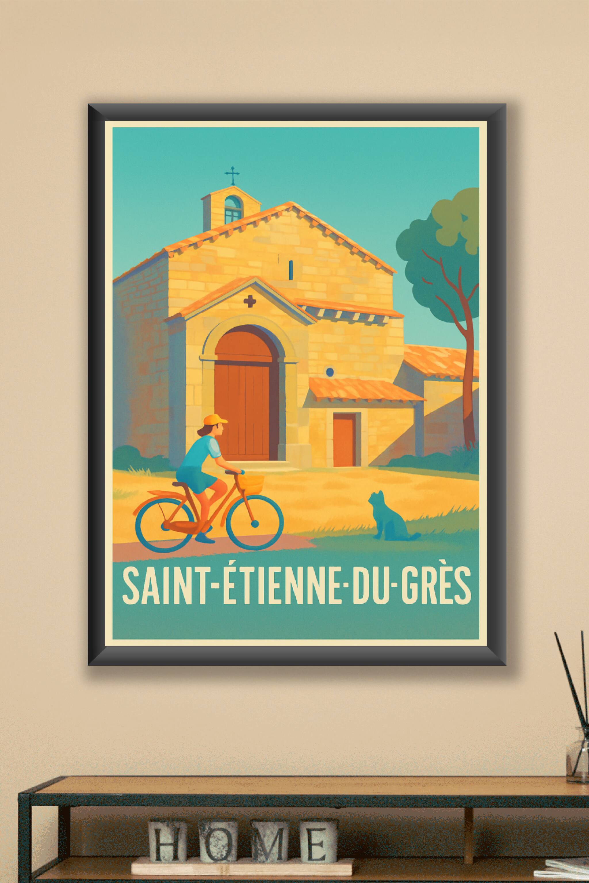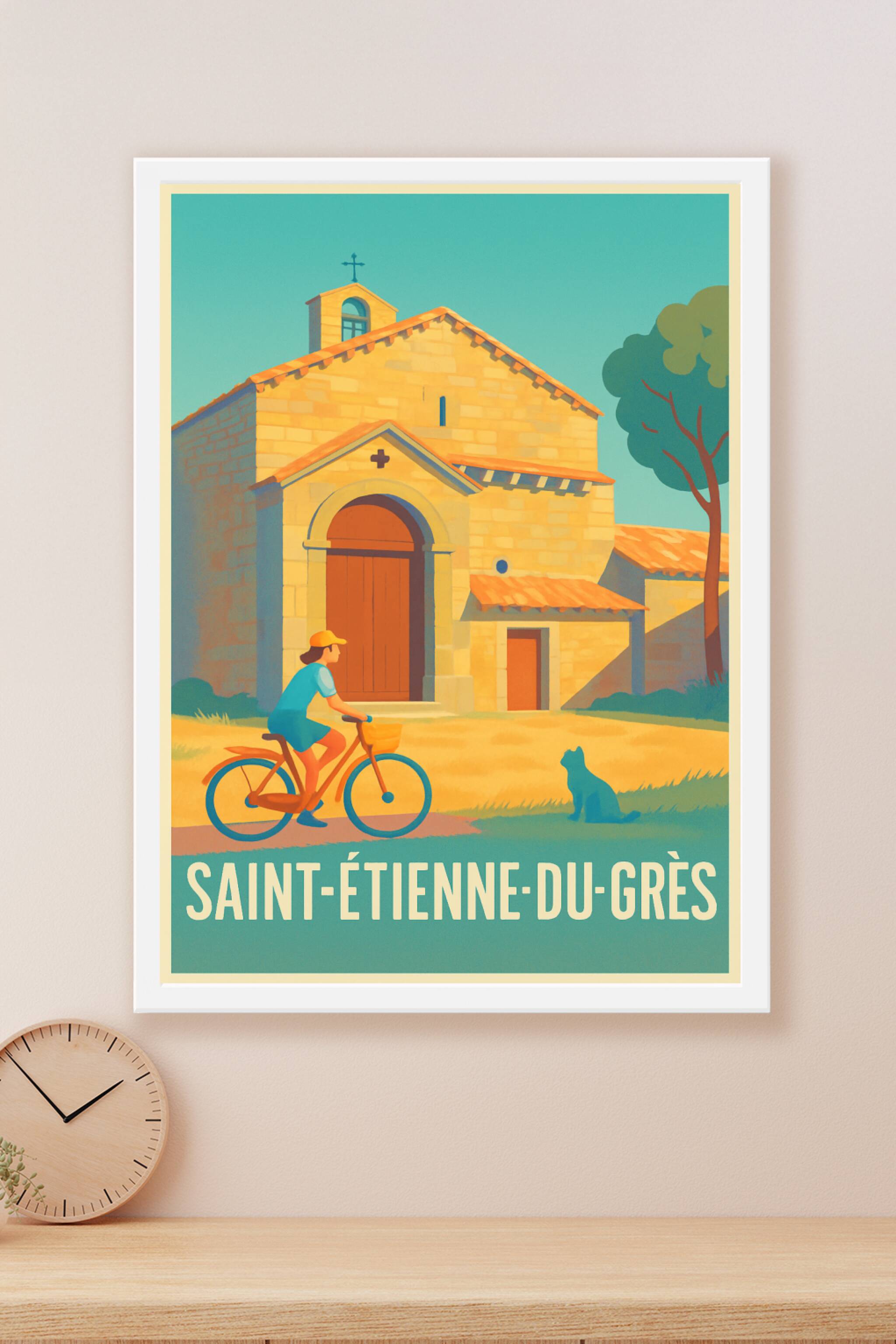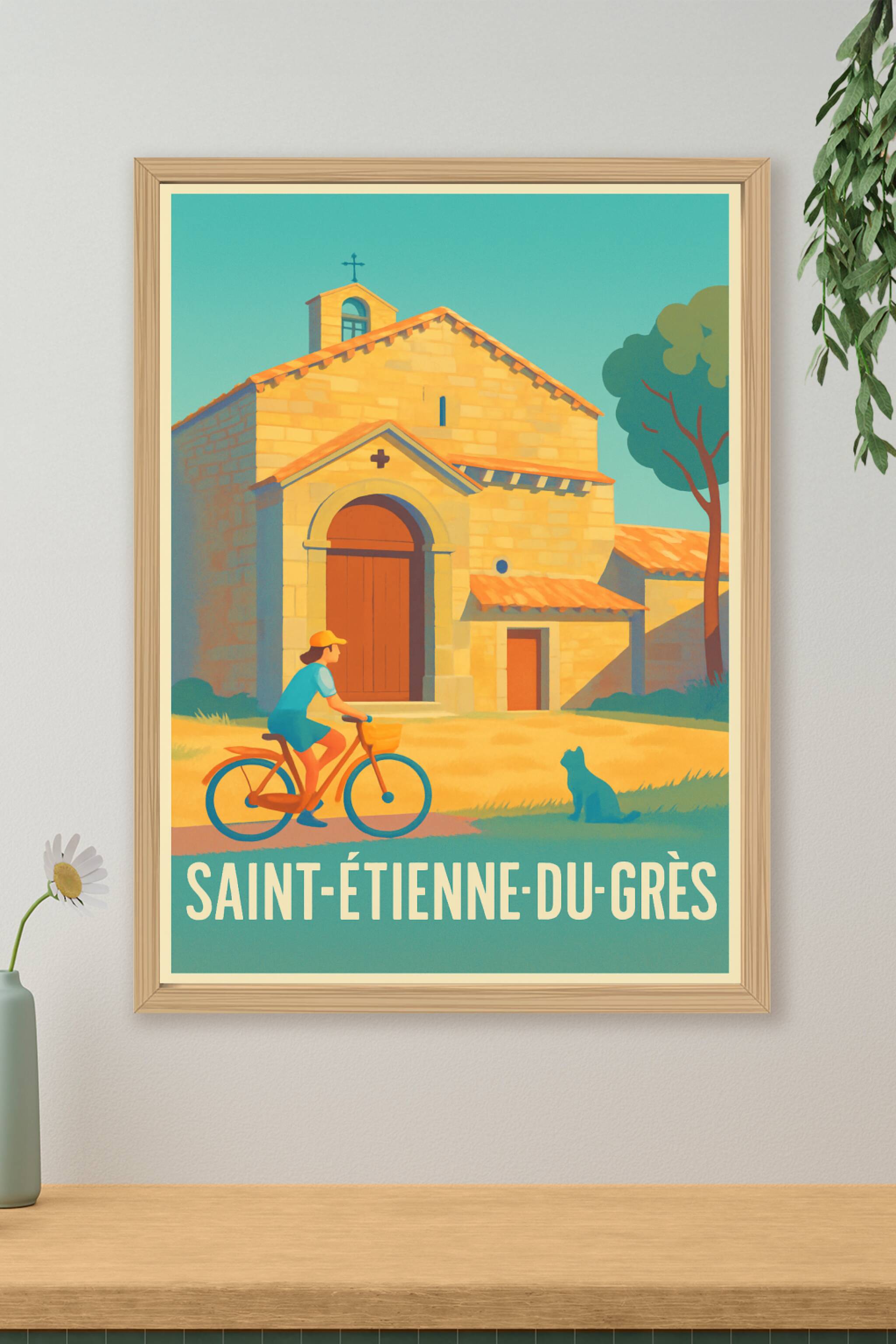 Découvrez l'ambiance paisible et authentique de Saint-Étienne-du-Grès avec cette affiche illustrée aux couleurs douces et chaleureuses. Le poster m...