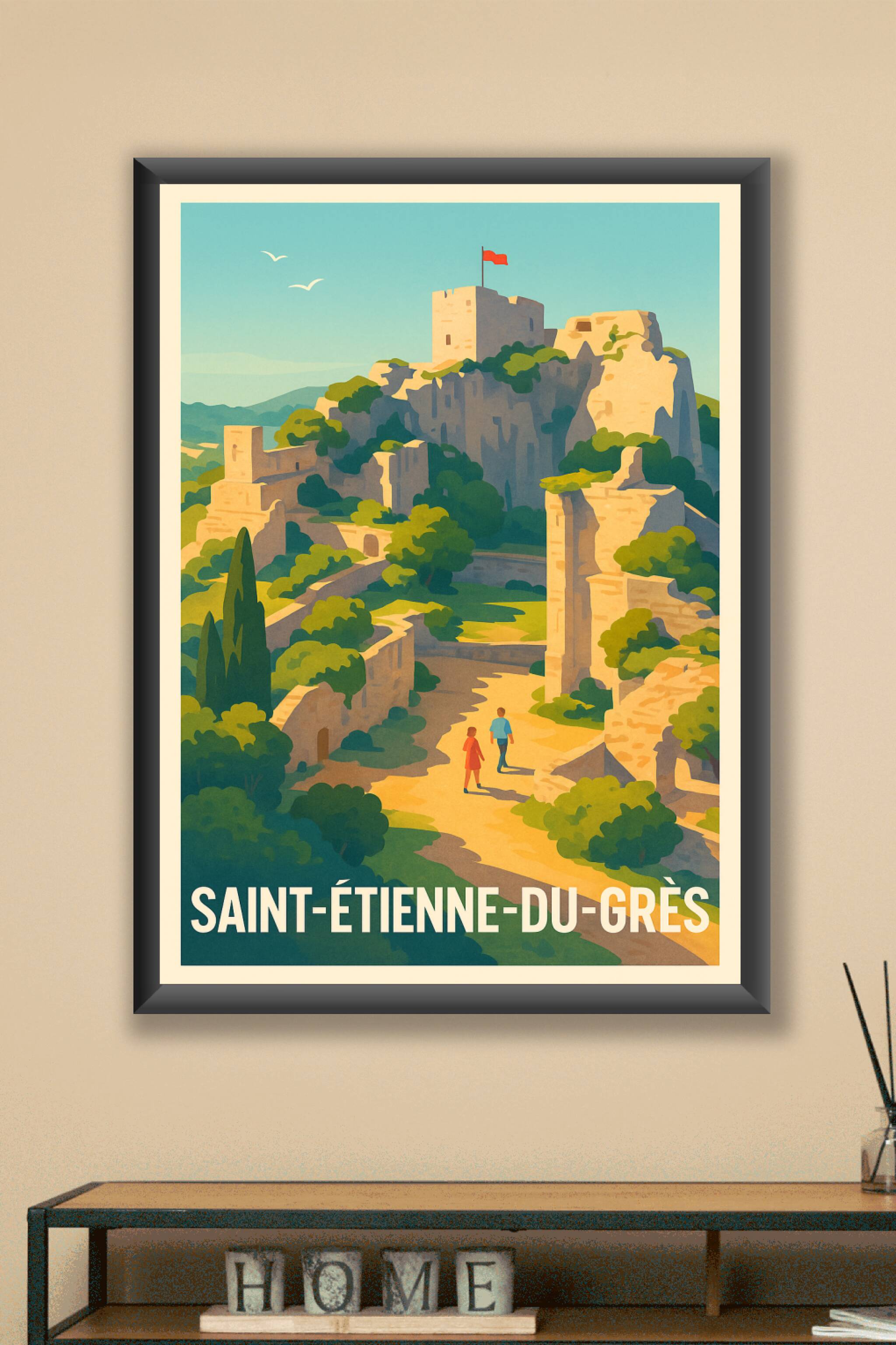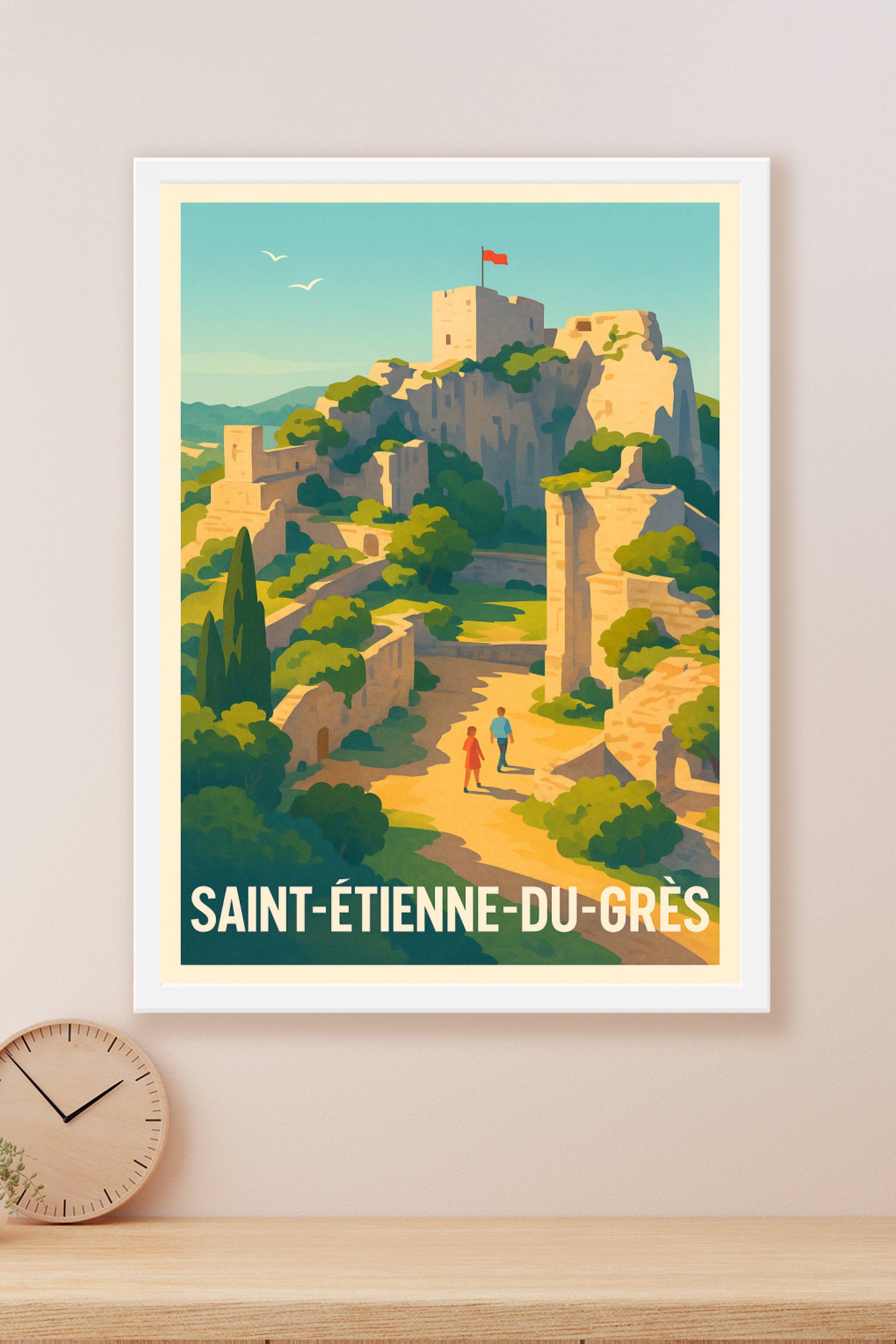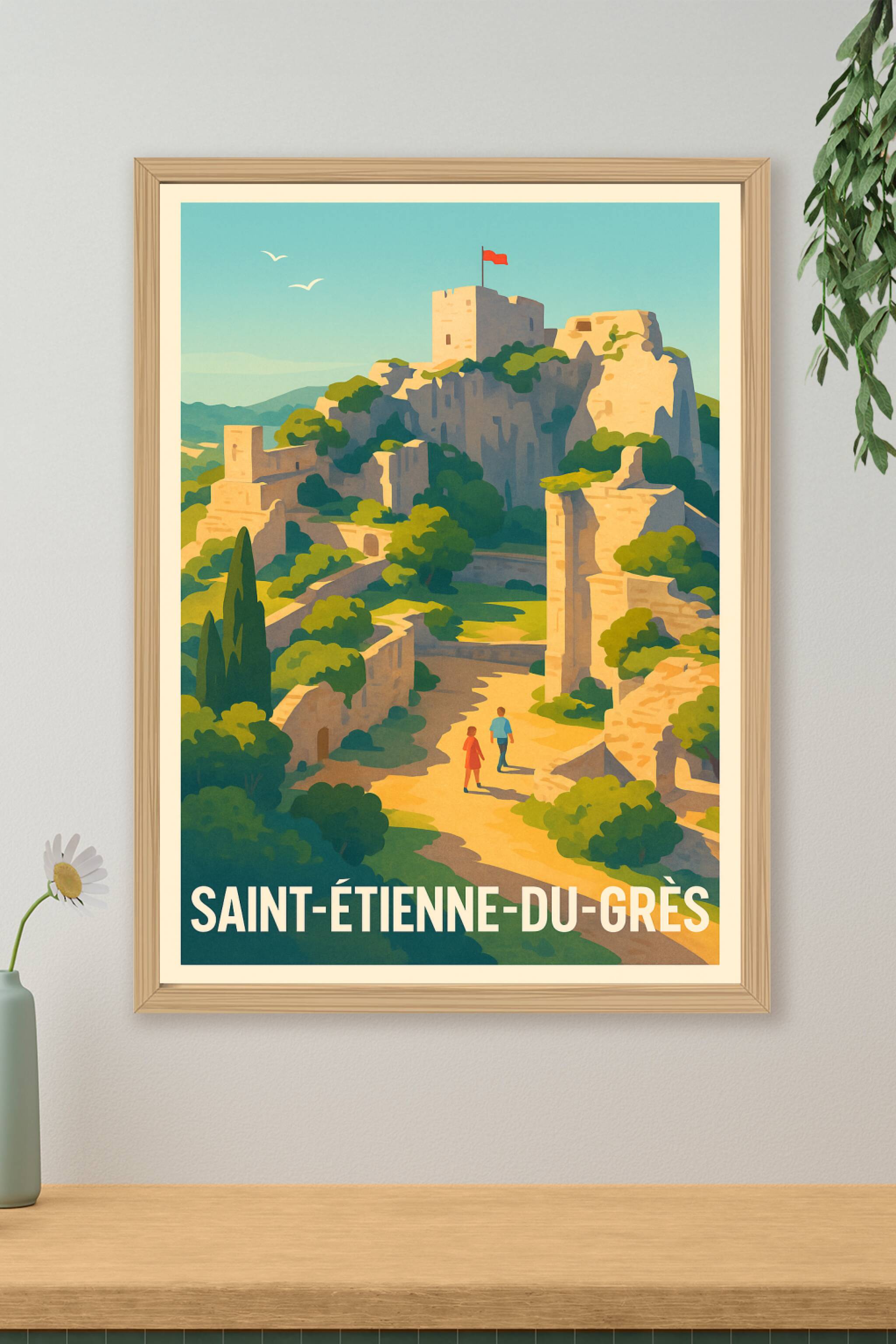 Découvrez l'atmosphère paisible et pittoresque de Saint-Étienne-du-Grès avec cette affiche illustrée représentant les ruines emblématiques baignées...