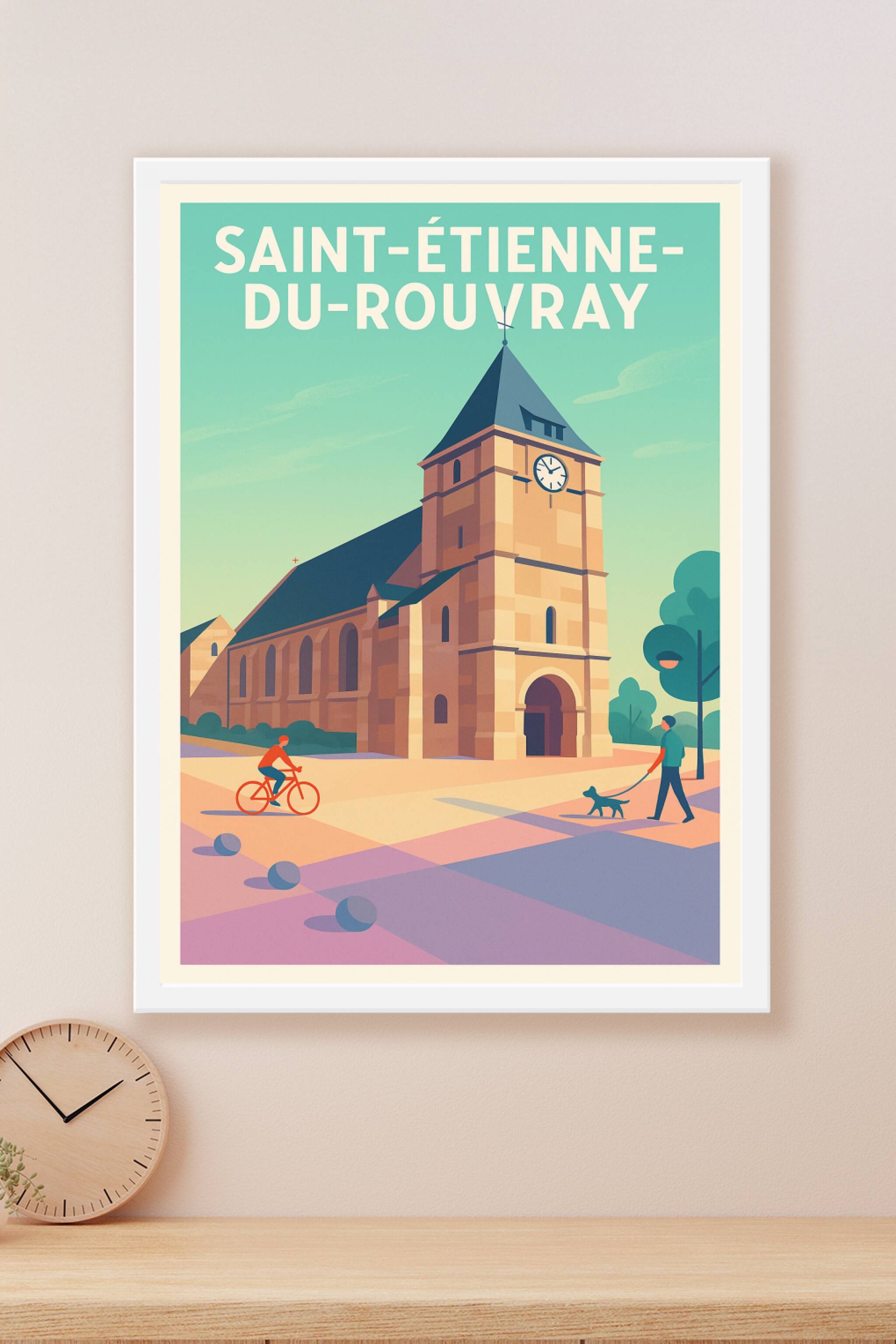 Découvrez cette affiche au style moderne mettant en lumière la silhouette emblématique de l'église de Saint-Étienne-du-Rouvray. Cette représentatio...