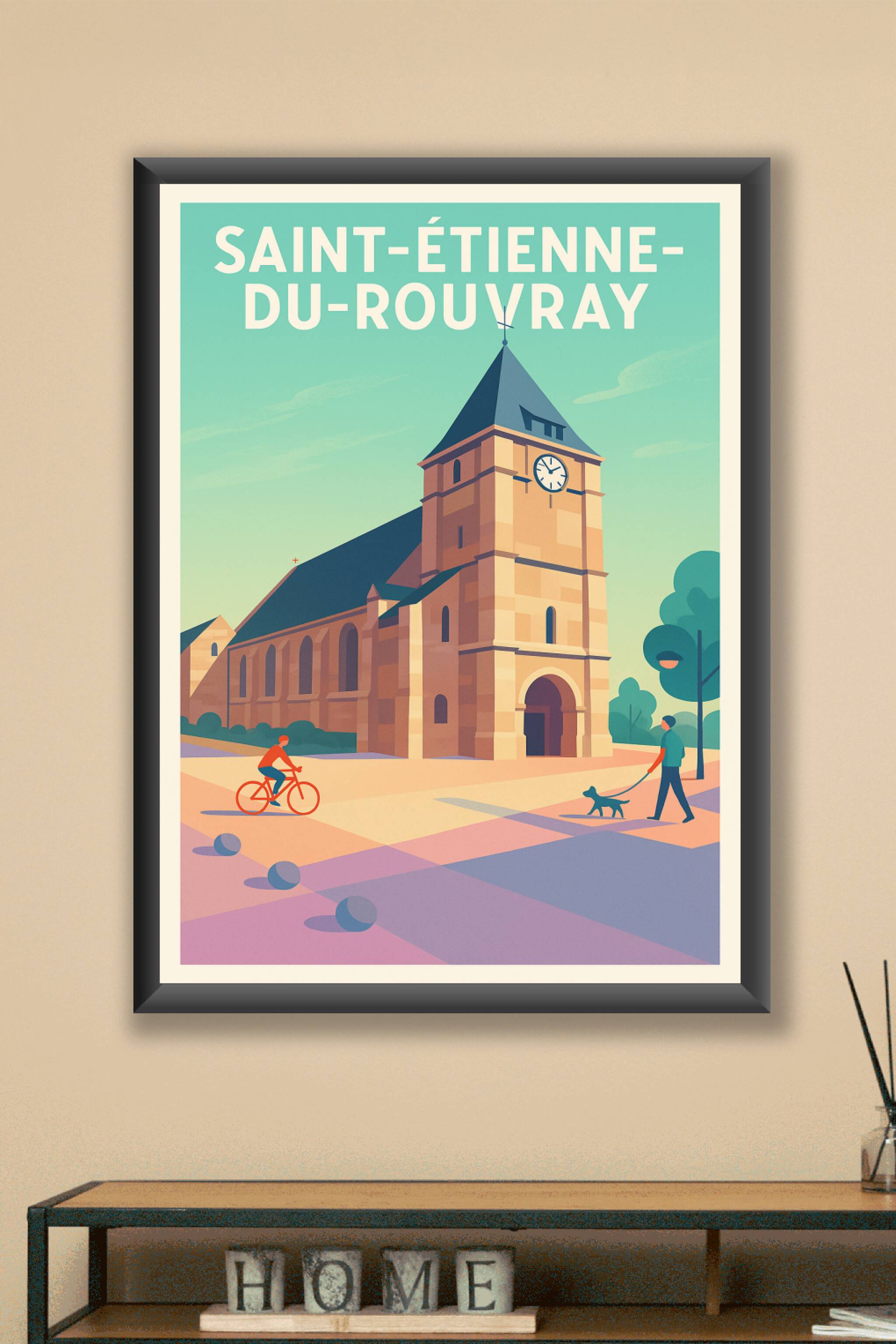 Découvrez cette affiche au style moderne mettant en lumière la silhouette emblématique de l'église de Saint-Étienne-du-Rouvray. Cette représentation épurée capture l'essence tranquille d'une ville où histoire et vie quotidienne s'entrelacent harmonieusement. Ce poster est un véritable hommage à l'architecture locale, idéale pour apporter une touche culturelle et lumineuse à votre décoration intérieure. Imprimée en tirage "Fine Art" sur papier 305g coton de haute qualité, cette affiche vous garantit une finesse des couleurs et une durabilité exceptionnelles. Disponible en formats A1 à A4, avec ou sans cadre, elle saura sublimer votre espace ou faire un cadeau unique aux passionnés de patrimoine français.