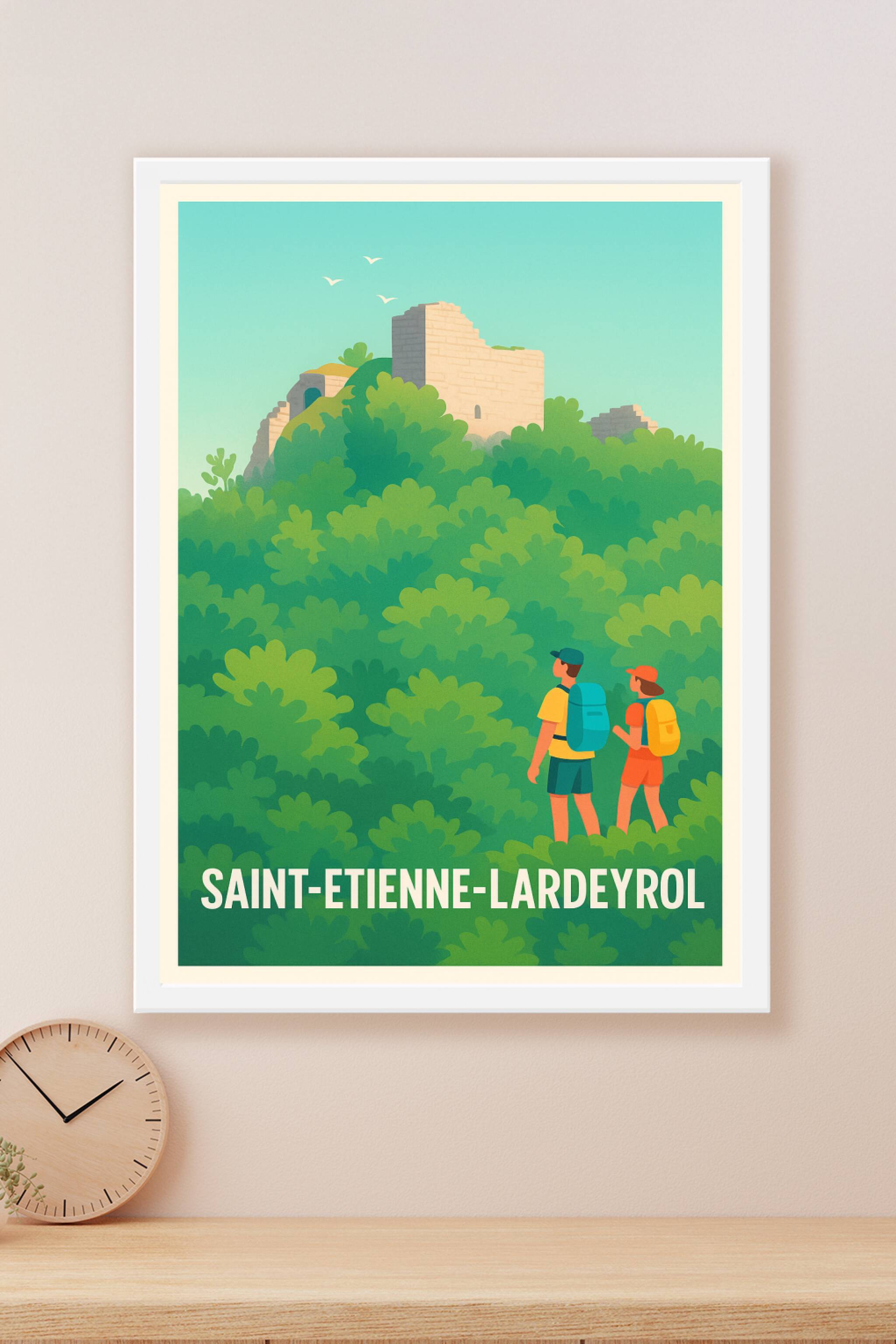 Découvrez la beauté préservée de Saint-Étienne-Lardeyrol avec ce poster illustré mettant en scène une randonnée au cœur d'une végétation luxuriante...