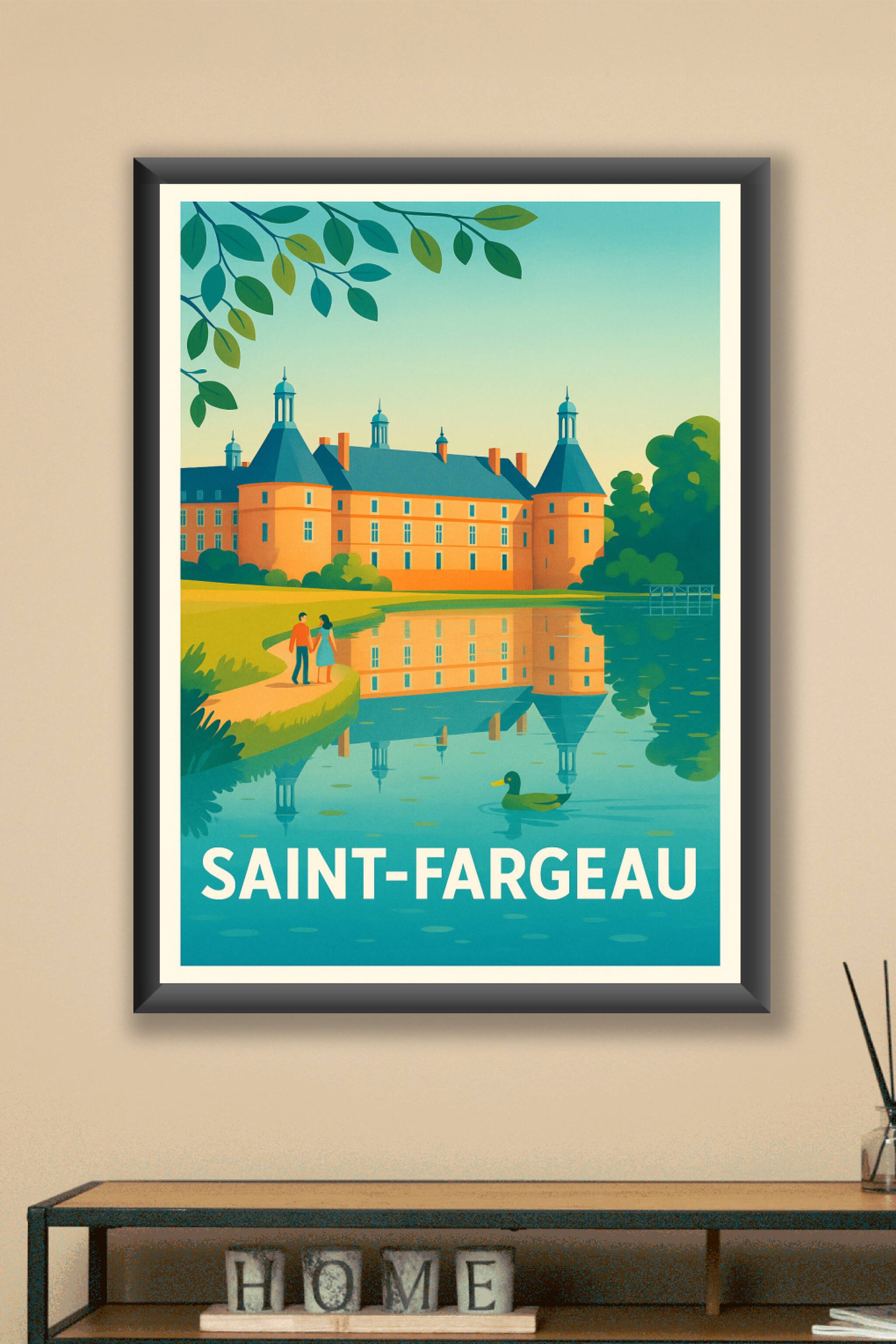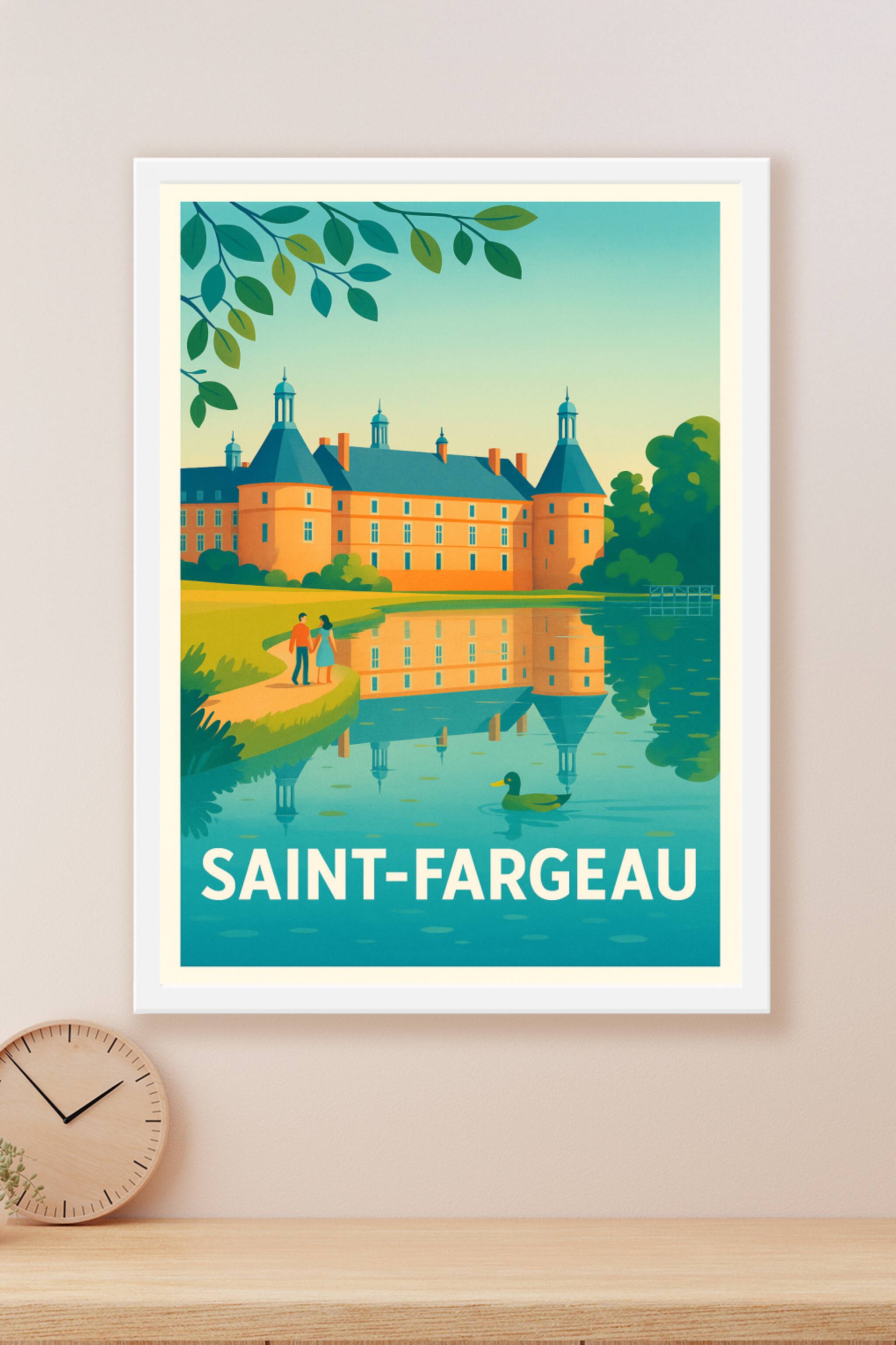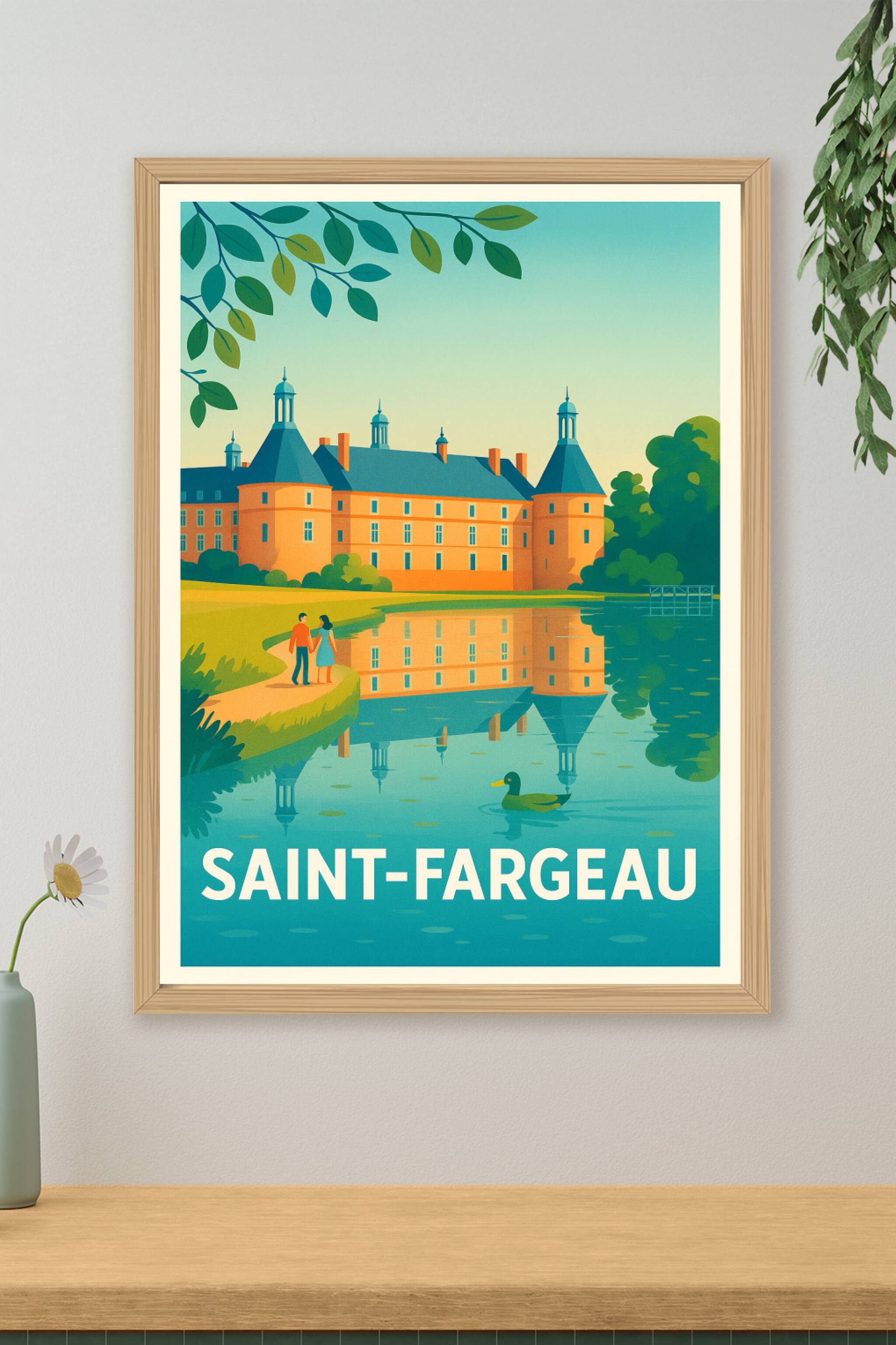 Découvrez le charme bucolique de Saint-Fargeau avec cette affiche illustrée mettant en scène son majestueux château et son reflet paisible sur l'ea...