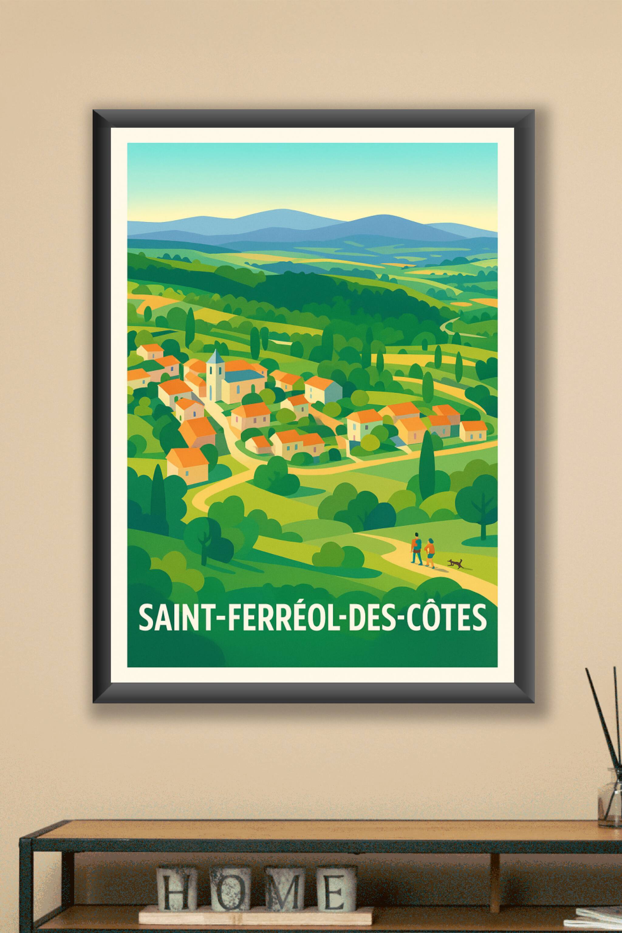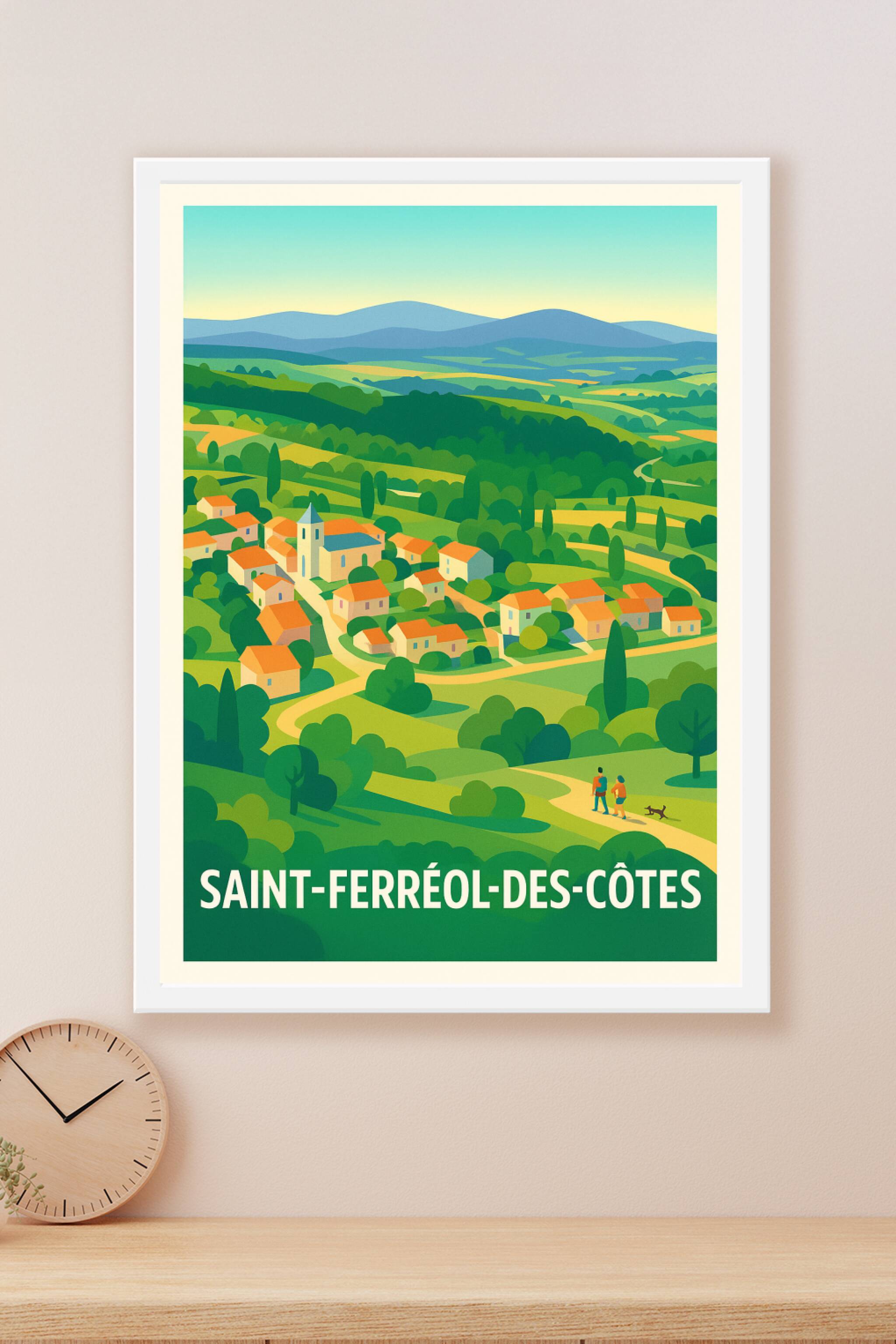 Découvrez la douceur de vivre à Saint-Ferréol-des-Côtes avec cette affiche illustrée représentant un charmant village au cœur d'un paysage vallonné...