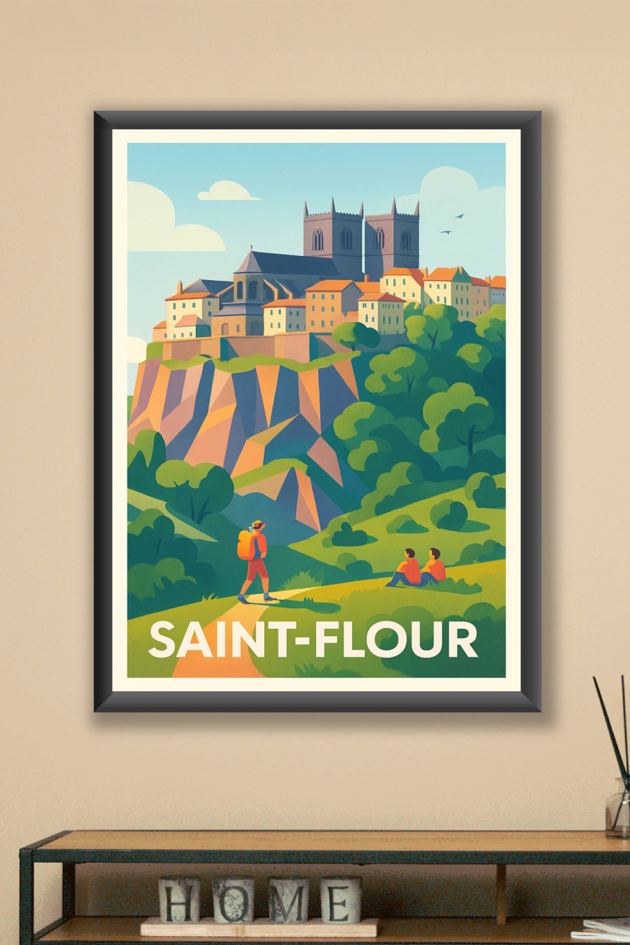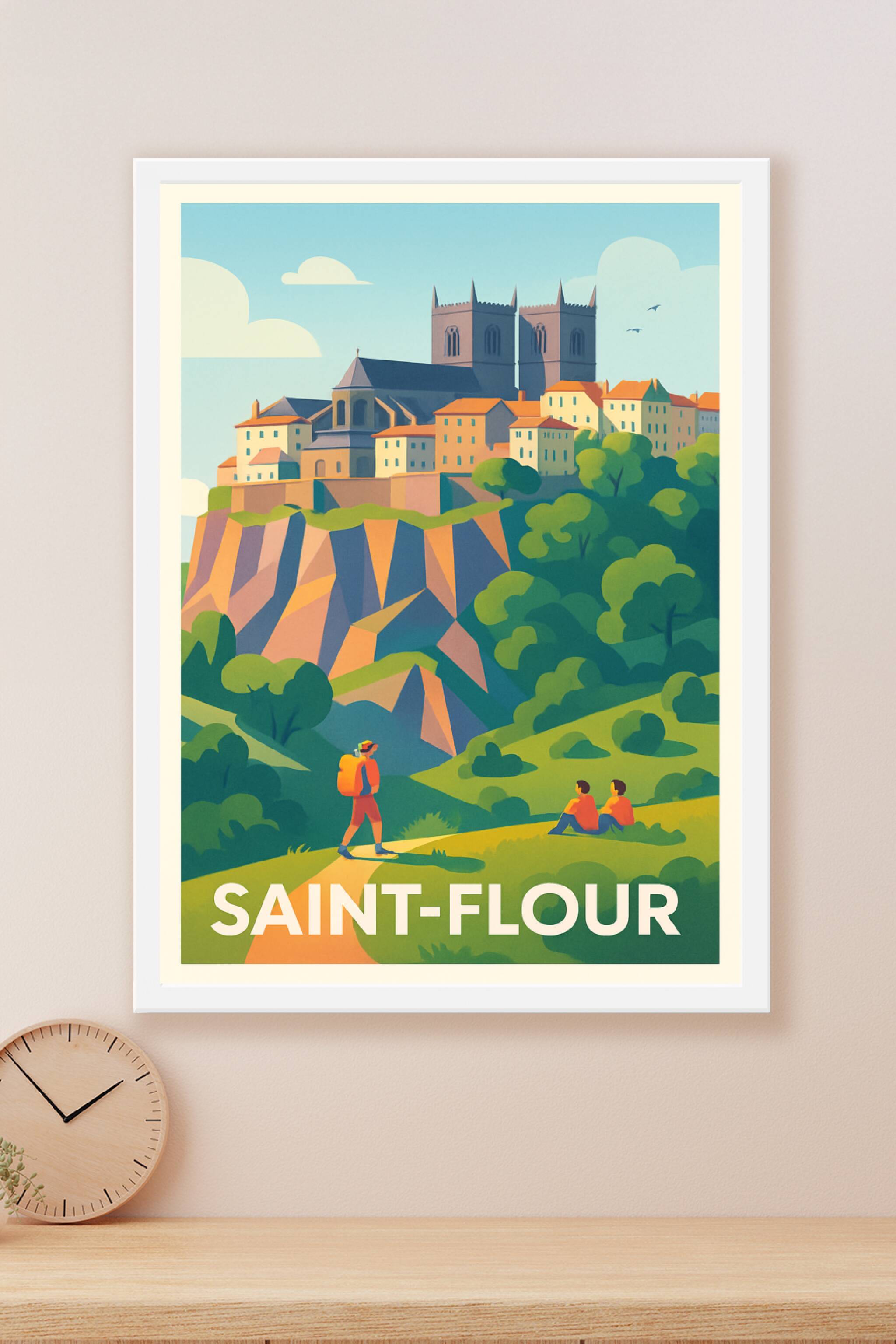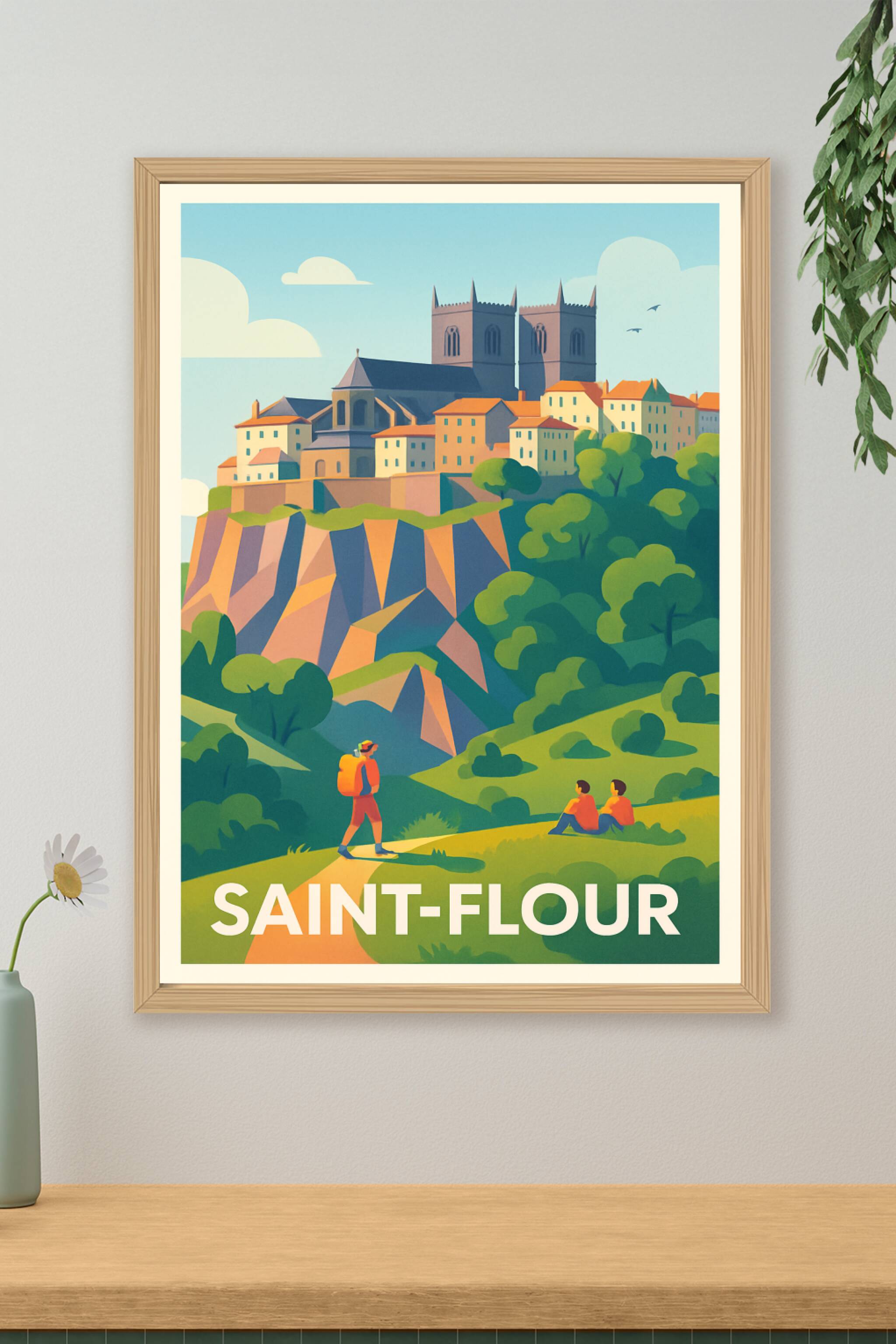 Découvrez la cité médiévale de Saint-Flour à travers cette affiche illustrée qui capture l'harmonie entre son architecture imposante et les paysage...