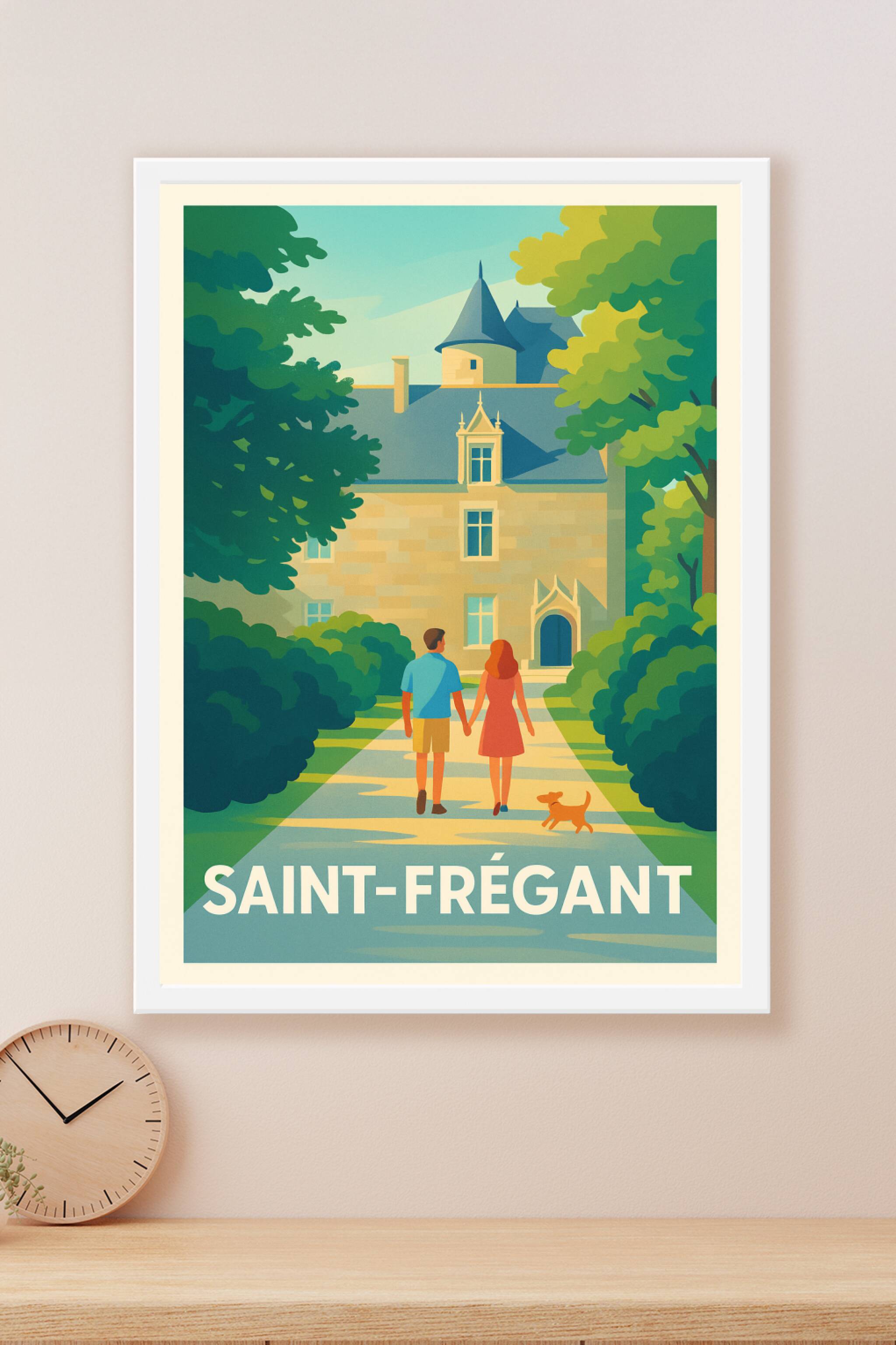 Découvrez l'élégance paisible de Saint-Frégant avec cette affiche au style vintage et coloré, illustrant un couple flânant main dans la main vers u...
