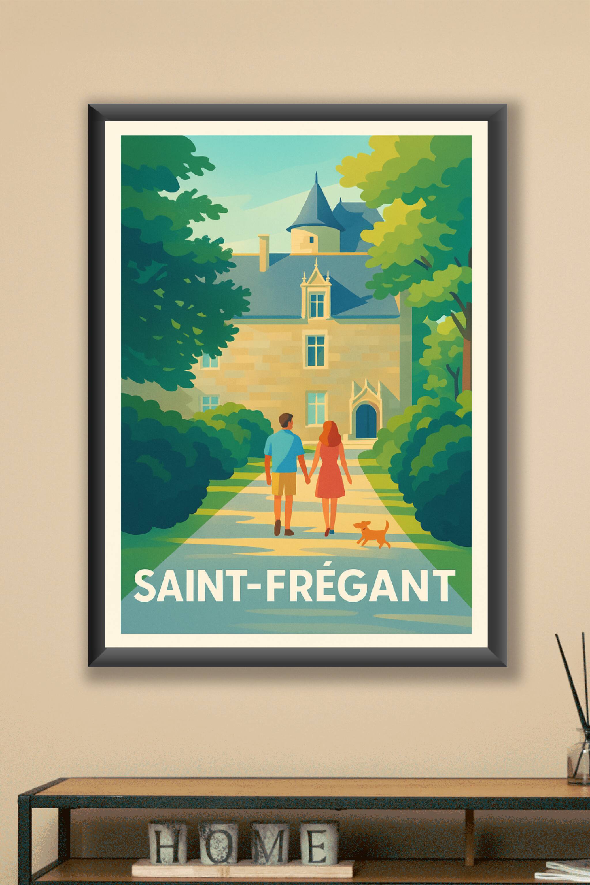 Découvrez l'élégance paisible de Saint-Frégant avec cette affiche au style vintage et coloré, illustrant un couple flânant main dans la main vers un charmant château entouré de verdure luxuriante. Ce poster est parfait pour apporter une touche de sérénité et d'authenticité à votre décoration intérieure.Ce tirage 'Fine Art' est réalisé sur un papier 305g coton de haute qualité pour garantir des couleurs éclatantes et une durabilité exceptionnelle. Disponible en formats A1 à A4, avec ou sans cadre, cette affiche s'adapte parfaitement à tous les espaces, de votre salon à votre bureau. Profitez d'une impression premium 100% fabriquée en France pour un souvenir élégant et raffiné de Saint-Frégant.